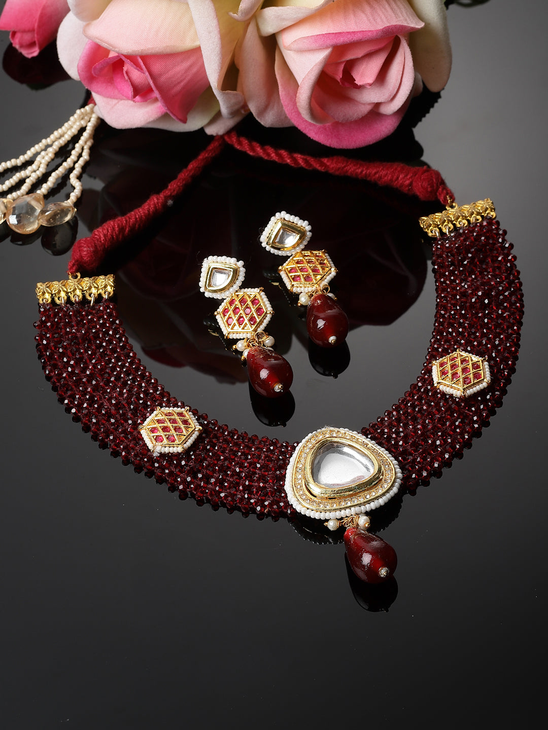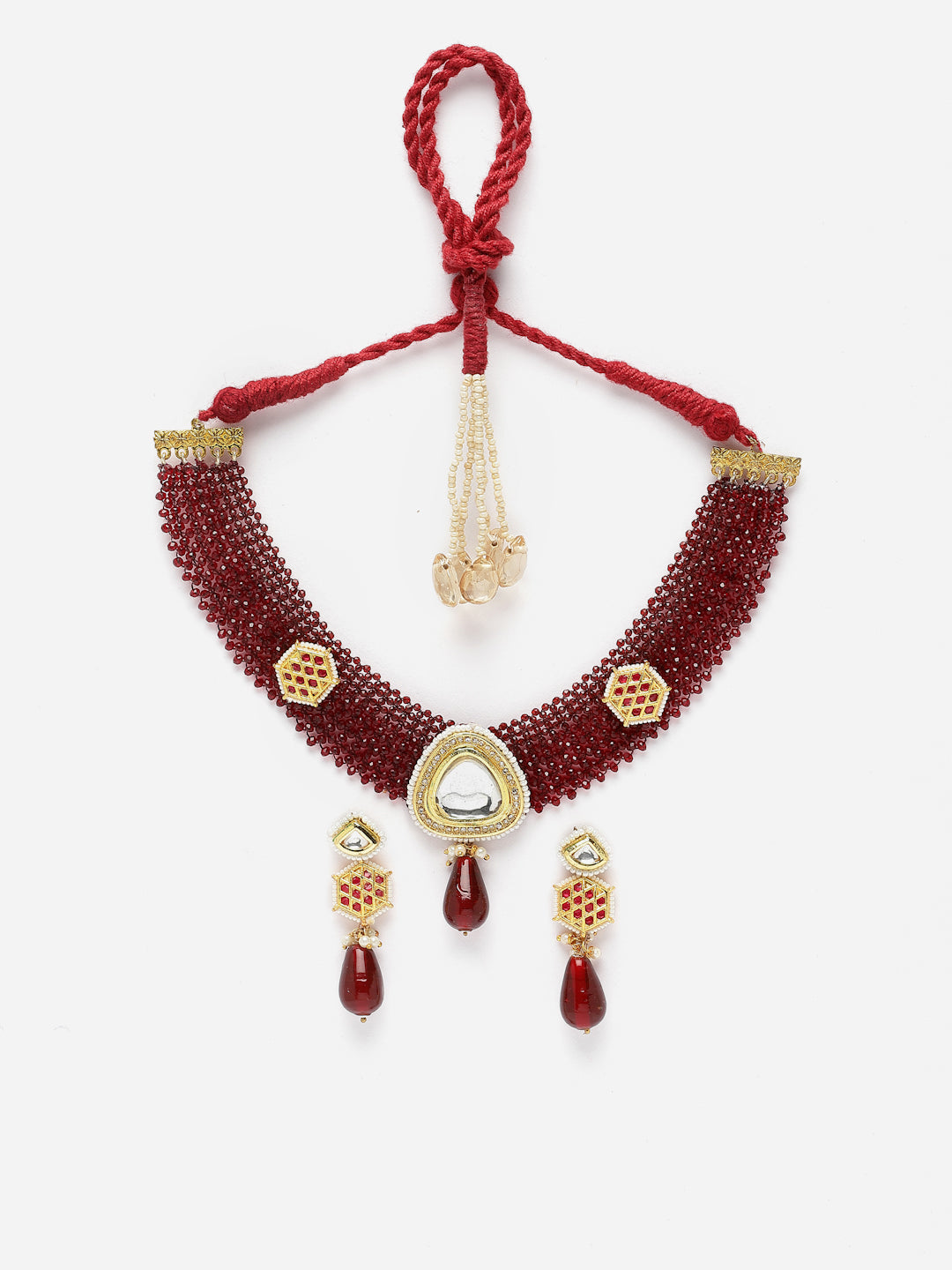 Red Pearl Hand Weaved String In Gold And Hand Crafted Meenakari Pcs Highlighted With Pearls; Category Of Jewellery Is Jewellery Set; Sub Category Is Necklace With Earring; Ideal For Women; Color Is Maroon, Red, Gold, White, Cream; Gemstones Used - Kundan, American Diamonds, Pearls, Natural Stones; Plating Is Gold-Plated; Base Metal Is Alloy; Other Material Used - Adjustable Dori; Size Is Freesize; Adjustable - Yes; Weight Is 63 Gms; Mesaurements - Length Of Earring= 5.5 Cm; Width Of Earring =2.5 Cm; Length Of Necklace =43.6 Cm; Width Of Necklace = 6 Cm; Adjustable - Yes; Content 1 Necklace 1 Pair Earring
