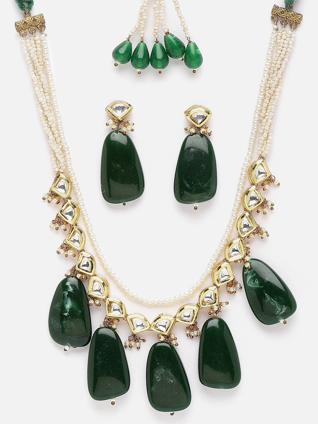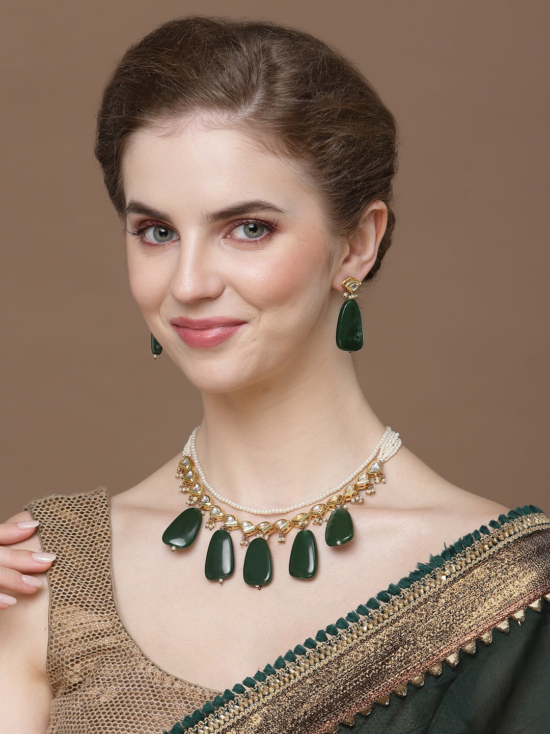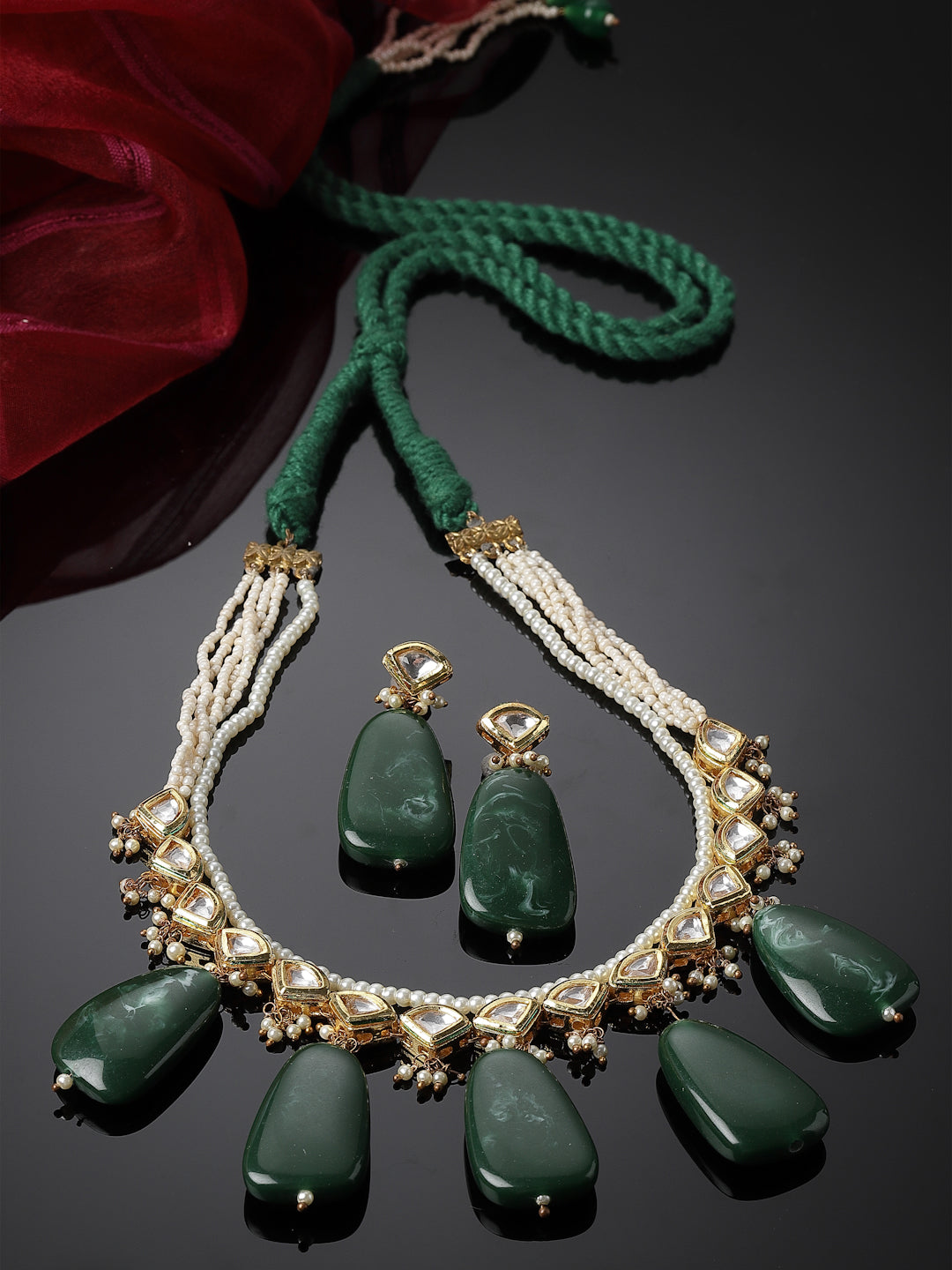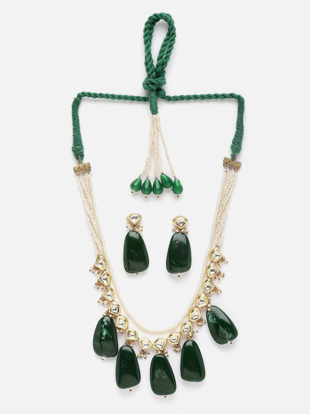 Green Meenakari And Big Emerld Stone In Kundan Neck Pc; Category Of Jewellery Is Jewellery Set; Sub Category Is Necklace With Earring; Ideal For Women; Color Is Green, Gold, White, Cream; Gemstones Used - Kundan, Pearls, Natural Stones, Raisin; Plating Is Gold-Plated; Base Metal Is Alloy; Other Material Used - Adjustable Dori; Size Is Freesize; Adjustable - Yes; Weight Is 79 Gms; Mesaurements - Length Of Earring= 5.5 Cm; Width Of Earring =2 Cm; Length Of Necklace =66 Cm; Width Of Necklace = 5 Cm; Adjustable - Yes; Content 1 Necklace 1 Pair Earring