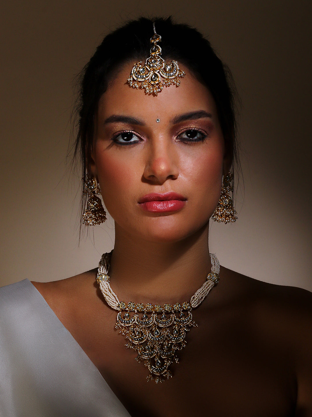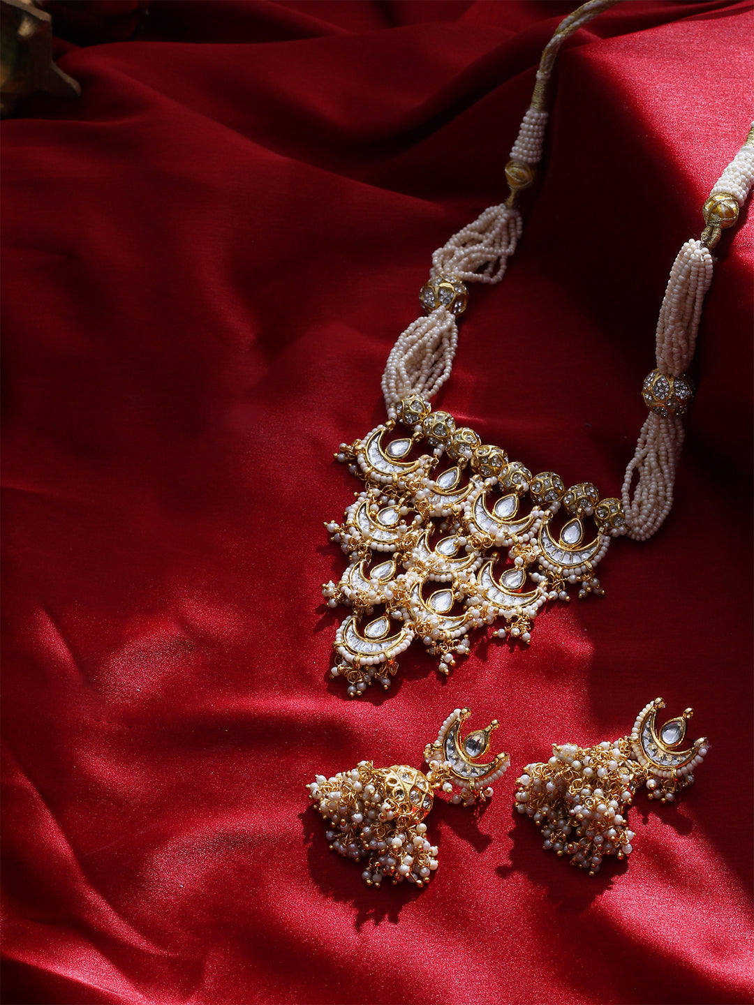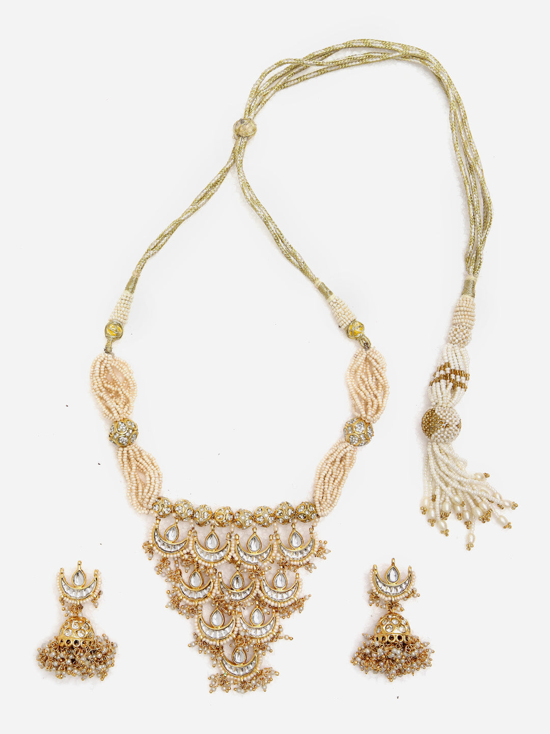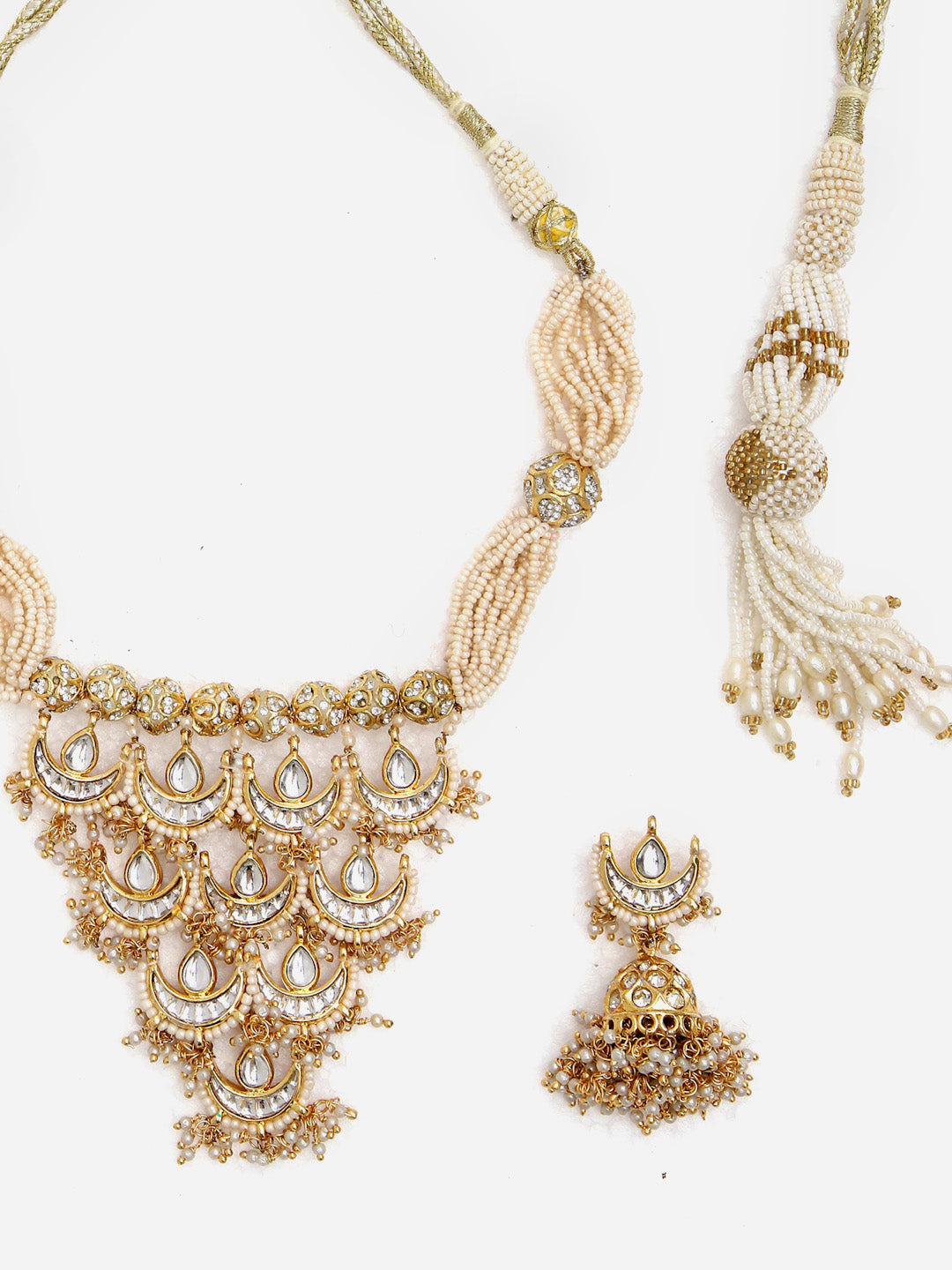 White And Gold Kundan With Classy Chand Kundan And Exclusive Handmade Dori Makes This Pc Super Classy And Stylish Rajasthani Hasli Haar; Category Of Jewellery Is Jewellery Set; Sub Category Is Necklace With Earring; Ideal For Women; Color Is Cream, Gold, White; Gemstones Used - Kundan, Pearls, American Diamonds; Plating Is Gold-Plated; Base Metal Is Alloy; Other Material Used - Adjustable Dori; Size Is Freesize; Adjustable - Yes ; Weight Is 117 Gms; Mesaurements - Length Of Earring= 6 Cm; Width Of Earring =3.5 Cm; Length Of Necklace =38 Cm; Width Of Necklace = 9 Cm; Adjustable - Yes ; Content 1 Necklace 1 Pair Earring