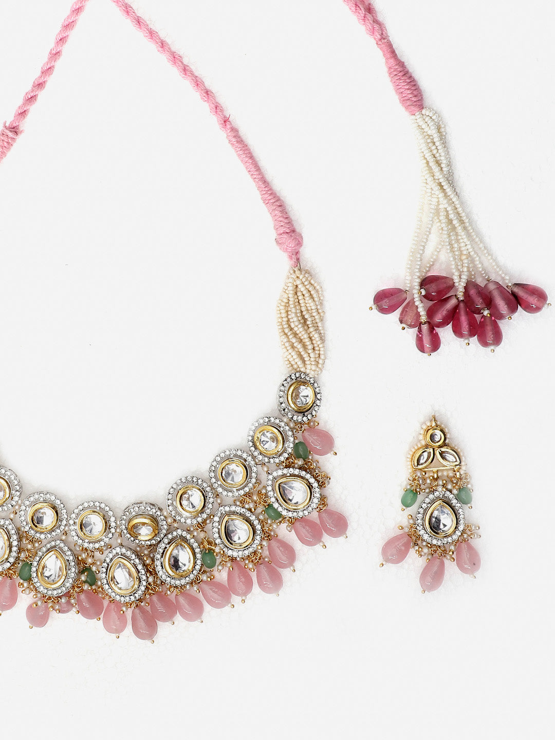 Artificial Diamond Look Neck Pc With Elegance Of Pearl Green Mint And Barbie Pink Shades; Category Of Jewellery Is Jewellery Set; Sub Category Is Necklace With Earring; Ideal For Women; Color Is Pink, Green, Maroon, Cream, Gold, White; Gemstones Used - Kundan, American Diamonds, Pearls, Natural Stones; Plating Is Gold-Plated; Base Metal Is Alloy; Other Material Used - Adjustable Dori; Size Is Freesize; Adjustable - Yes ; Weight Is 122 Gms; Mesaurements - Length Of Earring= 7 Cm; Width Of Earring =3 Cm; Length Of Necklace =51 Cm; Width Of Necklace = 3.9 Cm; Adjustable - Yes ; Content 1 Necklace 1 Pair Earring