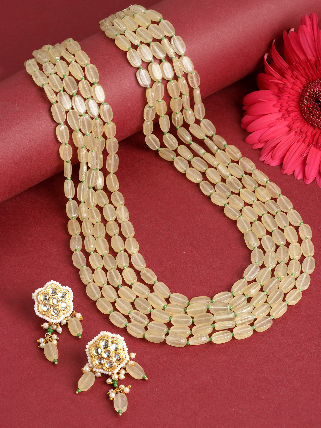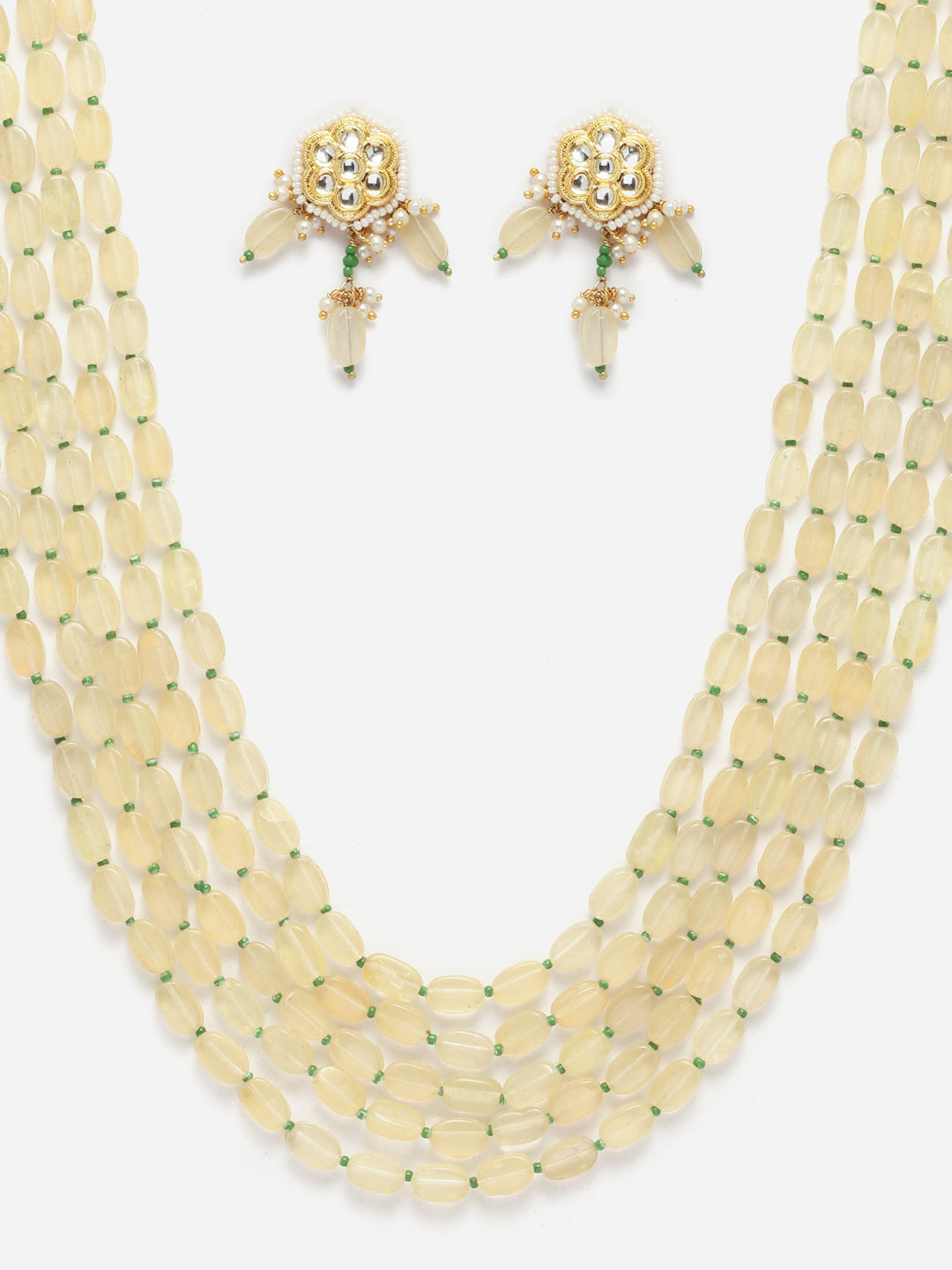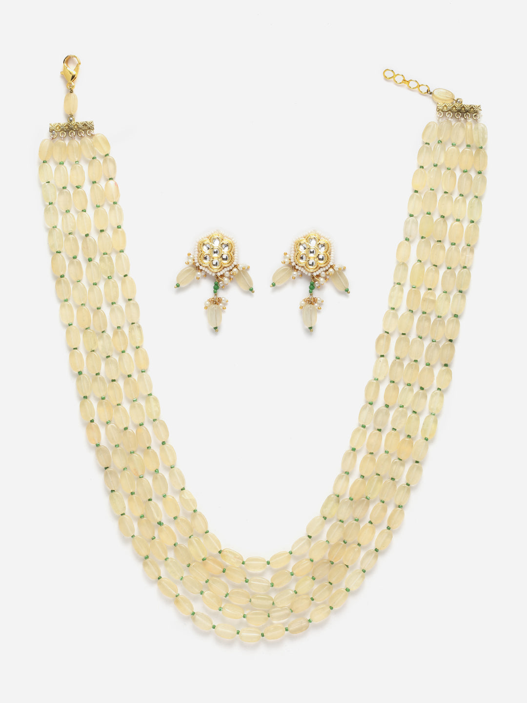 String Of Color Yellow And Hiont Of Green With Small Kundan Earrings Is The Elegant And Classic Pc Of Jewel.; Category Of Jewellery Is Jewellery Set; Sub Category Is Necklace With Earring; Ideal For Women; Color Is Green, Yellow, Cream, Gold, White; Gemstones Used - Kundan, Pearls, Natural Stones; Plating Is Gold-Plated; Base Metal Is Alloy; Other Material Used - Adjustable Chain; Size Is Freesize; Adjustable - Yes; Weight Is 154 Gms; Mesaurements - Length Of Earring= 3.7 Cm; Width Of Earring =2.4 Cm; Length Of Necklace =60 Cm; Width Of Necklace = 4 Cm; Adjustable - Yes; Content 1 Necklace And 1 Pair Earring