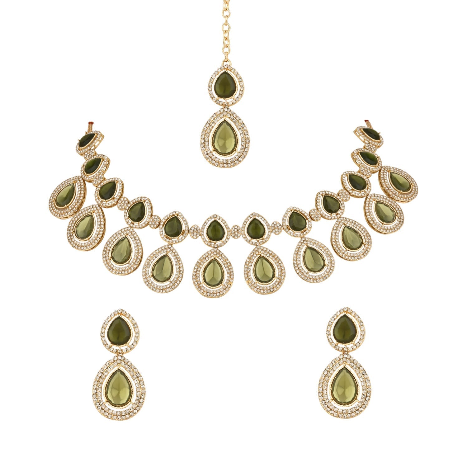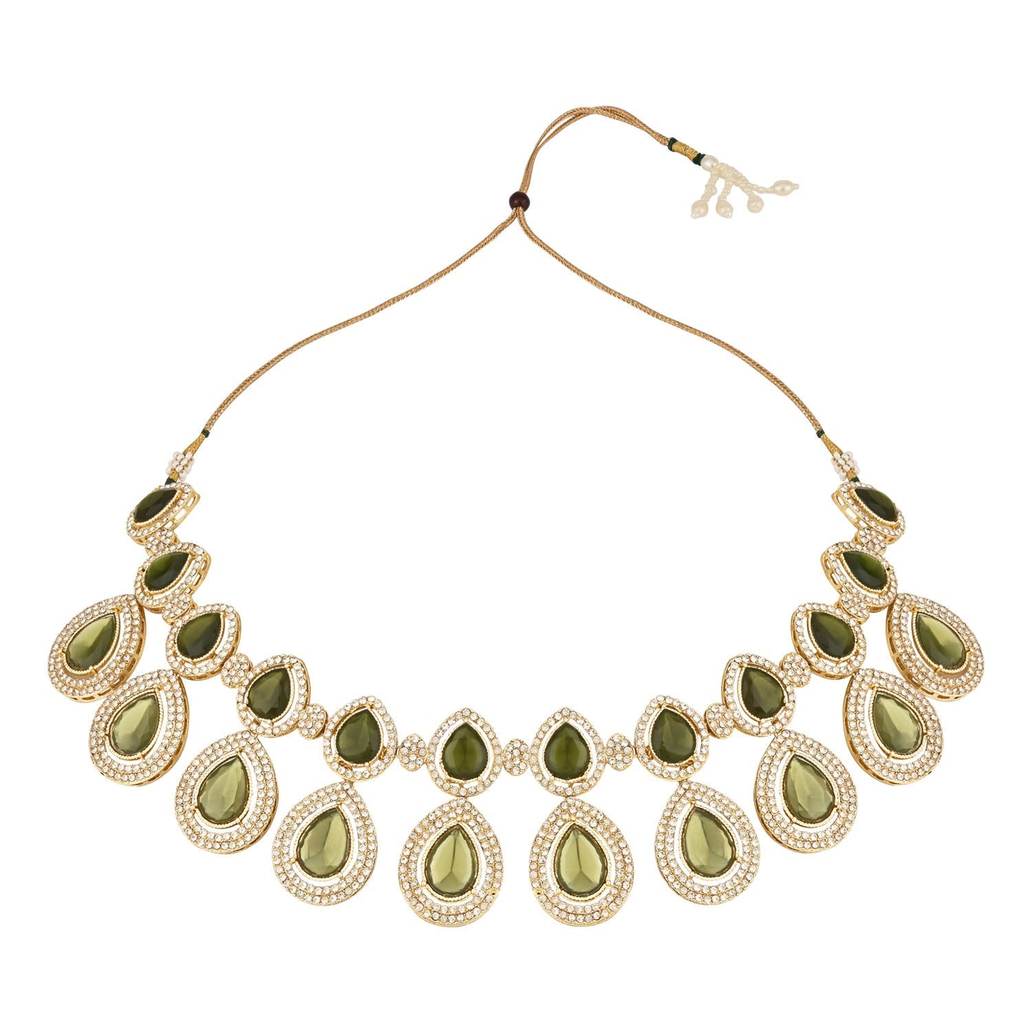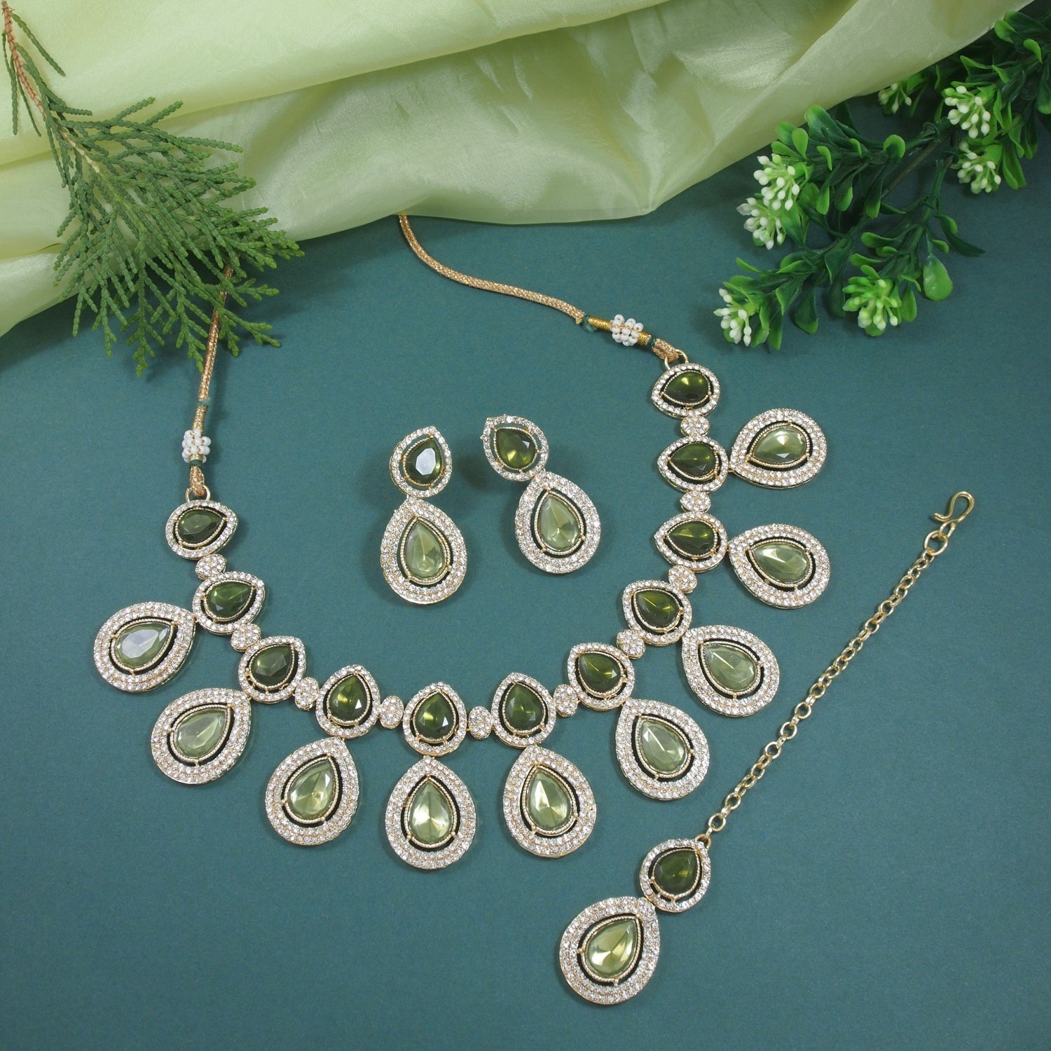 The gold-plated choker necklace set consists of a necklace, a pair of earrings, and a maang tikka. The necklace features kundan studded with pearl beaded in it, giving it an elegant and traditional look. The stones and pearls are set in a beautiful pattern, adding a touch of sophistication and grace to the necklace. The necklace is secured with drawstring closures, which make it easy to adjust the size to fit comfortably around the neck. This is an important feature, as it ensures that the necklace will be comfortable to wear for extended periods of time. The necklace is secured with drawstring closures, which make it easy to adjust the size to fit comfortably around the neck. This is an important feature, as it ensures that the necklace will be comfortable to wear for extended periods of time. The earrings and maang tikka are also adorned with stones and pearls, which match the pattern of the necklace. The earrings have a beautiful design, which makes them easy and comfortable to wear. The maang tikka is a traditional Indian hair accessory that can be worn with the necklace and earrings to complete the look.