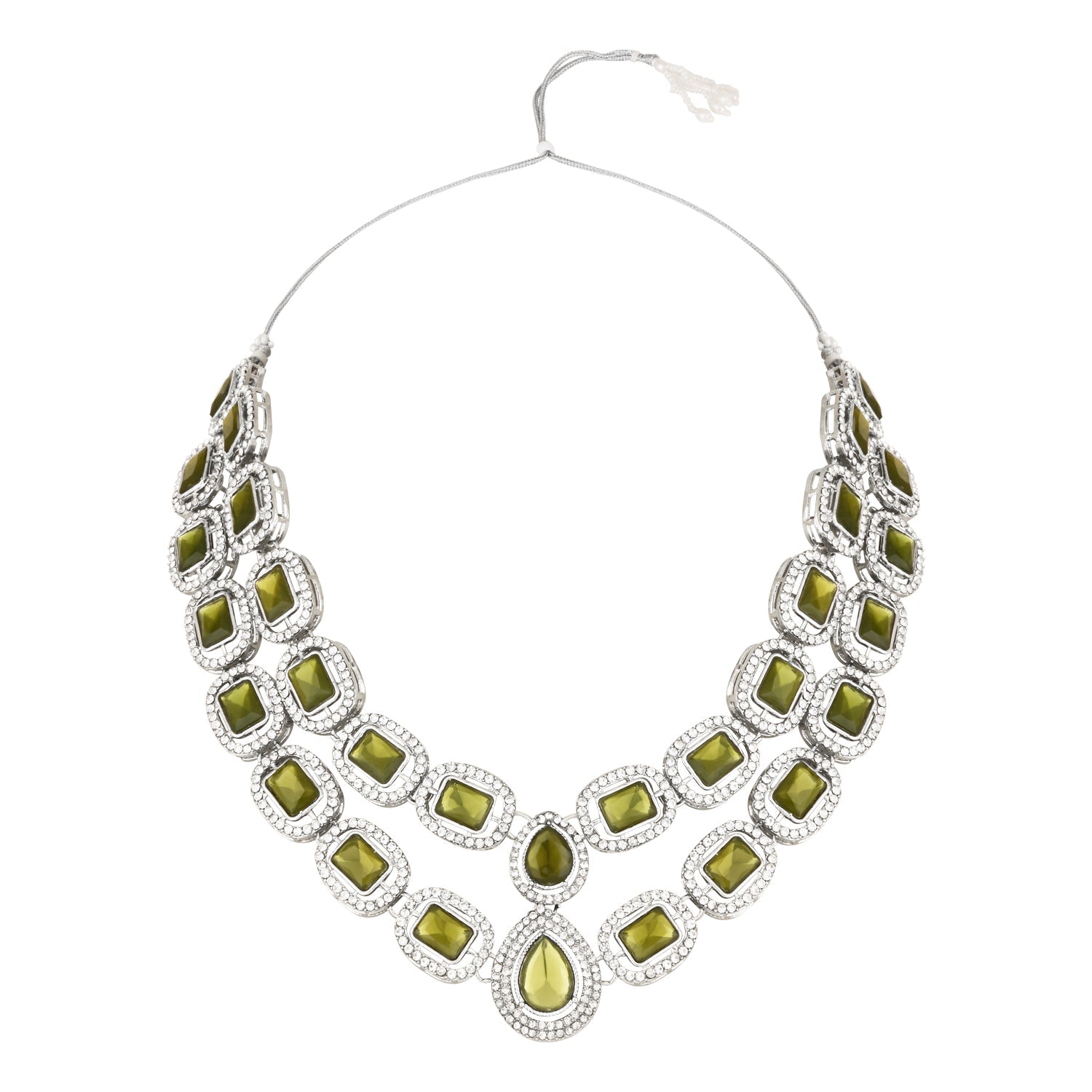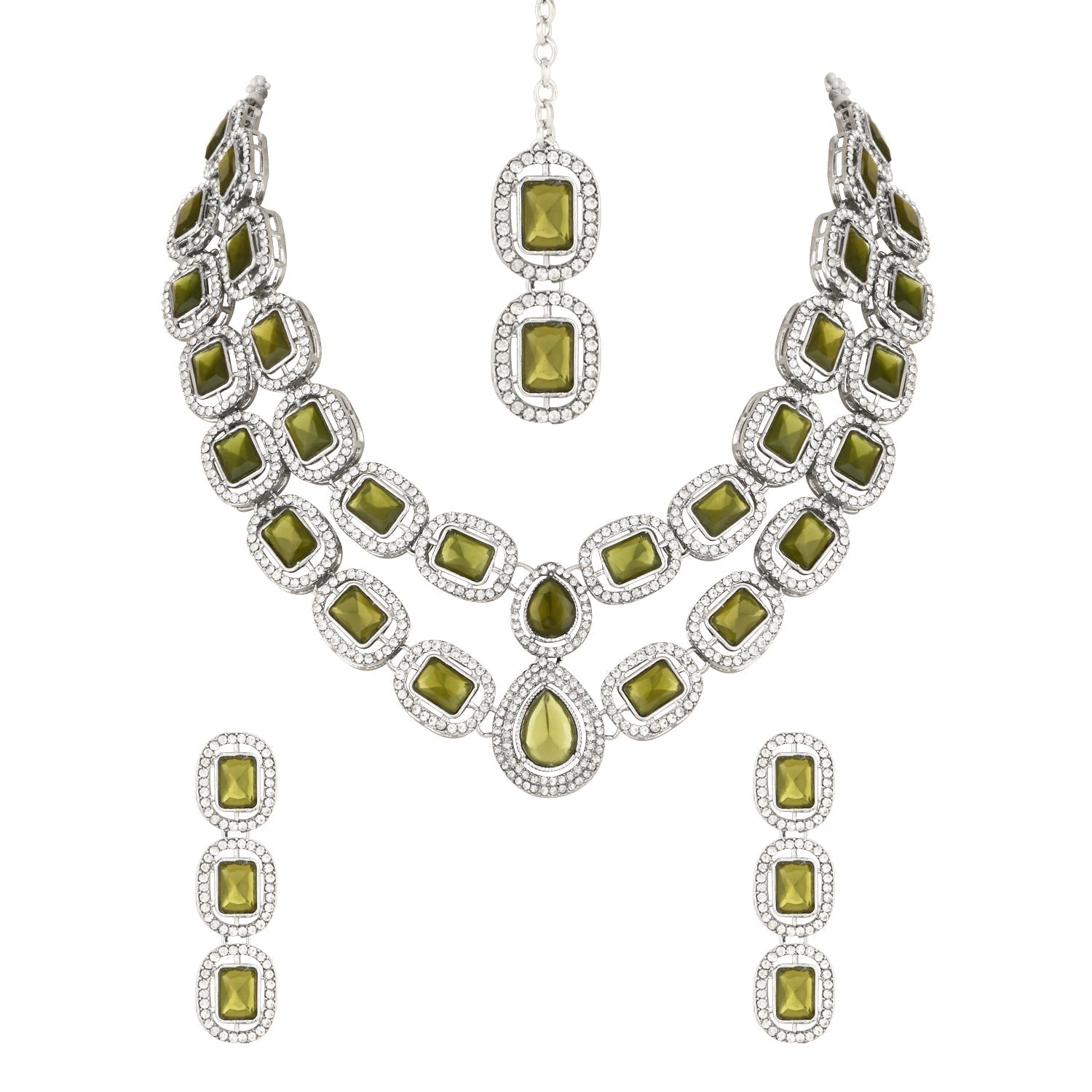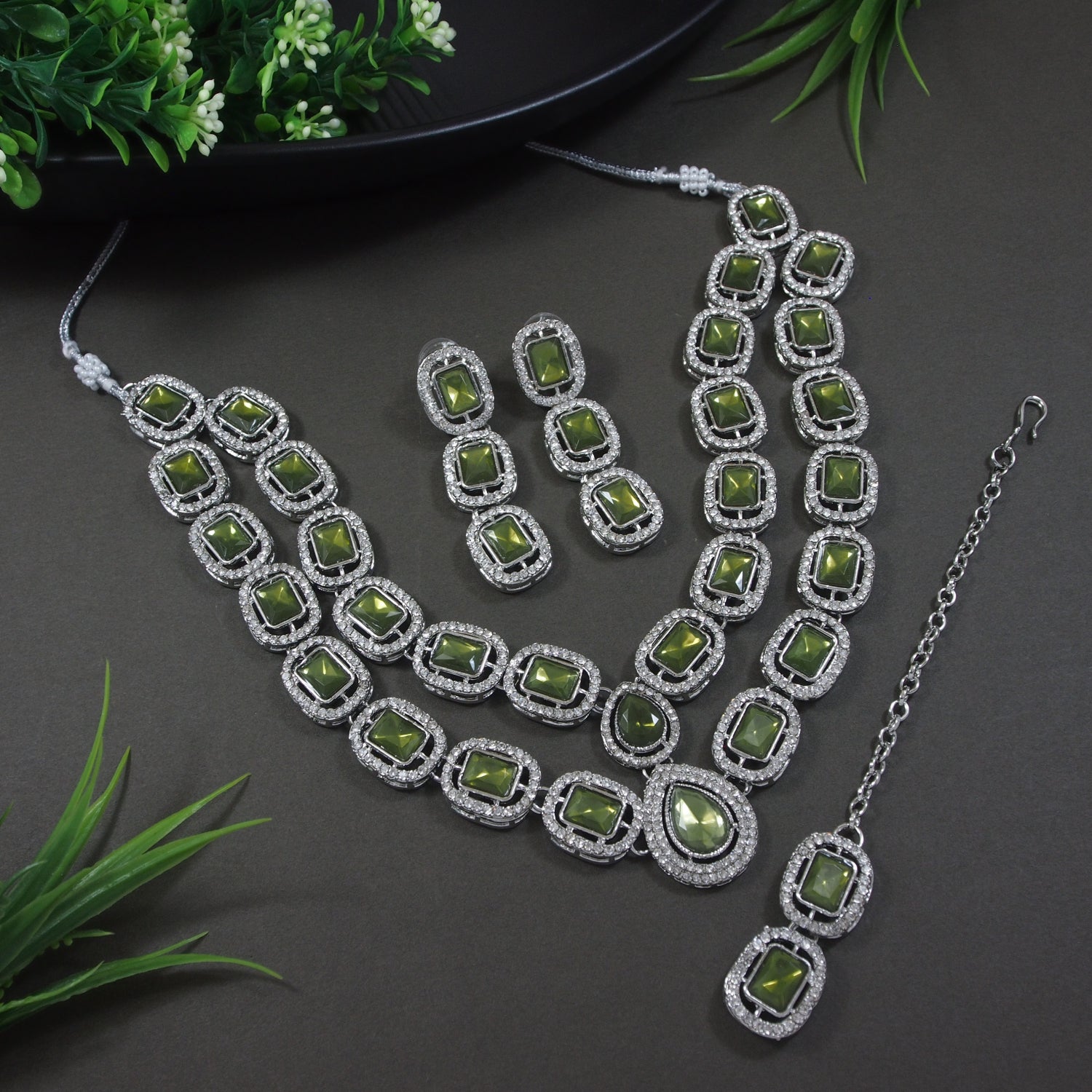 Enhance your traditional charm with the silver plated stone necklace set. This captivating jewelry set, which includes a necklace, matching earrings, and a maang tikka, exudes grace and elegance. Crafted with meticulous attention to detail, it features exquisite stone studded designs that shimmer and shine, making it a perfect choice for women and girls who appreciate classic Indian jewelry. Elevate your style and create a lasting impression with the necklace set, an ideal accompaniment to your ethnic ensembles.