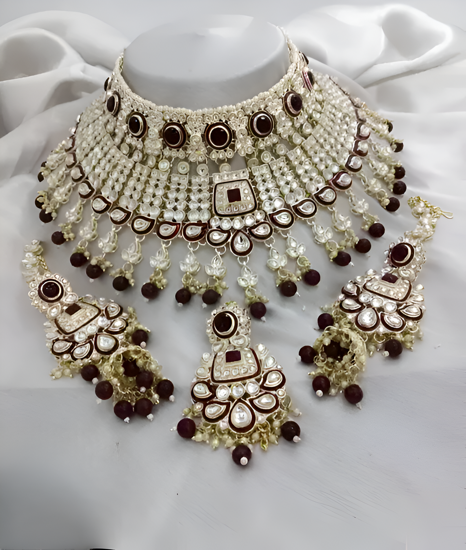 Each Pearl And Maroon Bead Dangle Captures And Reflects Light With Every Movement, Ensuring You Command Attention Whenever You Enter The Room. This Heirloom-Quality Jewelry Set Celebrates The Rich Heritage Of Indian Craftsmanship While Offering Contemporary Design Elements For The Modern Bride.