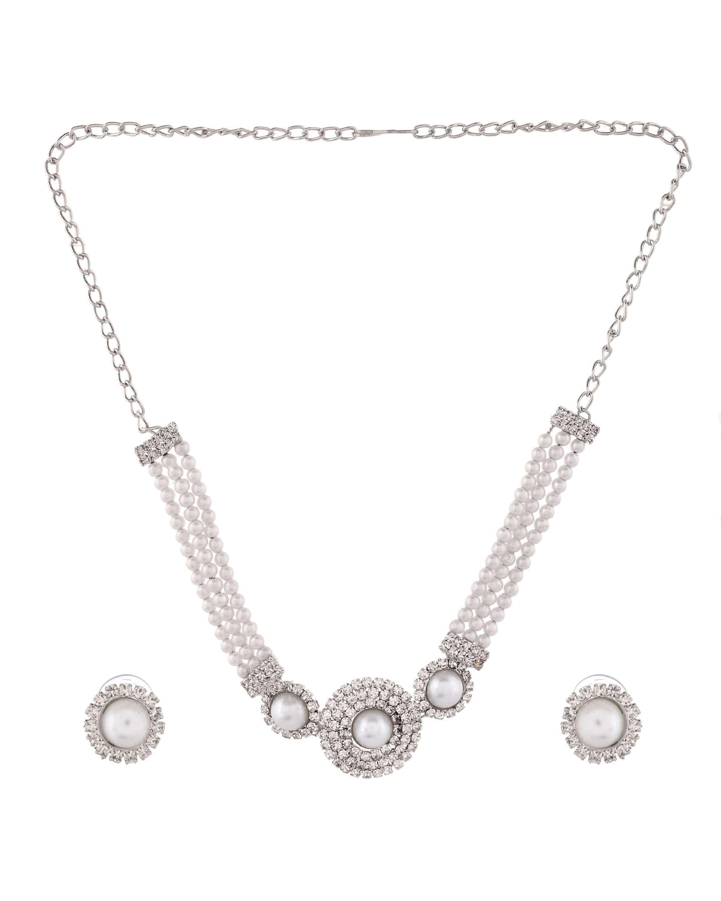 Add A Radiant Touch Of Elegance To Your Look With This Exquisitely Crafted Piece That Speaks Of Timeless Charm And Modern Sophistication. Featuring A Symmetrical Design With Concentric Circular Elements Encrusted In Dazzling Stones And Centered With Luminous Pearl-Like Beads, This Necklace Offers A Rich, Regal Feel. The Choker’S Triple-Strand Layout Of Miniature Pearls Enhances Its Grace, Perfectly Hugging The Neckline While Offering A Balanced Aesthetic. The Silver-Tone Plating Enhances Its Brilliance, Making It An Ideal Match For Cool-Toned Attire And Silver-Accented Ethnic Outfits. Whether You'Re Dressing For A Wedding, Engagement, Or Festive Celebration, This Accessory Elevates Your Ensemble Effortlessly. Its Adjustable Closure Ensures A Snug, Secure Fit, And The Lightweight Build Allows You To Wear It Comfortably For Extended Hours. This Piece Blends Traditional Inspiration With A Fresh Design Perspective To Create A Statement That'S Bold, Yet Gracefully Understated.