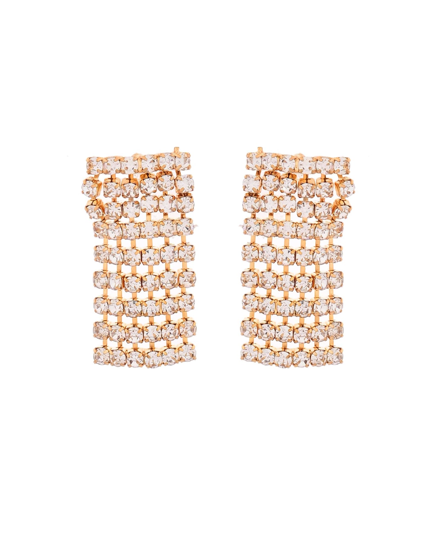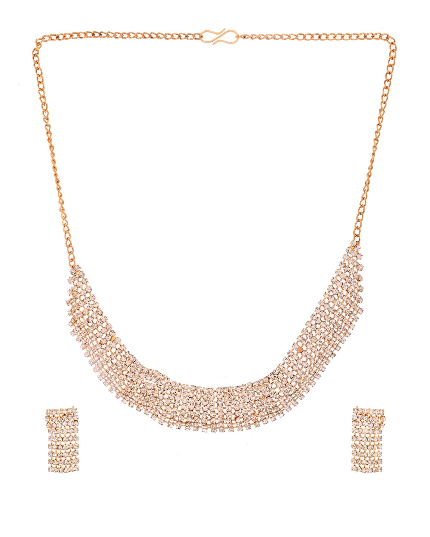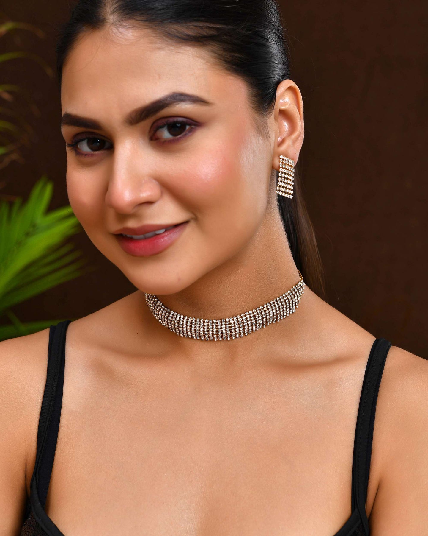 This Opulent Jewellery Set Is Designed To Capture Attention And Exude Grandeur. Featuring A Wide, Multi-Row Choker-Style Necklace Encrusted With Shimmering Stones From End To End, The Piece Brings Unmatched Brilliance To Any Festive Or Bridal Look. Every Inch Of This Statement Necklace Is Crafted To Reflect Light, Creating A Mirror-Like Sparkle That Enhances Your Neckline With Royal Finesse. Accompanied By Perfectly Matched Earrings That Mimic The Bold And Structured Design Of The Necklace, The Set Is Ideal For Traditional Functions, Weddings, And High-Fashion Occasions. The Rich Gold Tone Forms A Stunning Base That Intensifies The Radiance Of The American Diamonds, Making It A Perfect Pairing With Heavy Ethnic Outfits Like Lehengas, Sarees, And Gowns. Lightweight Despite Its Elaborate Look, The Necklace Comes With An Adjustable Closure To Ensure Comfort Throughout The Event. Add This To Your Collection When You Want Every Look To Shine With Elegance And Strength.