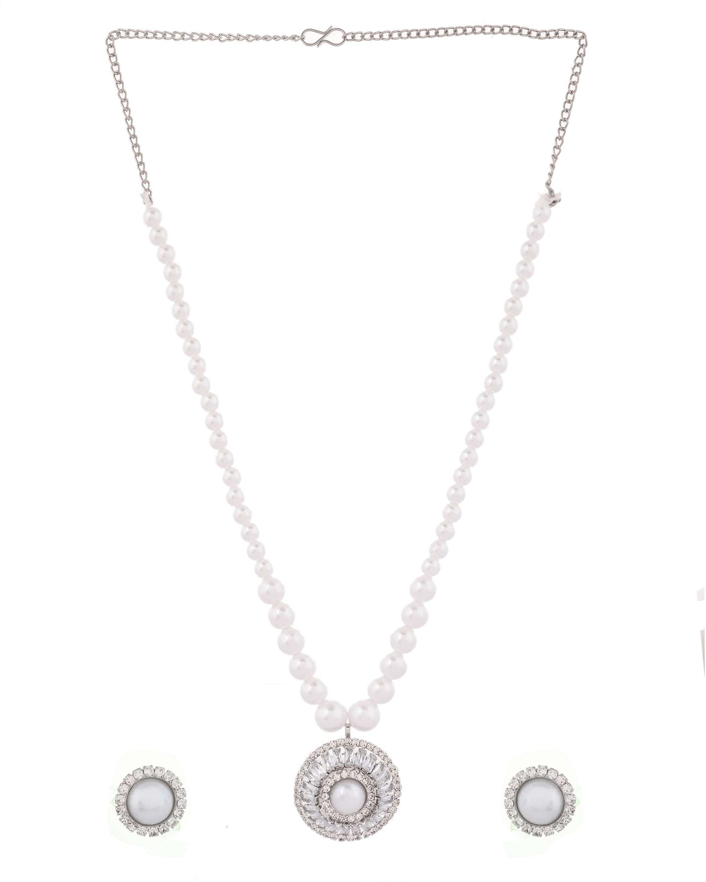Sophisticated And Elegant, This Pearl-Inspired Jewellery Set Is The Perfect Choice For Those Who Appreciate Subtle Glamour And Timeless Design. The Necklace Features Glossy, Round White Beads That Are Strung Gracefully With A Large Central Pendant Adorned With Faux Pearls And Shimmering Crystals. Paired With Matching Round Stud Earrings, This Set Enhances Any Outfit—From Festive Ethnic Wear To Contemporary Formal Looks. Its Lightweight And Polished Design Make It An Ideal Accessory For Weddings, Office Parties, Or Everyday Elegance. Whether Styled With A Saree, A Gown, Or A Kurti, This Piece Speaks Grace And Minimal Charm In Every Setting.