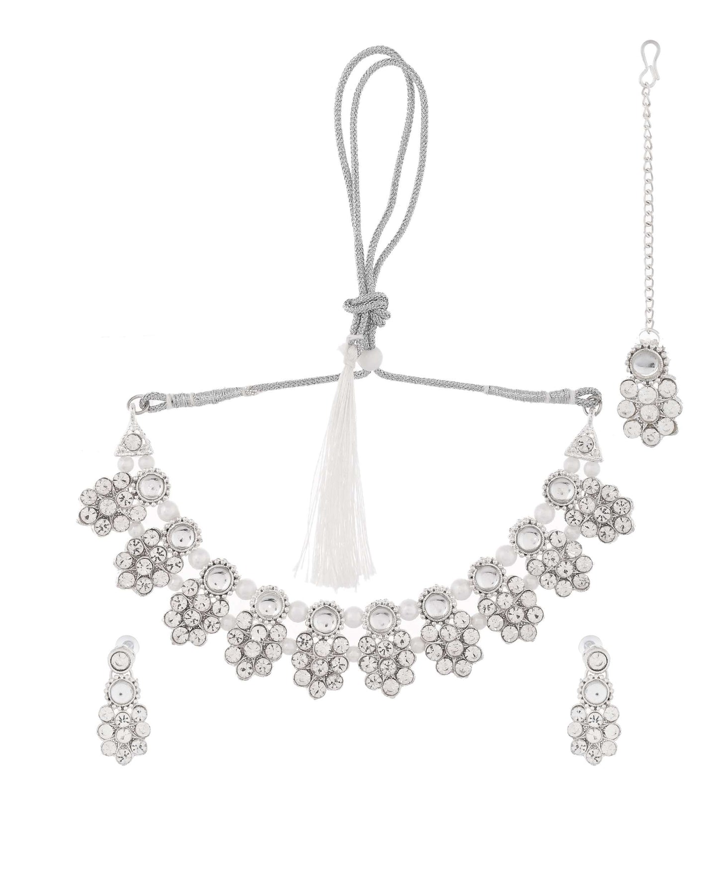 Designed To Dazzle, This Beautifully Detailed Jewellery Set Is An Instant Head-Turner. Featuring Clustered Shimmering Stones Paired With Delicate Pearl Accents, The Necklace Forms A Striking Visual Pattern That Sparkles With Every Move. The Silver-Toned Setting And Intricate Pendant Shapes Give It An Elegant And Luxurious Feel, Making It The Perfect Choice For Weddings, Receptions, Or Festive Events. The Matching Earrings Echo The Ornate Design Of The Necklace For A Cohesive And Sophisticated Look. Comfortable To Wear And Adjustable To Fit Perfectly, This Set Blends Glamour With Grace To Complement Both Traditional And Contemporary Outfits.