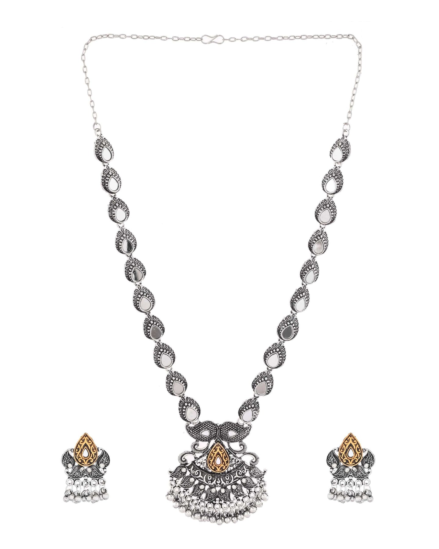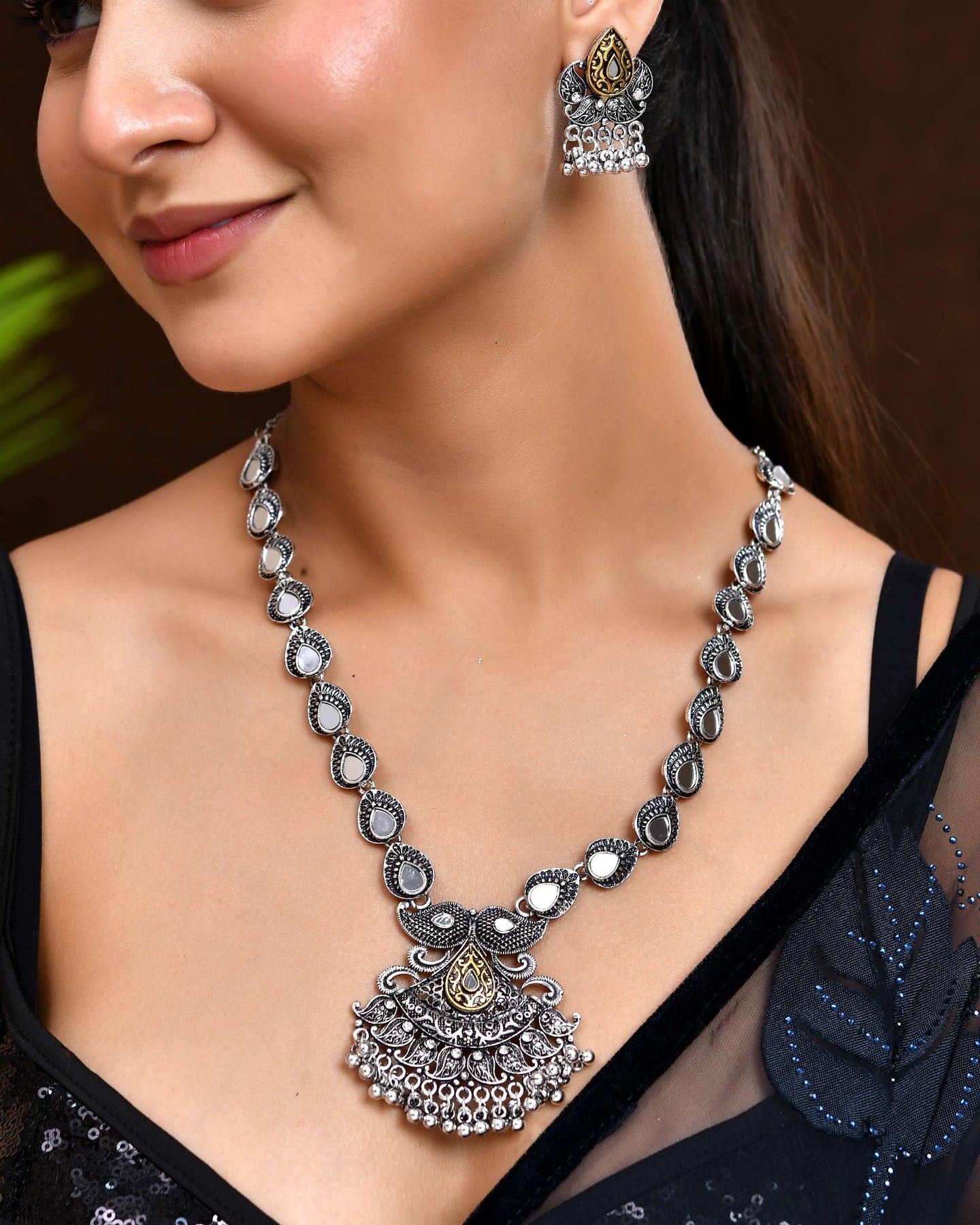 Bringing Together Antique Silver Charm And Hints Of Golden Brilliance, This Handcrafted Necklace Is A Tribute To Traditional Indian Craftsmanship. The Chain Features A Symmetrical Arrangement Of Leaf-Shaped Oxidised Silver Elements Embedded With White Mirror Accents. At The Center, A Grand, Paisley-Shaped Pendant Enhanced With A Golden Teardrop Motif Adds A Stunning Focal Point. The Intricate Carvings, Ghungroo-Style Fringe, And Dual-Tone Detailing Make It Ideal For Festivals, Weddings, Or Any Ethnic Celebration. Lightweight Yet Visually Impactful, This Piece Works Beautifully With Sarees, Lehengas, Or Fusion Wear, Lending A Regal Touch To Your Overall Look.
