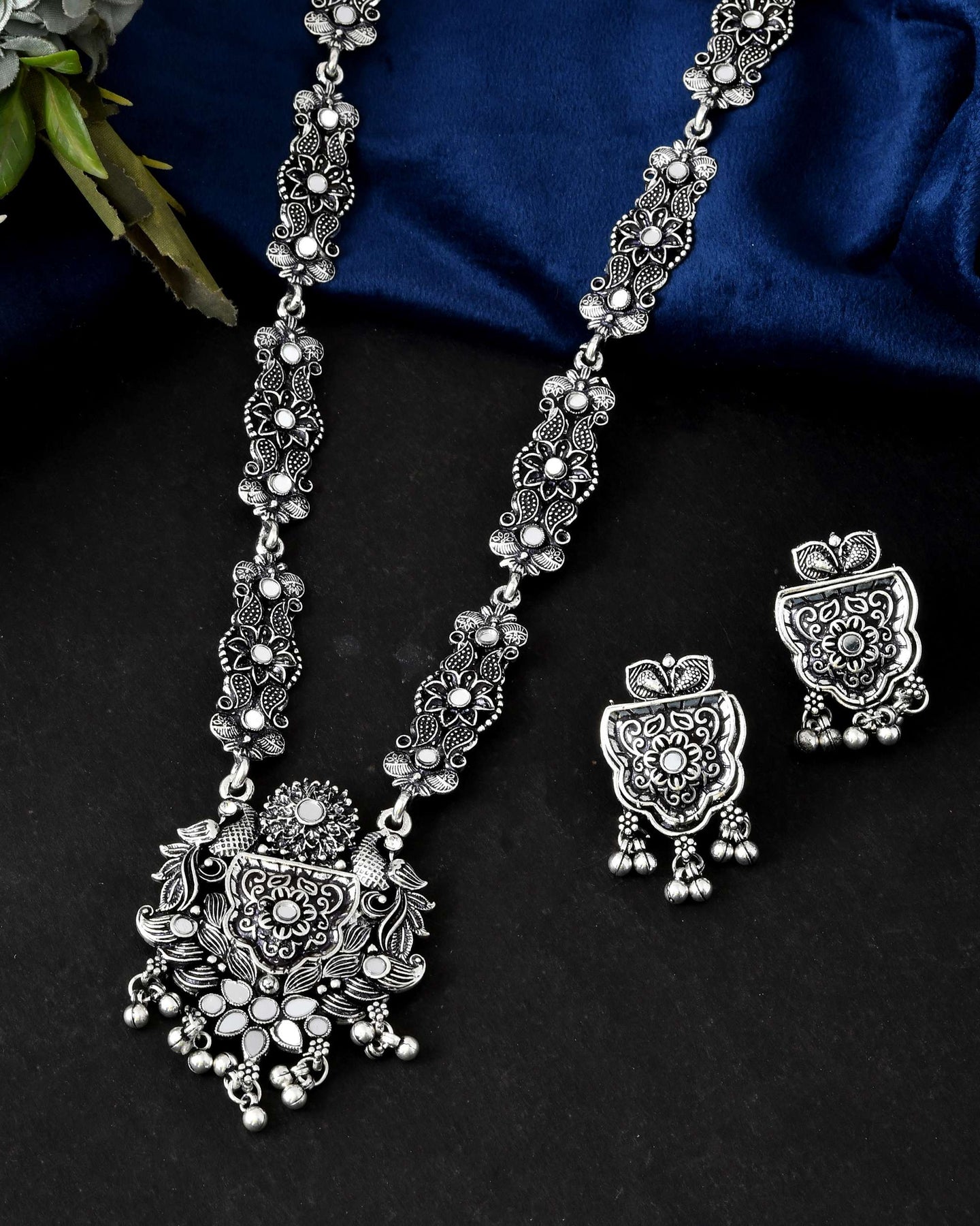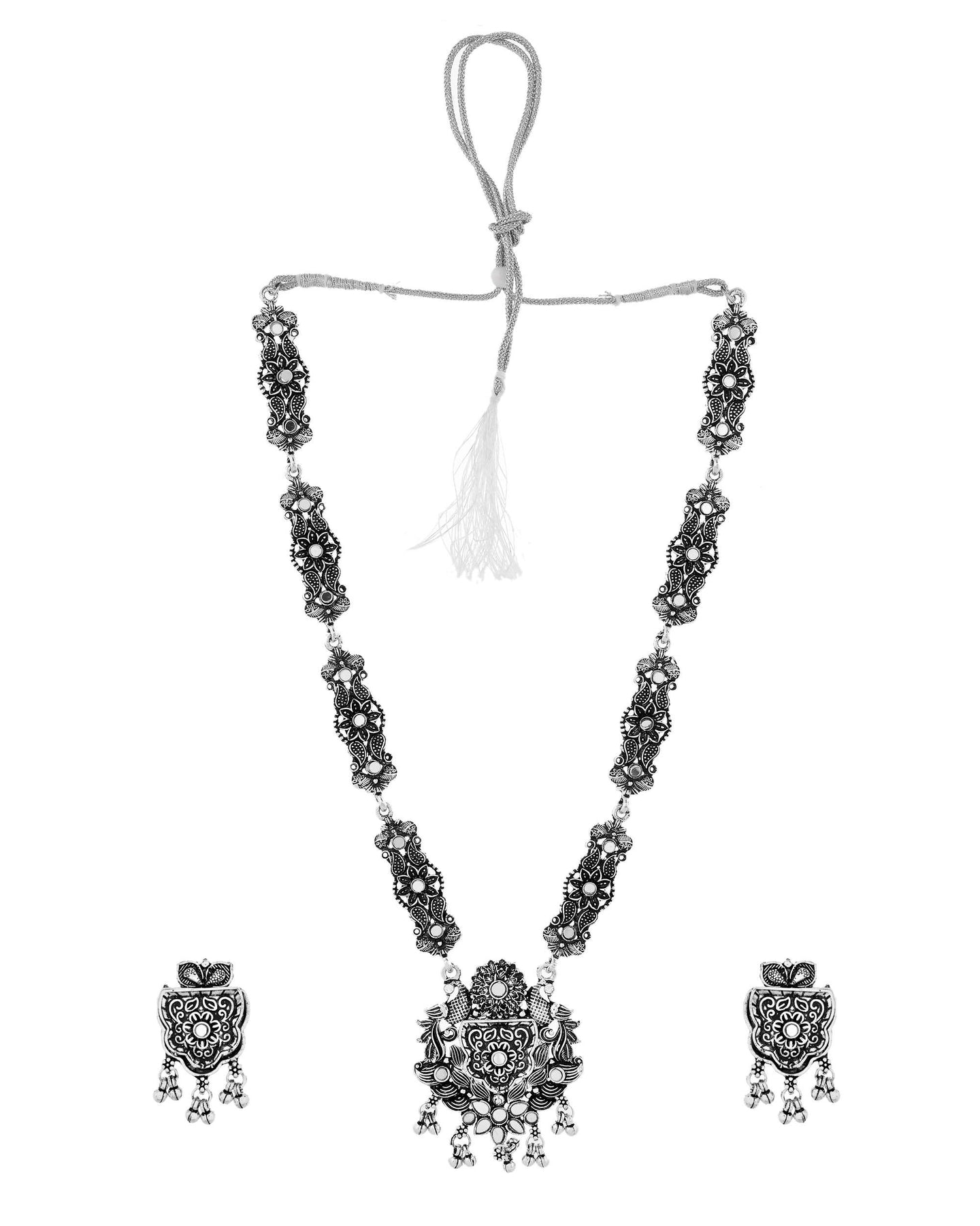 Women's Floral Oxidised Silver Long Necklace Set With Earrings