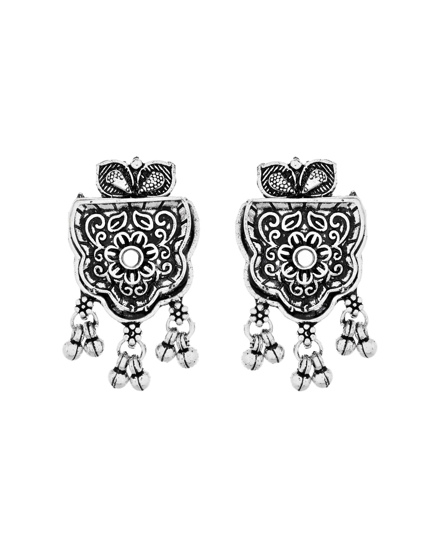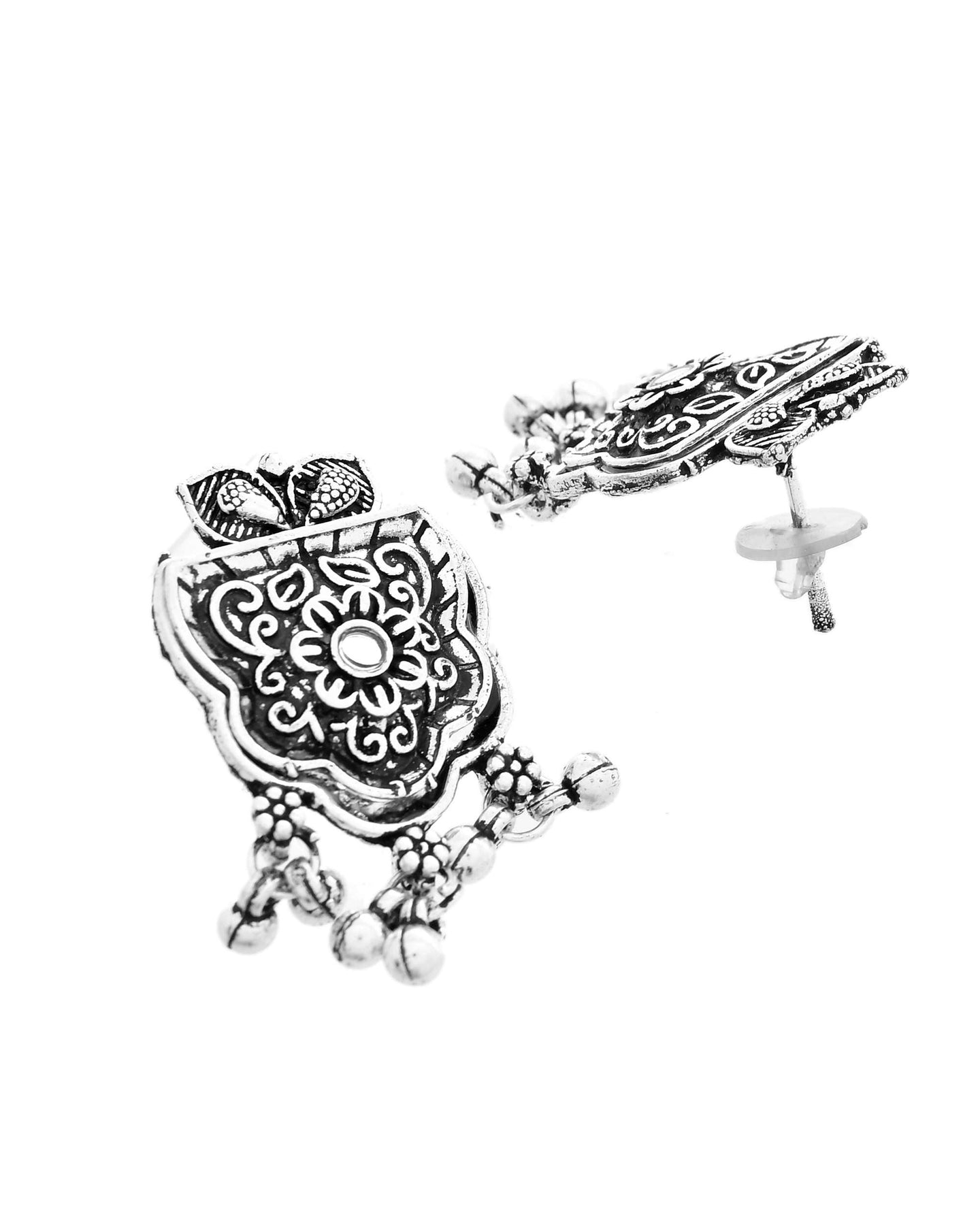 This Exquisite Oxidised Jewellery Set Showcases A Harmony Of Tradition And Craftsmanship With Its Finely Carved Floral Motifs And Detailed Pendant. Designed To Grace The Neckline Elegantly, The Long Chain Features Repeating Engraved Floral Units That Lead To A Majestic Central Pendant Adorned With Antique Detailing And Hanging Beads. The Set Is Accompanied By Matching Earrings To Complete The Ethnic Look. Whether Paired With Sarees, Kurtas, Or Indo-Western Wear, It Enhances The Festive Aura And Adds A Bold, Regal Touch. Lightweight Yet Impactful, It’S Perfect For Cultural Functions, Weddings, Navratri, Or Statement Fashion Days