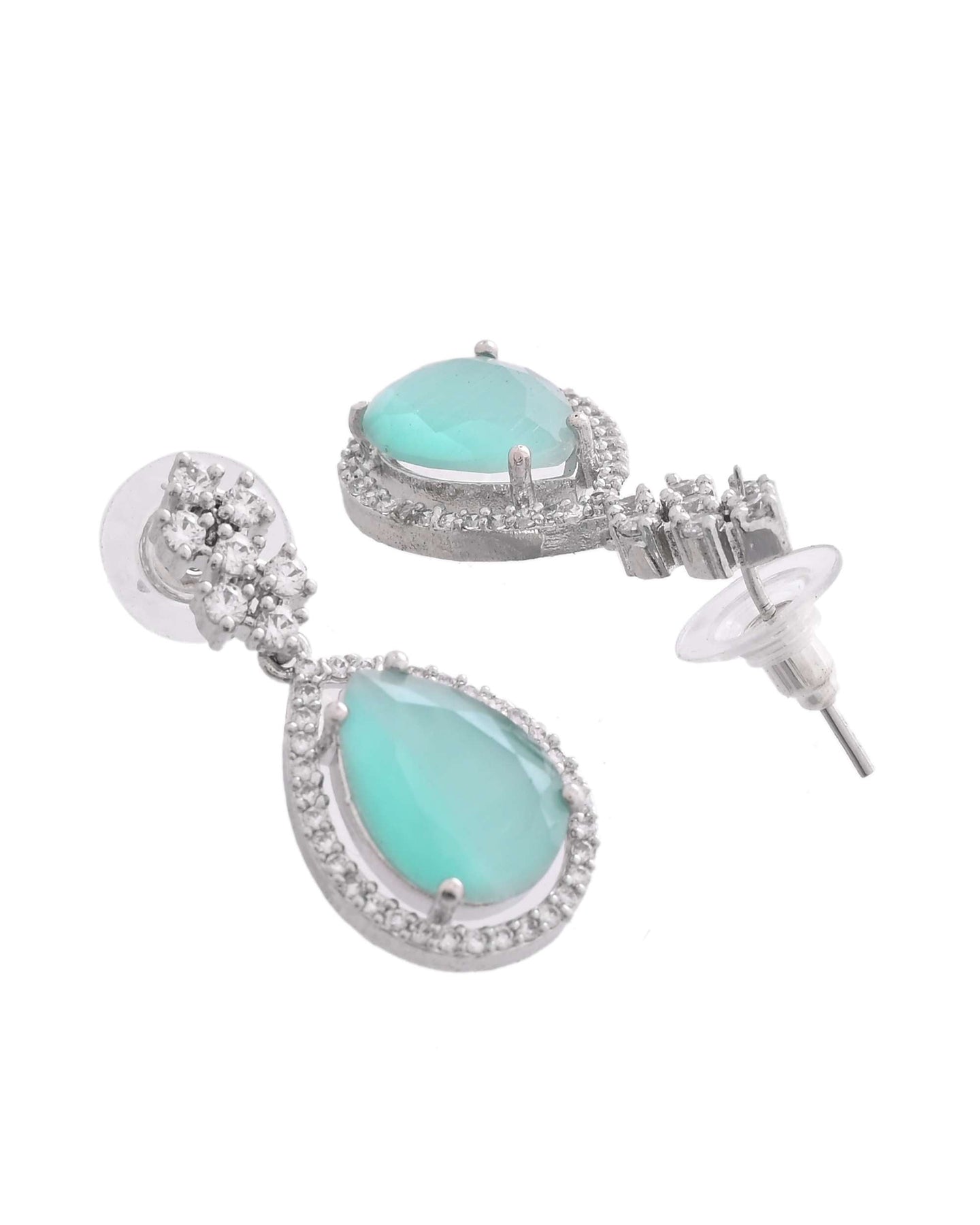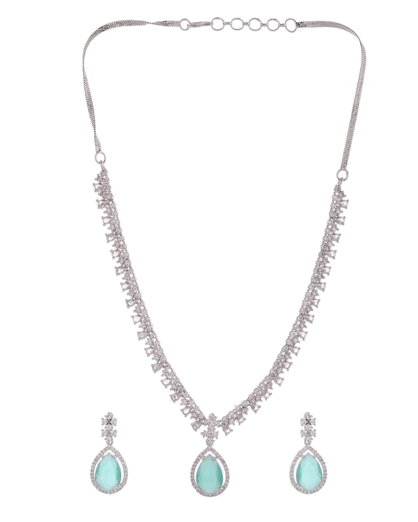Add A Touch Of Timeless Elegance To Your Collection With This Rhodium-Plated Mint Green & American Diamond-Studded Jewellery Set. Designed With Finesse, This Set Features Teardrop-Shaped Mint Green Stones At Its Heart, Surrounded By Dazzling American Diamonds And Cubic Zirconia Accents That Shimmer With Every Movement.