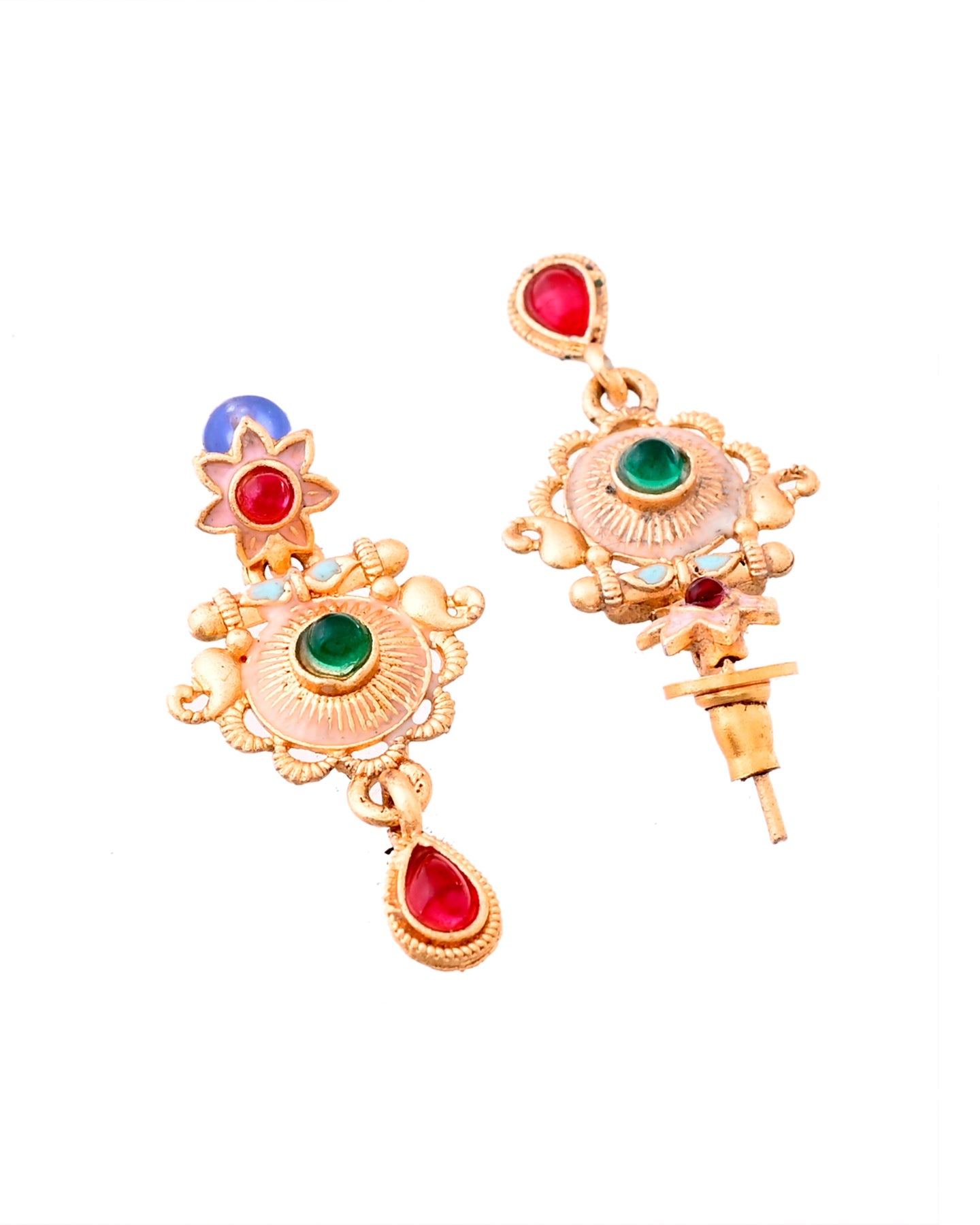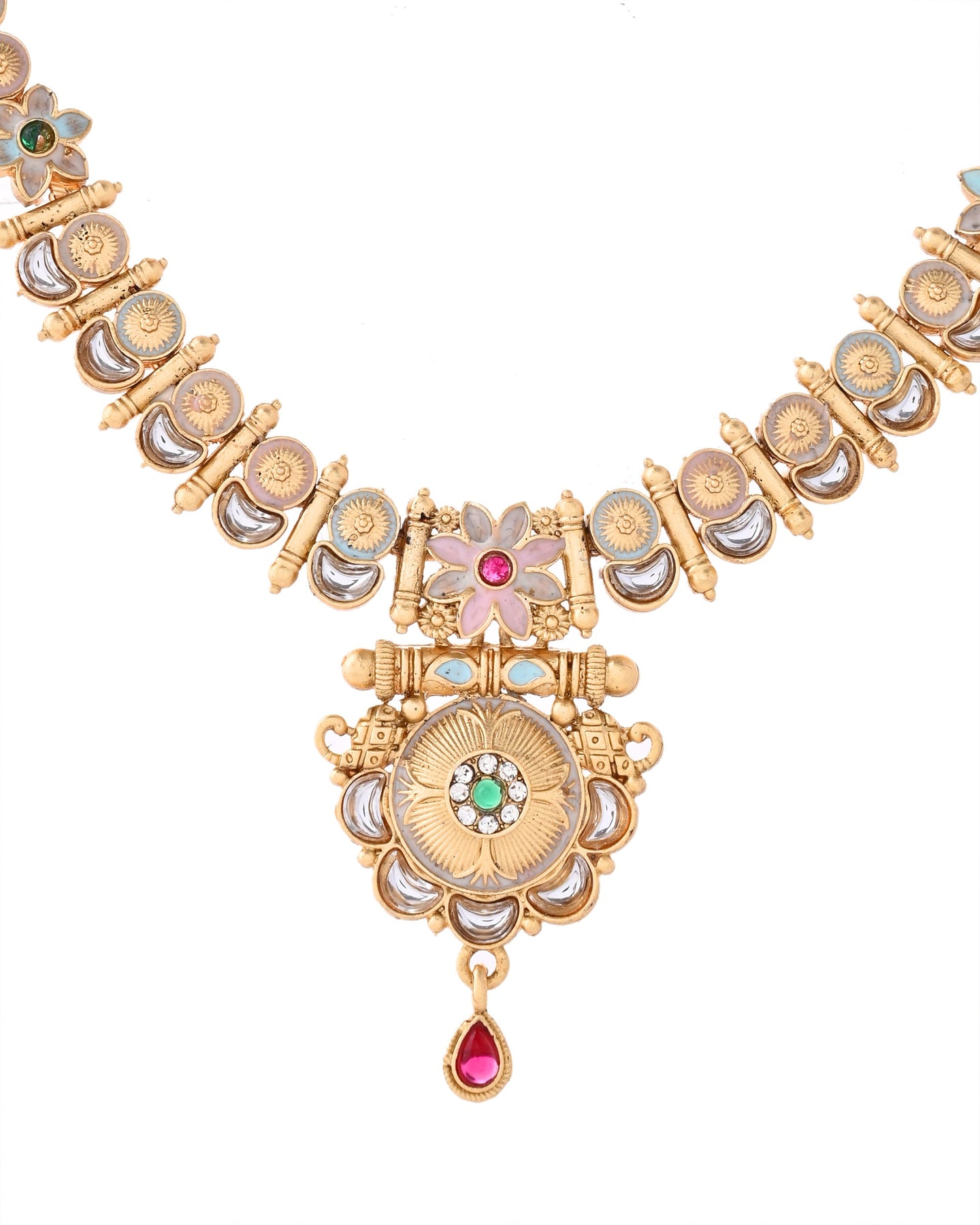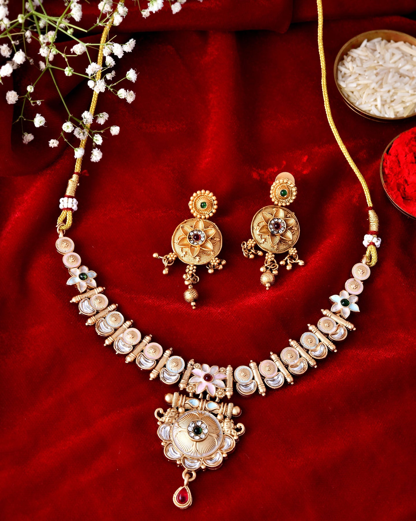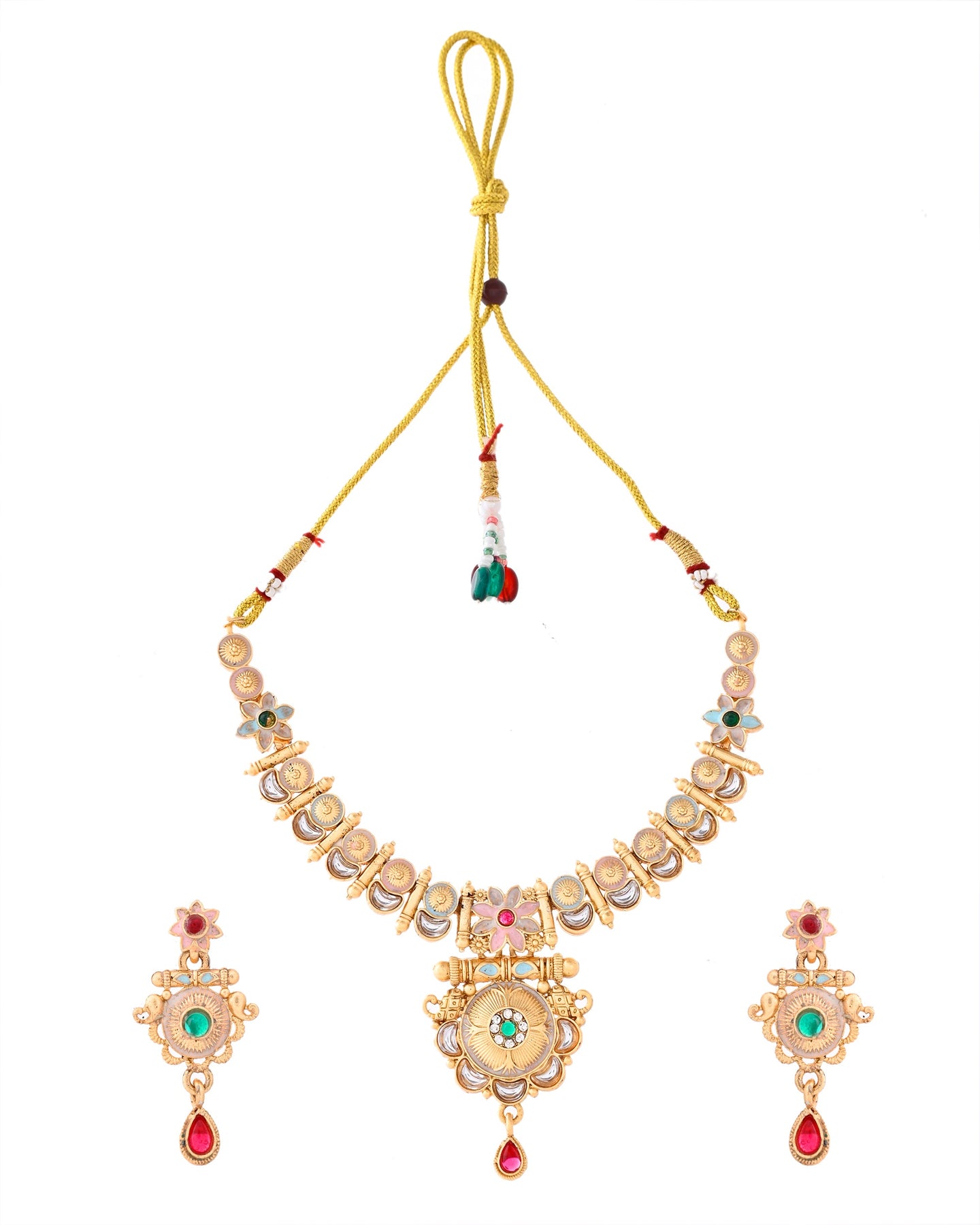 Embrace The Elegance Of Tradition With This Stunning Gold-Plated Necklace And Earrings Set. Inspired By Indian Heritage, This Set Features Intricate Floral Designs Adorned With Red And Green Gemstones, Complemented By Pearl And Bead Detailing. The Vibrant Colors And Delicate Craftsmanship Make It Perfect For Festive Occasions, Weddings, And Special Celebrations. The Lightweight Yet Detailed Design Ensures Comfort Without Compromising On Style