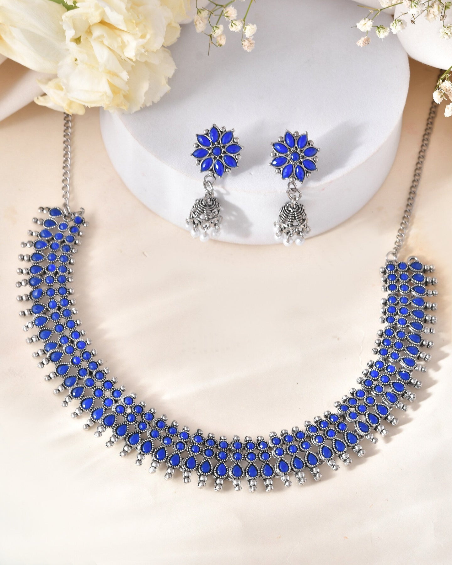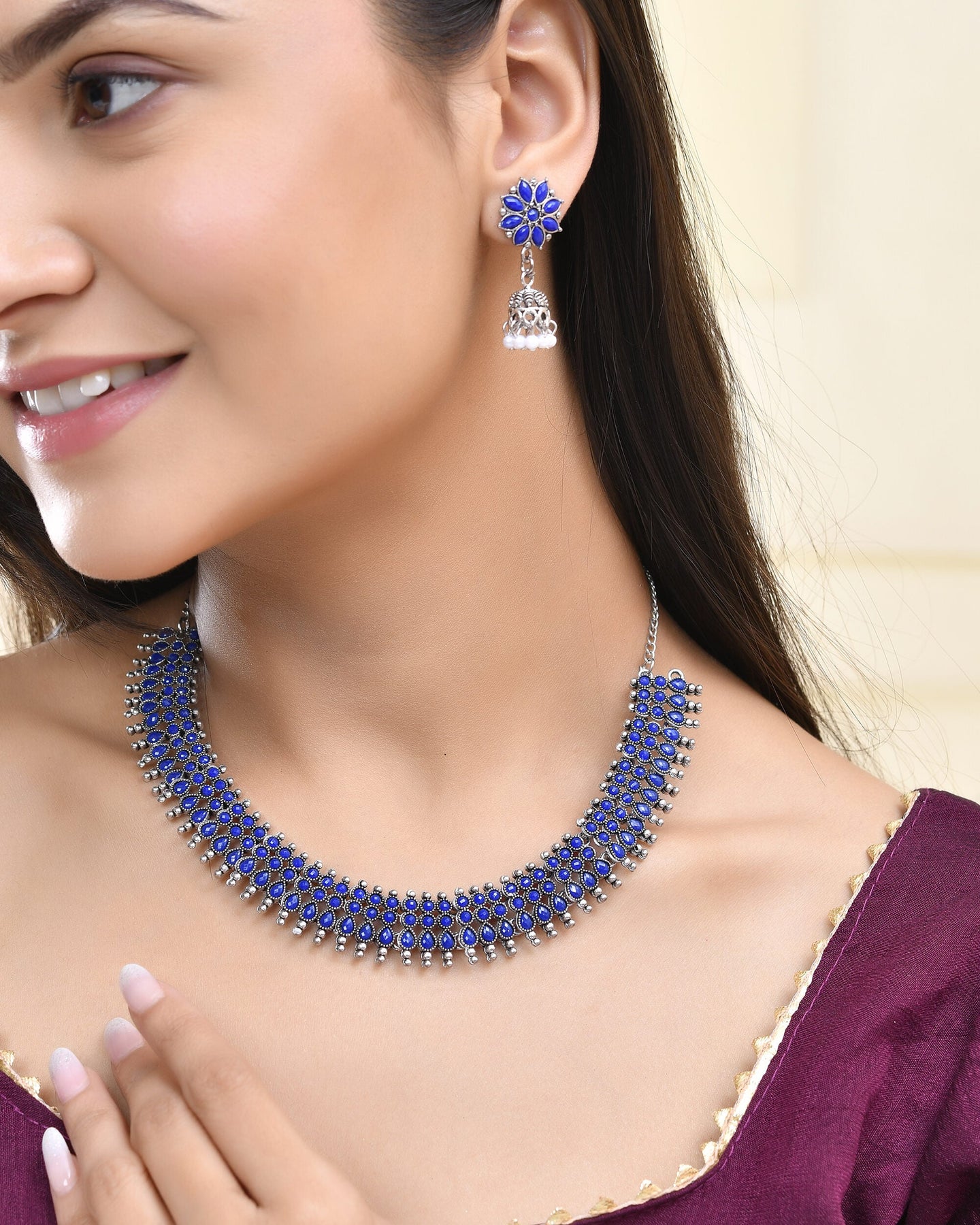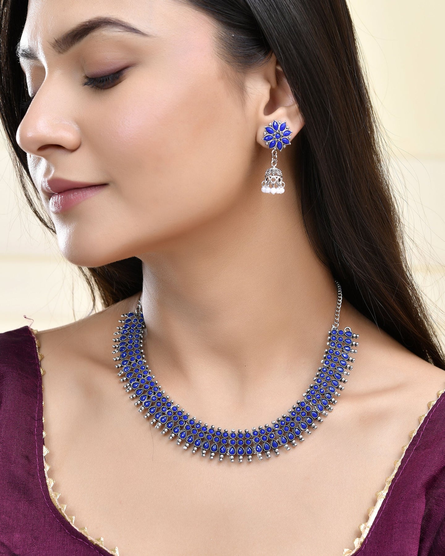 Elevate Your Ethnic And Fusion Looks With This Stunning Royal Blue Necklace And Earring Set. Designed With Intricate Silver Plating And Vibrant Blue Enamel Work, This Set Reflects Timeless Elegance. The Necklace Sits Beautifully On The Neckline, While The Matching Earrings Feature Floral Motifs With Delicate Jhumka-Inspired Hangings. Perfect For Weddings, Festive Celebrations, And Special Occasions, This Set Pairs Effortlessly With Sarees, Lehengas, Or Even Indo-Western Outfits.