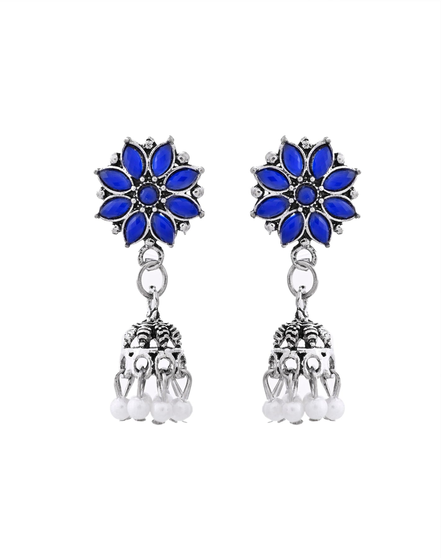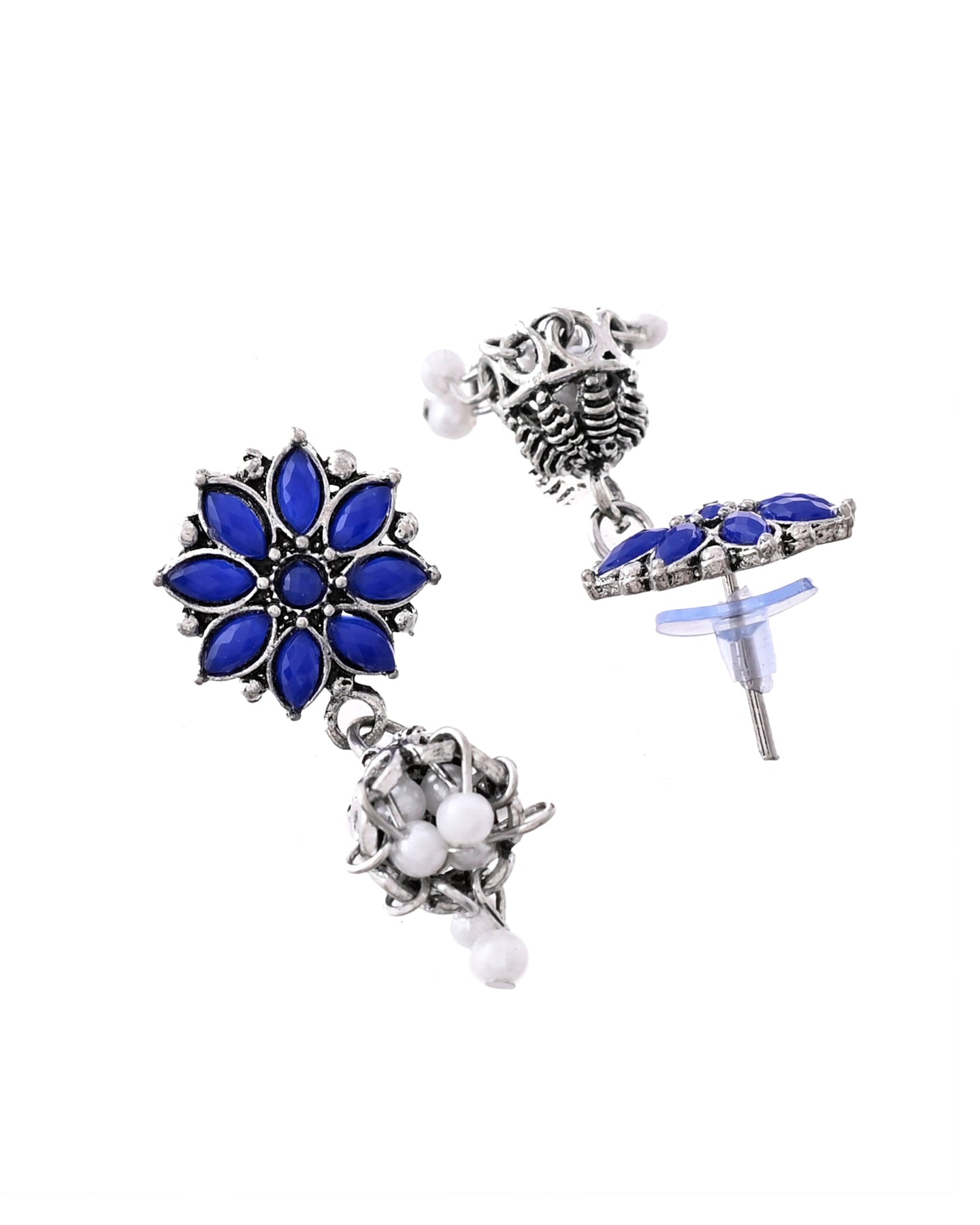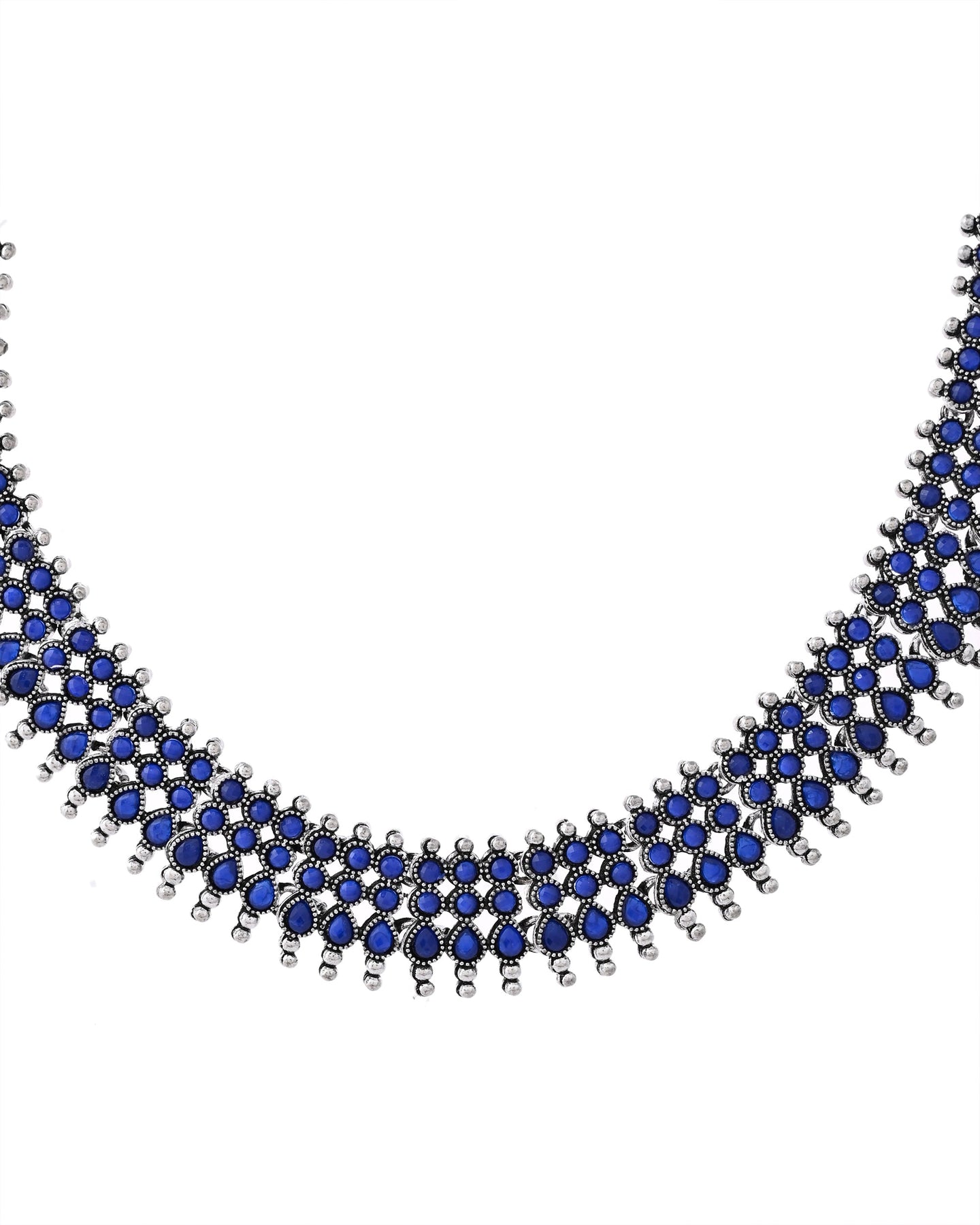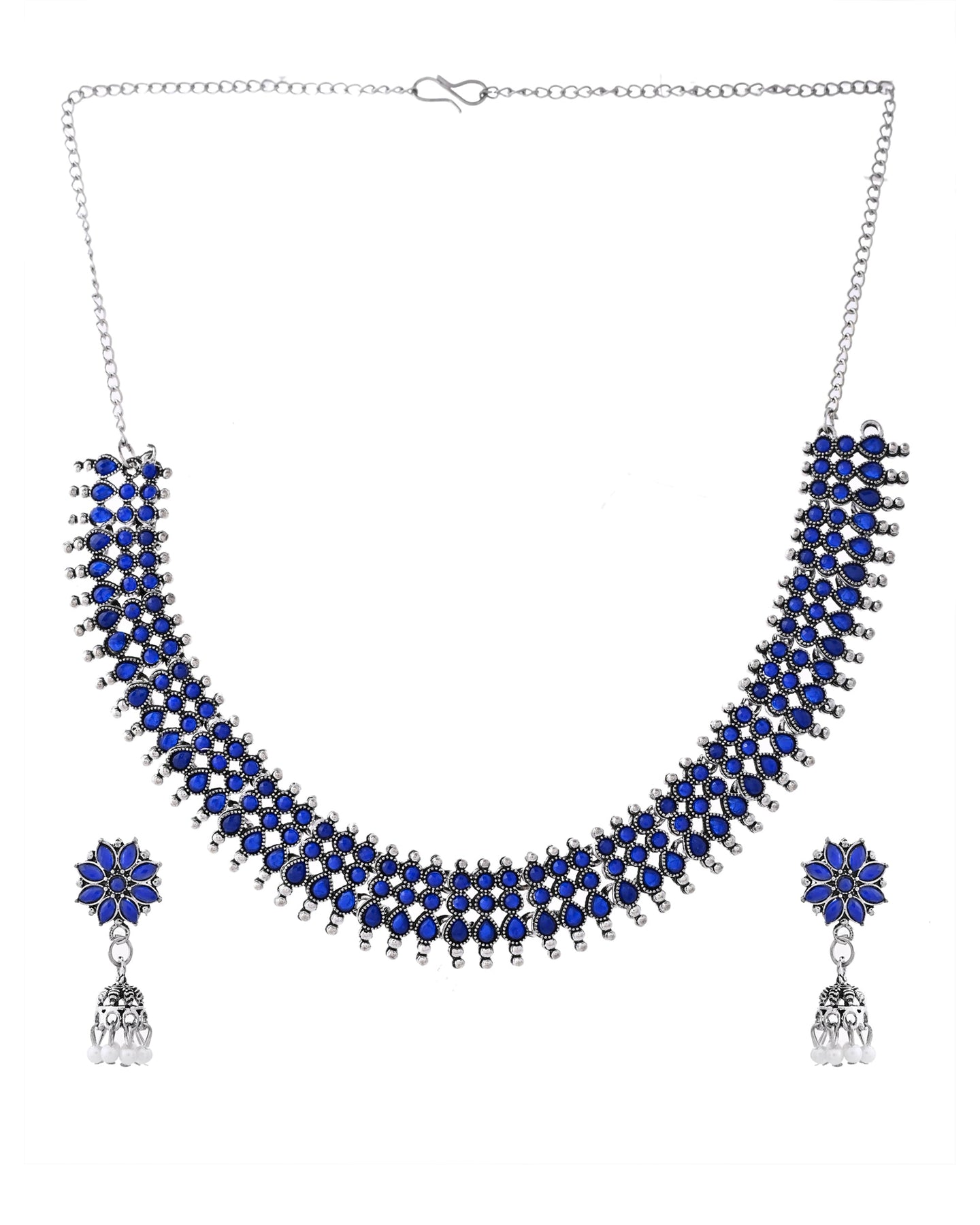 Elevate Your Ethnic And Fusion Looks With This Stunning Royal Blue Necklace And Earring Set. Designed With Intricate Silver Plating And Vibrant Blue Enamel Work, This Set Reflects Timeless Elegance. The Necklace Sits Beautifully On The Neckline, While The Matching Earrings Feature Floral Motifs With Delicate Jhumka-Inspired Hangings. Perfect For Weddings, Festive Celebrations, And Special Occasions, This Set Pairs Effortlessly With Sarees, Lehengas, Or Even Indo-Western Outfits.