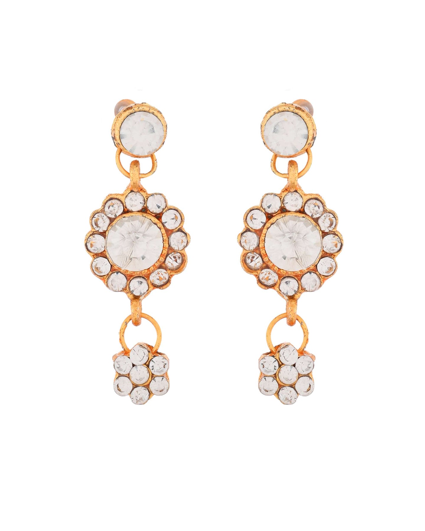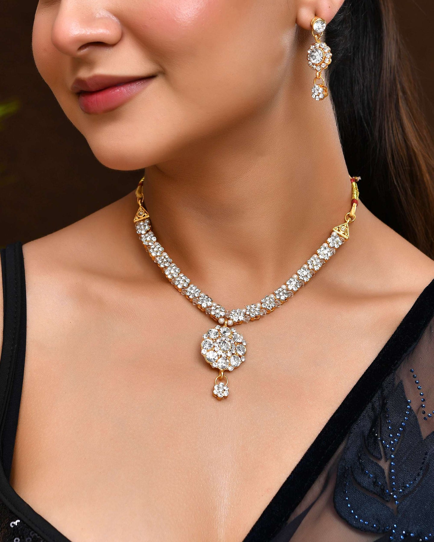 Turn Heads On Your Special Day With This Dazzling Gold-Plated Bridal Necklace Set, Beautifully Encrusted With Shimmering Clear Crystals. The Intricate Floral-Inspired Design Brings Together Elegance And Grandeur, Making It A Perfect Choice For Brides And Wedding Guests Alike. This Complete Set Includes A Matching Pair Of Earrings And A Maang Tikka, Allowing You To Create A Cohesive And Regal Look Effortlessly. The Necklace Features An Adjustable Dori Tie, Offering A Perfect Fit For All Neck Sizes. Crafted To Complement Both Traditional And Fusion Outfits, This Statement Jewellery Set Is A Must-Have For Festive Events, Receptions, Sangeet Nights, And More. Add Sparkle, Sophistication, And Royal Charm To Your Jewellery Collection With This Timeless Piece.