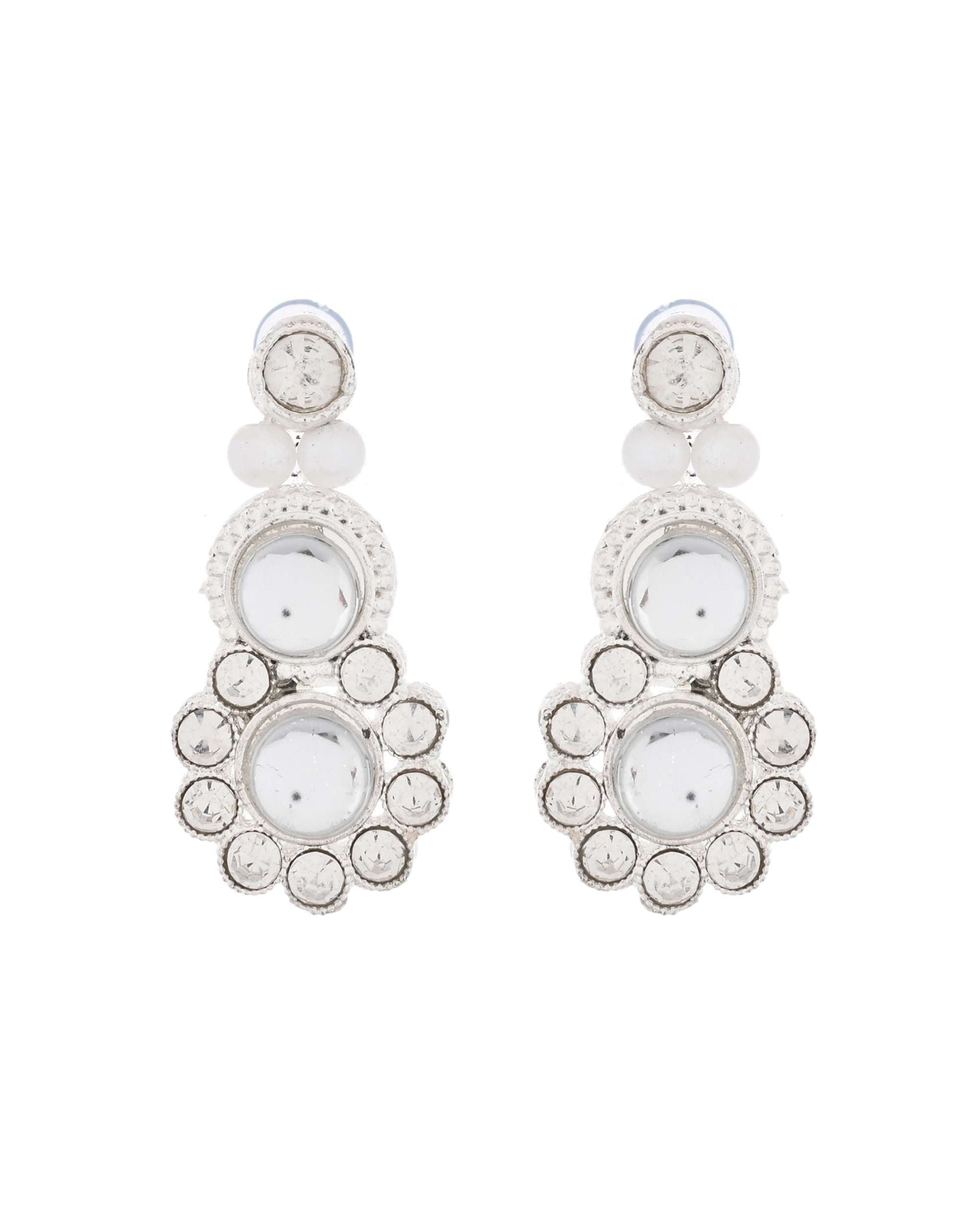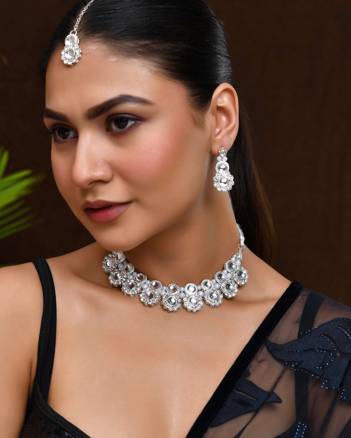 Bring Out Your Bold And Beautiful Side With This Eye-Catching Oxidized Silver Choker Necklace Set. Designed With Traditional Mirror Work And Intricate Detailing, This Handcrafted Set Features A Tied Thread Closure For A Perfect Fit And Includes Matching Dangle Earrings. The Floral Motifs And Tribal-Inspired Design Make It An Ideal Accessory For Festive Occasions, Navratri Nights, Or Indo-Western Outfits. Lightweight And Stylish, It'S Perfect For Those Who Love A Statement Piece With Ethnic Charm.