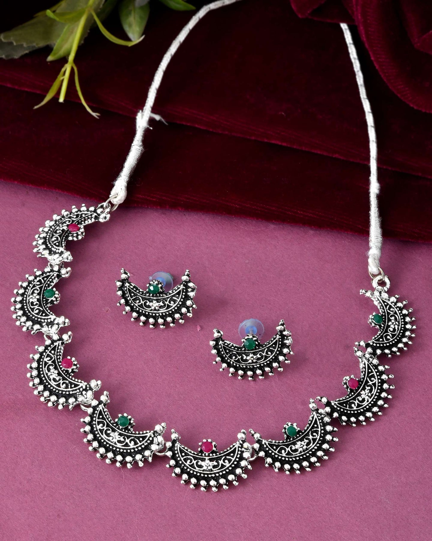 Designed To Effortlessly Enhance Festive, Ethnic, Or Indo-Western Outfits, This Exquisitely Crafted Set Showcases A Unique Silhouette Inspired By Timeless Artisanal Techniques. The Delicately Engraved Forms Highlight A Rhythmic Symmetry With Multicolour Accents Embedded In Detailed Silver-Finished Settings. With A Silhouette That Embraces Bohemian Flair And Vintage Character, This Piece Adds Charm Whether Paired With Traditional Lehengas, Cotton Sarees, Anarkalis, Or Even Minimal Contemporary Ensembles. Its Lightweight Yet Impactful Presence Allows For Comfortable Day-Long Wear During Cultural Events, College Functions, Or Spiritual Gatherings. Every Element Speaks Of Intricate Craftsmanship, With The Arrangement Offering Both Symmetry And A Touch Of Unpredictability—Ideal For Women Seeking A Balance Between Elegance And Bold Expression. The Adjustability Of The Neckpiece Ensures Universal Compatibility For Various Styling Preferences, And The Matching Accessories Create A Harmonious Look Without Overwhelming The Wearer. It’S Perfect As A Thoughtful Gift For Loved Ones, Festive Seasons Like Diwali, Durga Puja, Eid, Or Navratri, Or As A Go-To Accessory To Add Flair To Everyday Ethnic Fashion. Whether You'Re Embracing Heritage Or Looking To Elevate Your Personal Style, This Piece Makes A Graceful And Fashion-Forward Statement.