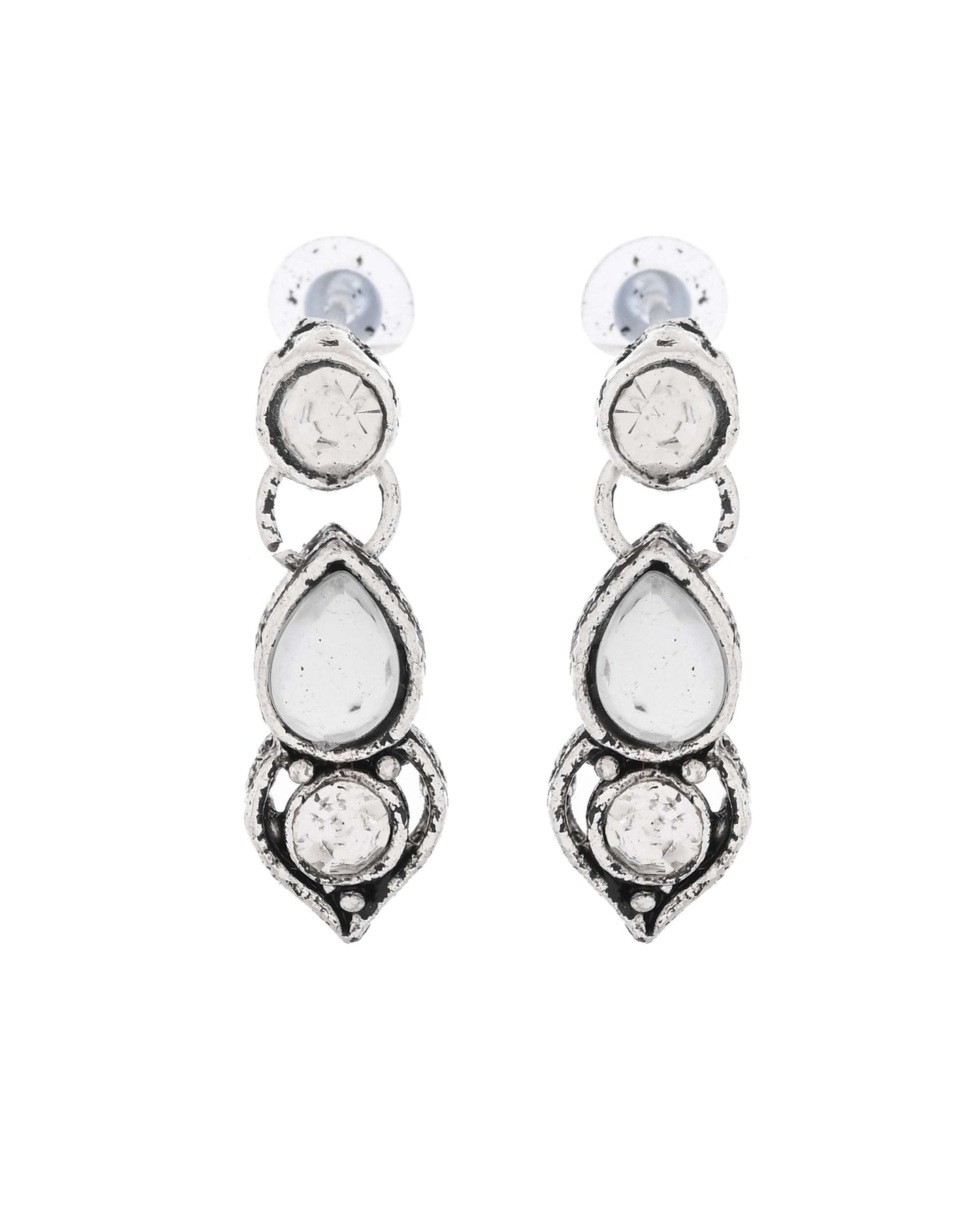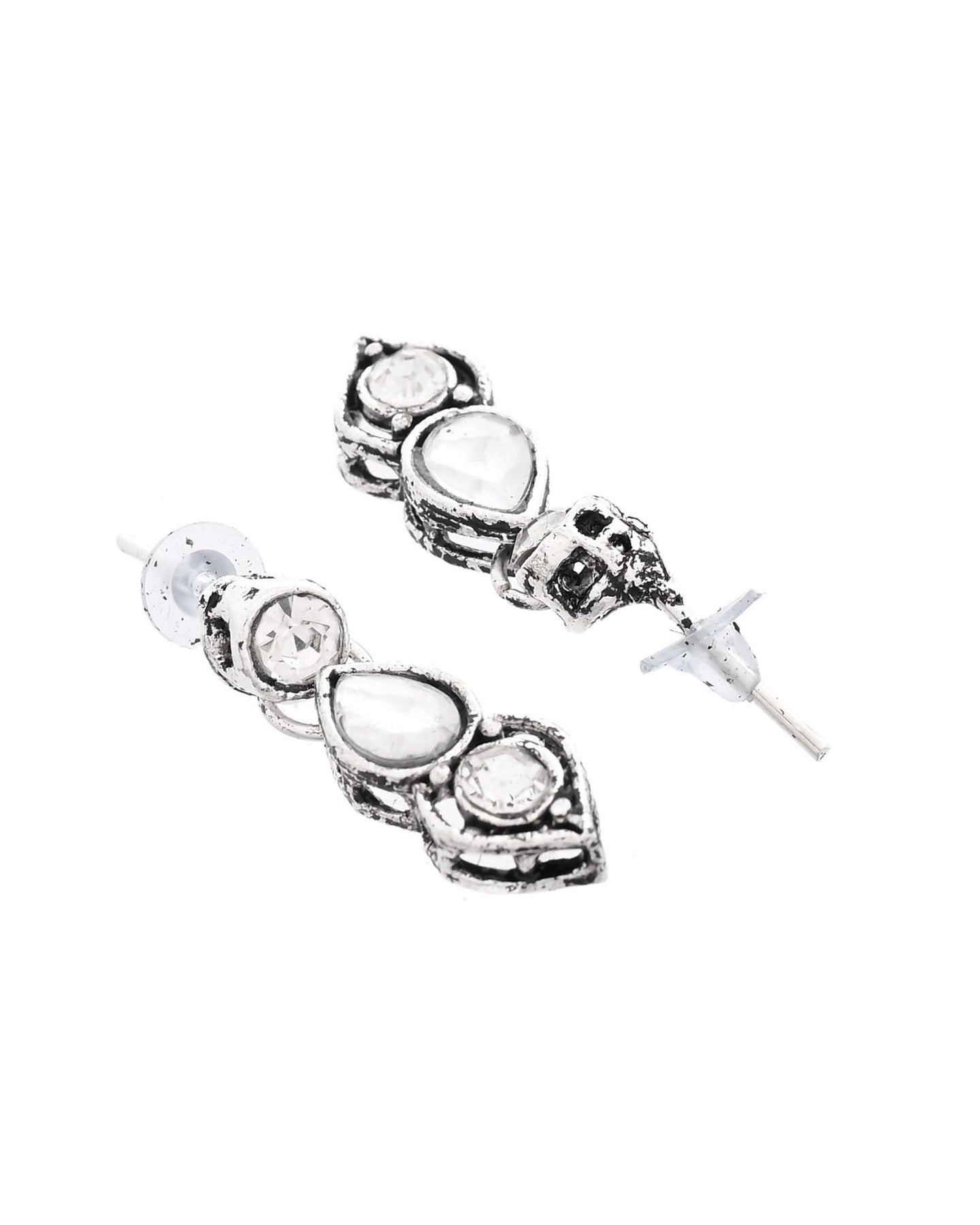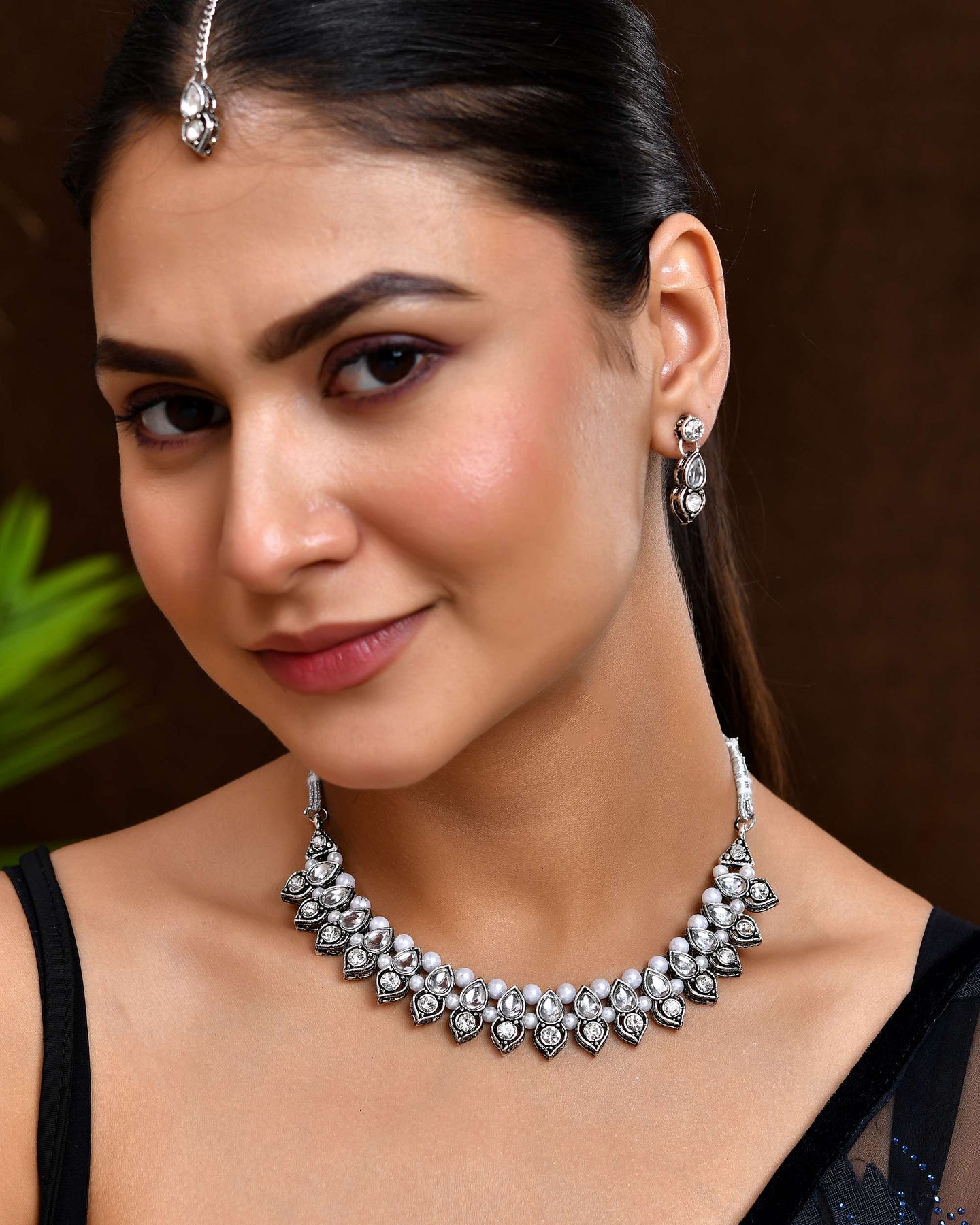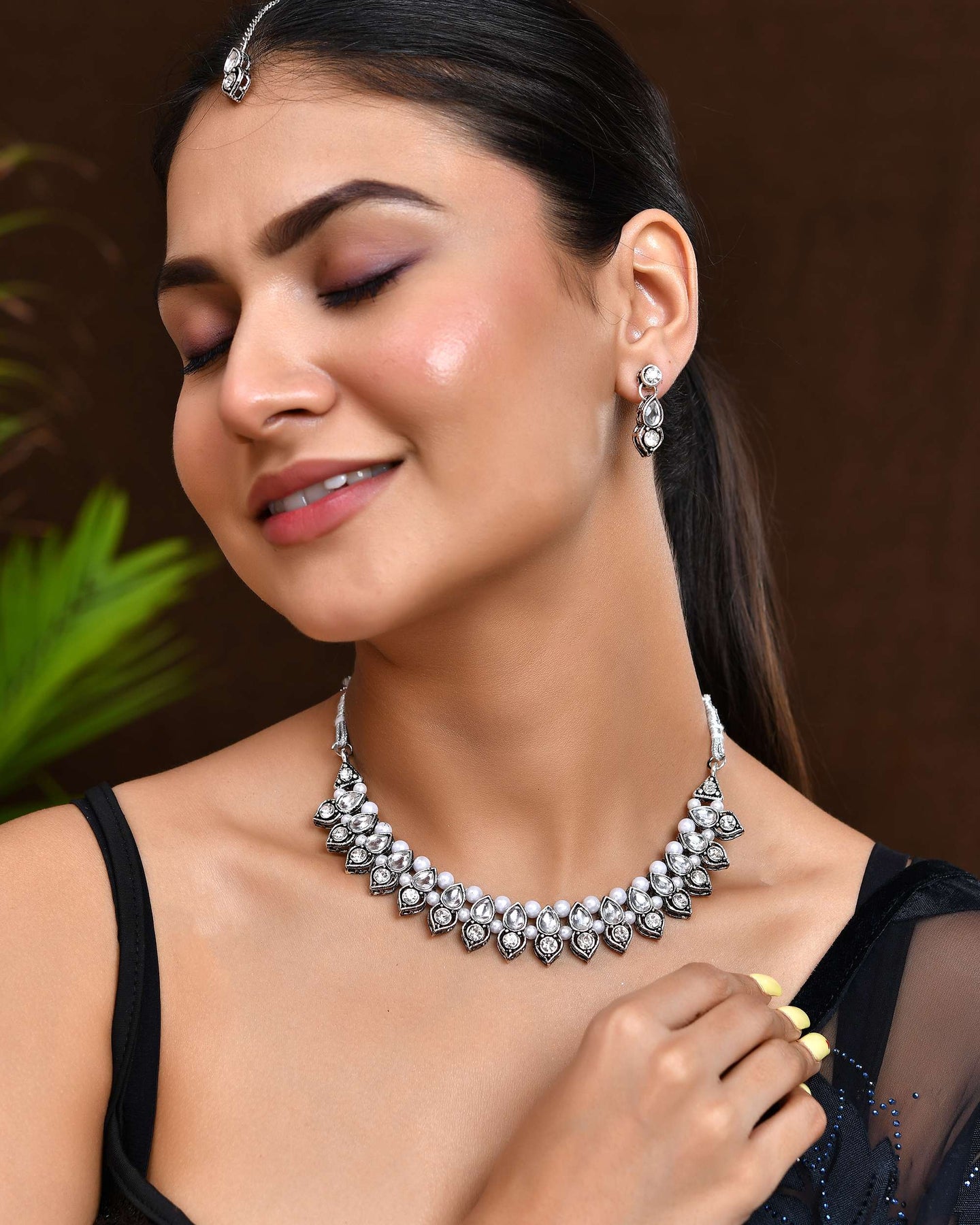 Crafted With A Blend Of Vintage Charm And Contemporary Aesthetics, This Elegant Jewelry Set Showcases An Intricate Arrangement Of Pear-Shaped Stones Embedded In A Silver-Tone Framework. The Craftsmanship Reflects Fine Detailing With A High-Shine Mirror Finish, Giving A Luxurious And Royal Look. Accompanied By Matching Earrings, The Choker Sits Perfectly Around The Neckline, Adding Grace And Glamour To Traditional Outfits. The Design Strikes A Perfect Balance Between Modern Elegance And Ethnic Appeal, Making It An Ideal Choice For Weddings, Festivals, Or Celebratory Events. The Secure Thread Tie-Up Closure Ensures A Custom Fit While Enhancing The Comfort Of Wear. Whether Paired With A Saree, Lehenga, Or Fusion Wear, This Versatile Set Will Enhance Your Overall Ensemble With Its Bold Yet Refined Appeal.