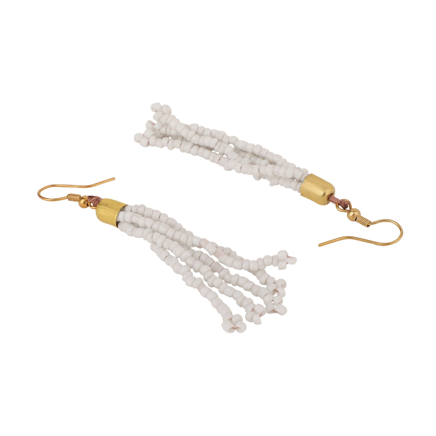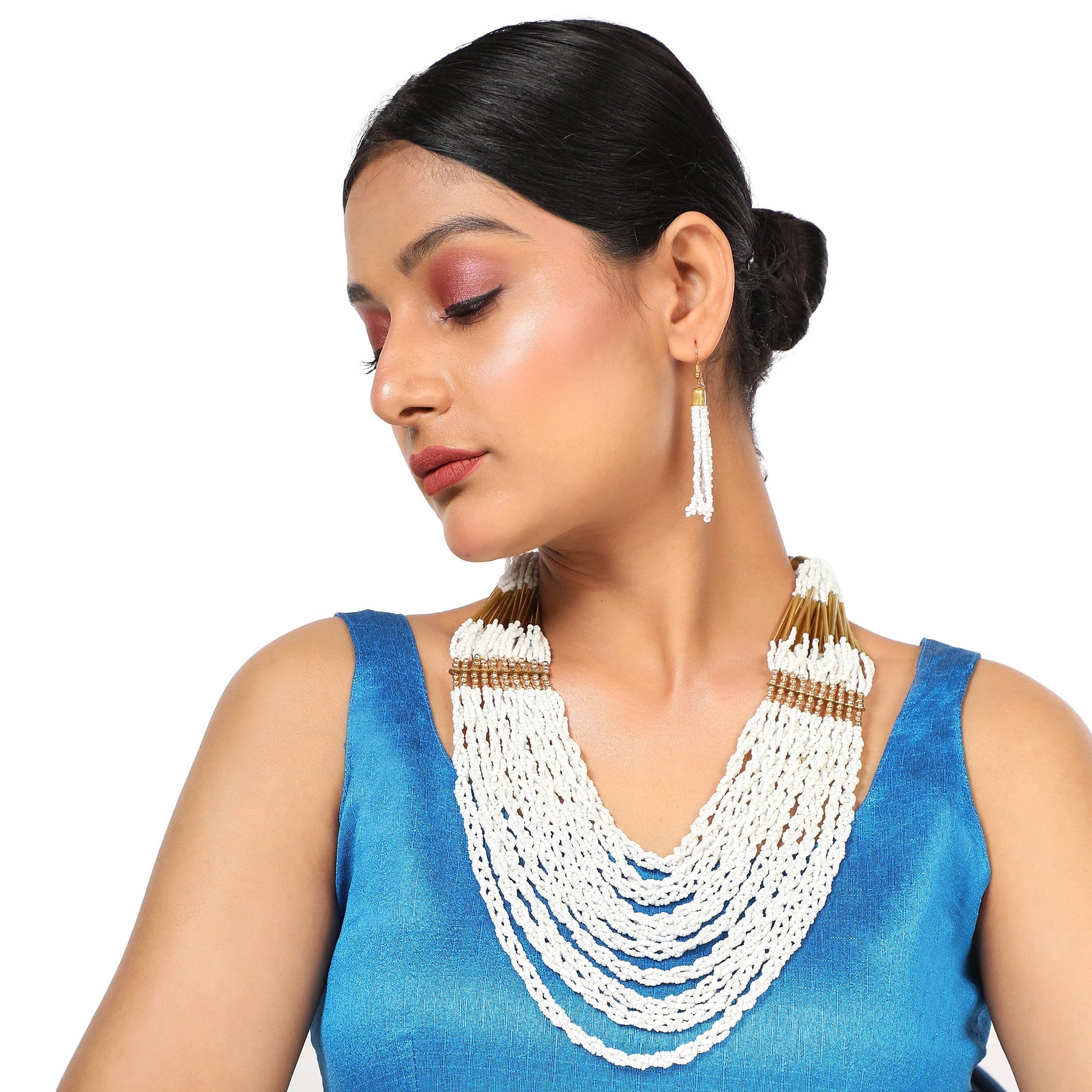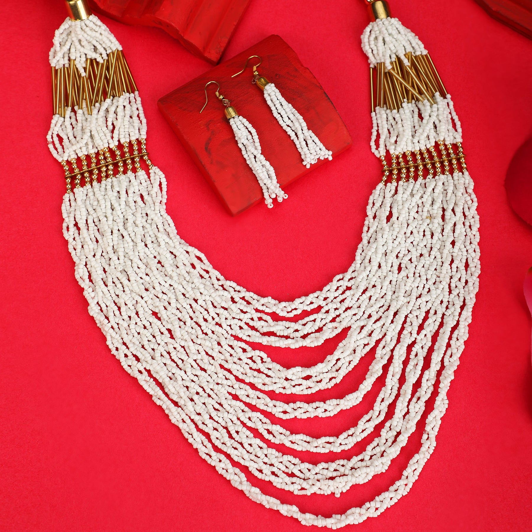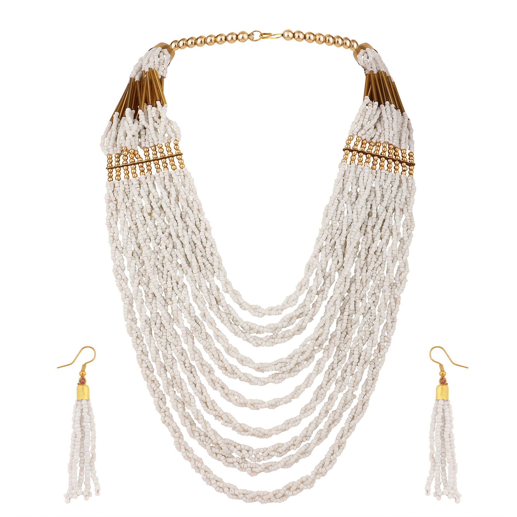 Mode Mania Contemporary White Colored Beads Gold Plated Heavy Layered Necklace Set With Earring For Women And Girls