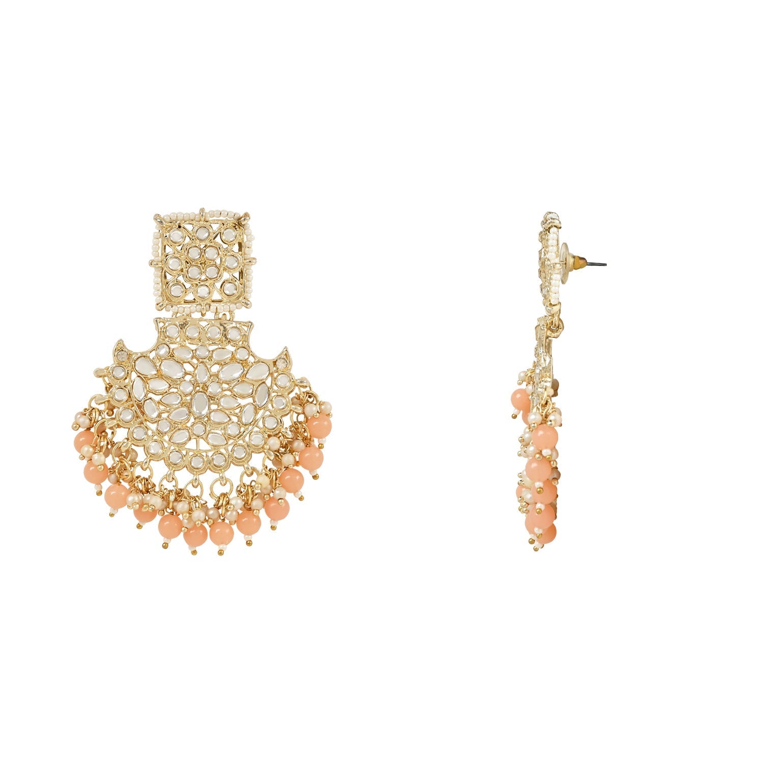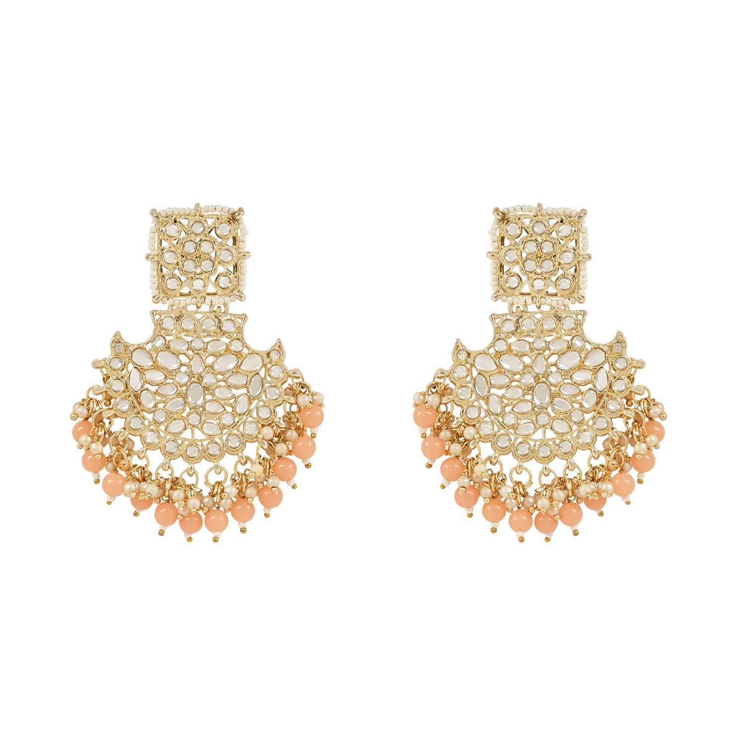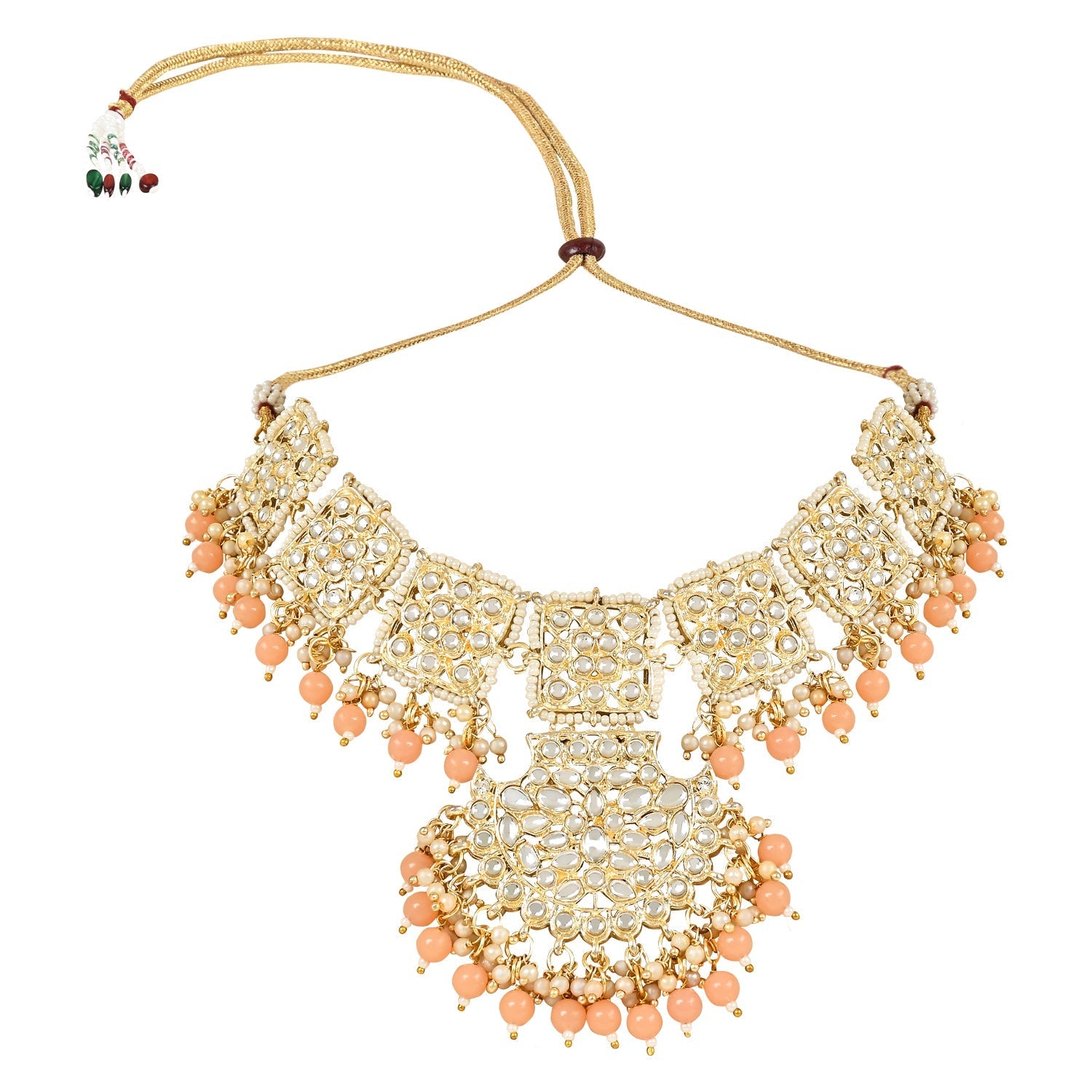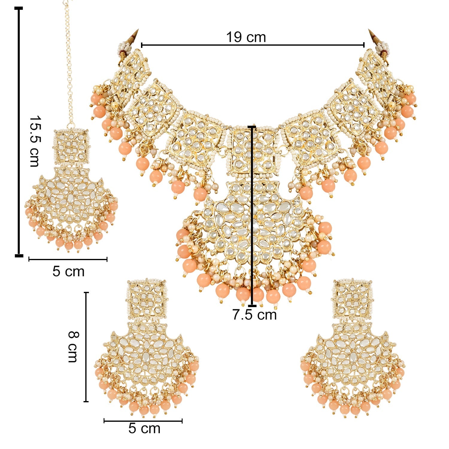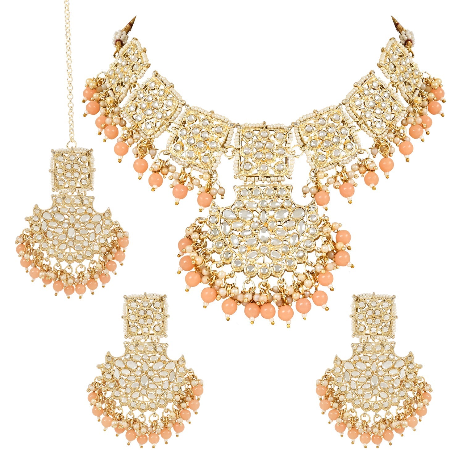 The Gold Plated Choker Necklace Set Consists Of A Necklace, A Pair Of Earrings, And A Maang Tikka. The Necklace Features Kundan Studded With Pearl Beaded In It, Giving It An Elegant And Traditional Look. The Stones And Pearls Are Set In A Beautiful Pattern, Adding A Touch Of Sophistication And Grace To The Necklace. The Necklace Is Secured With Drawstring Closures, Which Make It Easy To Adjust The Size To Fit Comfortably Around The Neck. This Is An Important Feature, As It Ensures That The Necklace Will Be Comfortable To Wear For Extended Periods Of Time. The Necklace Is Secured With Drawstring Closures, Which Make It Easy To Adjust The Size To Fit Comfortably Around The Neck. This Is An Important Feature, As It Ensures That The Necklace Will Be Comfortable To Wear For Extended Periods Of Time. The Earrings And Maang Tikka Are Also Adorned With Stones And Pearls, Which Match The Pattern Of The Necklace. The Earrings Have A Stud Design, Which Makes Them Easy And Comfortable To Wear. The Maang Tikka Is A Traditional Indian Hair Accessory That Can Be Worn With The Necklace And Earrings To Complete The Look.