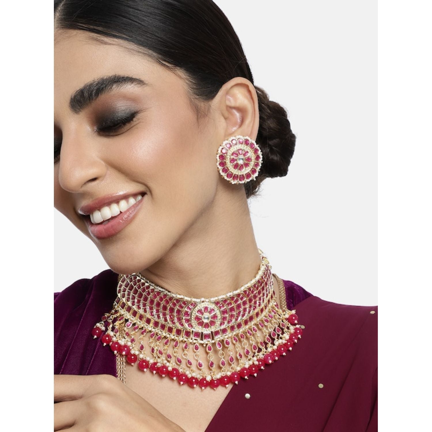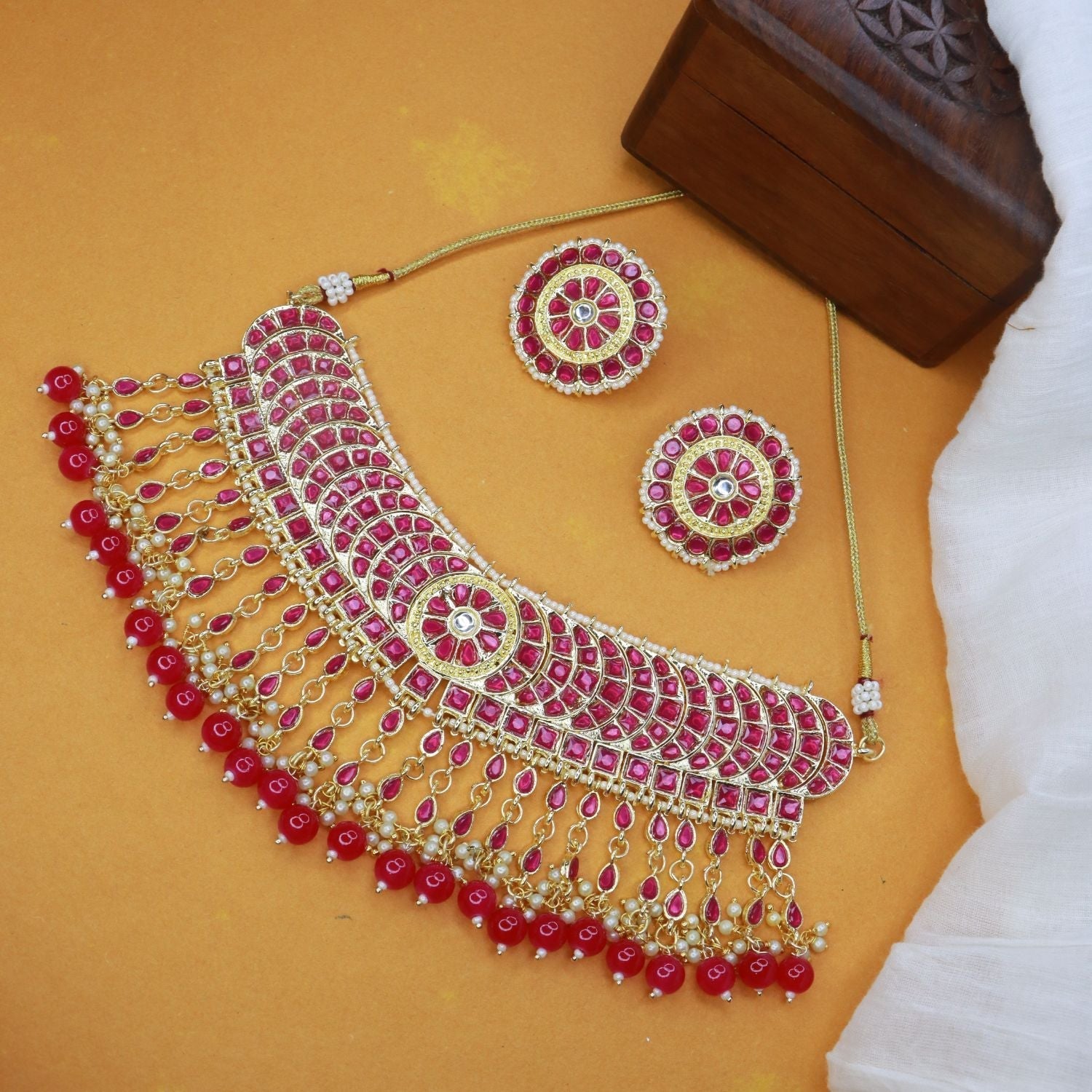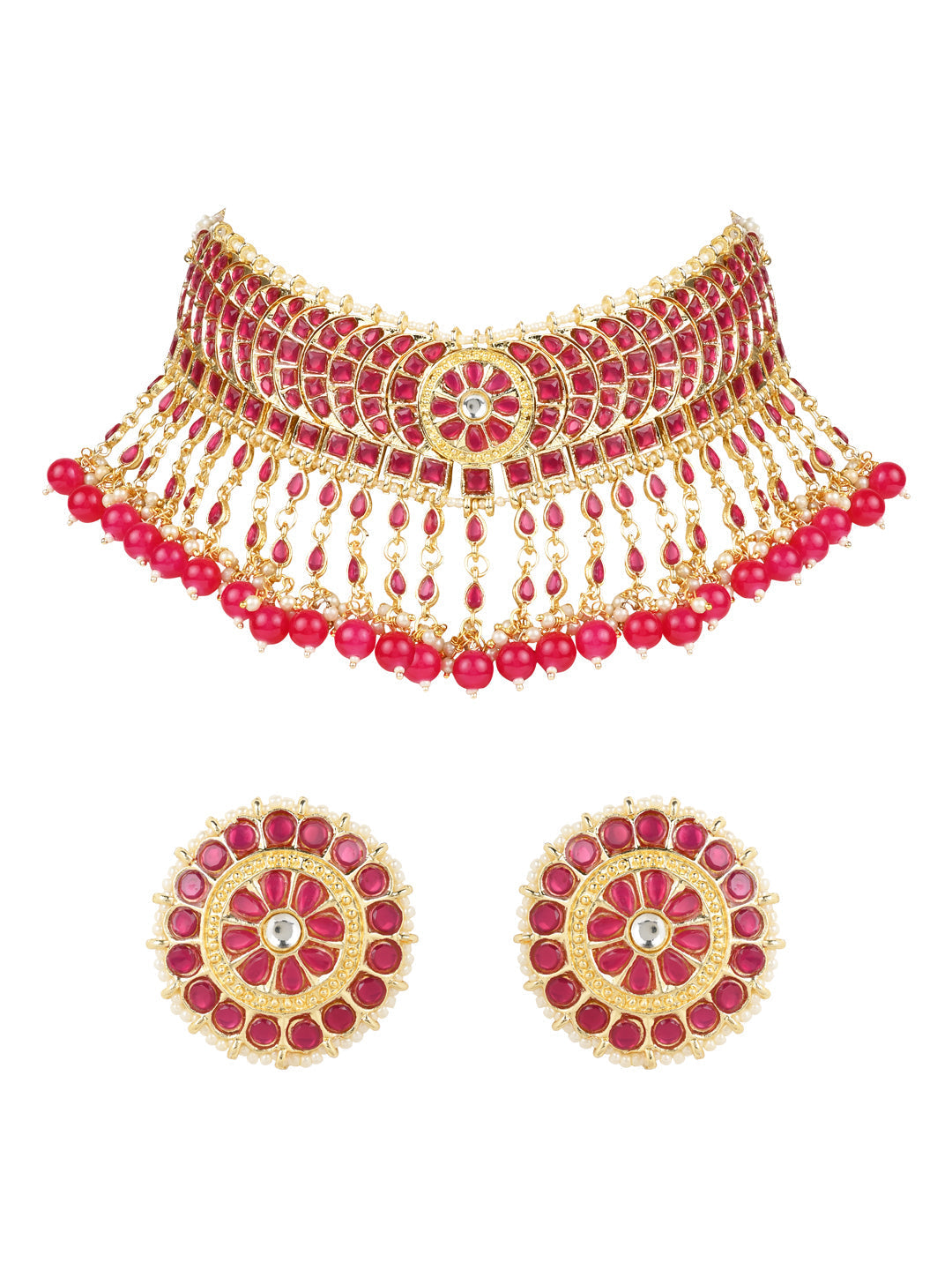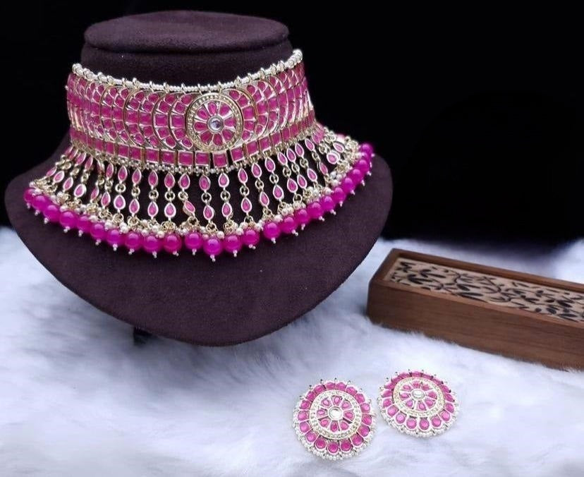 DIMENSIONS: Necklace Length - 19 Cm x Width - 7 Cm, Earrings Height - 3.5 Cm x Width - 3.5 Cm. The gold plated choker necklace set consists of a necklace, a pair of earrings. The necklace features kundan studded with pearl beaded in it, giving it an elegant and traditional look. The stones and pearls are set in a beautiful pattern, adding a touch of sophistication and grace to the necklace. The necklace is secured with drawstring closures, which make it easy to adjust the size to fit comfortably around the neck. This is an important feature, as it ensures that the necklace will be comfortable to wear for extended periods of time. The necklace is secured with drawstring closures, which make it easy to adjust the size to fit comfortably around the neck. This is an important feature, as it ensures that the necklace will be comfortable to wear for extended periods of time. The earrings are also adorned with kundan and pearls, which match the pattern of the necklace. The earrings have a stud design, which makes them easy and comfortable to wear.
