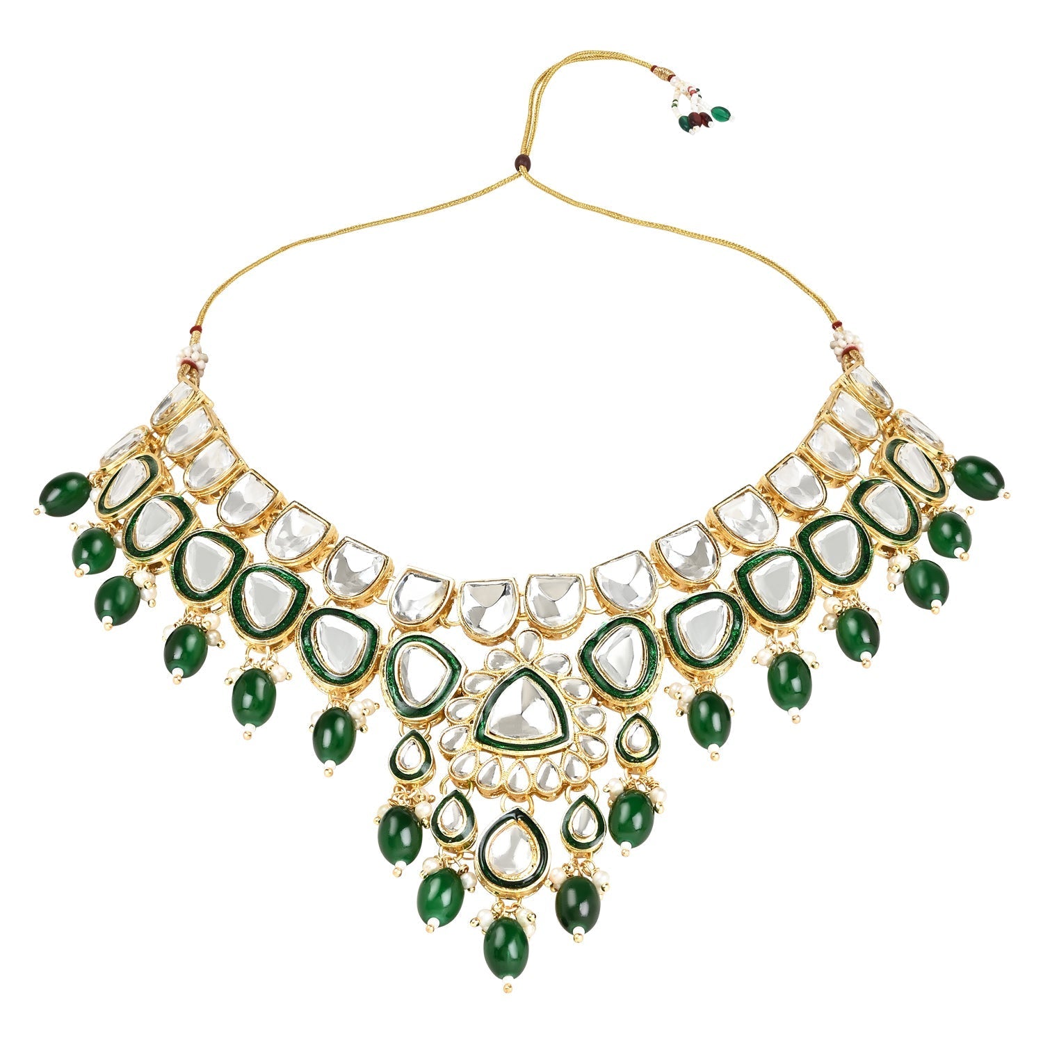 Elevate your traditional look with the included maang tikka. The delicate design, combined with the radiant Kundan and pearl elements, adds a touch of royalty to your hairstyle, making you the center of attention at any event. The choker necklace features a statement design that gracefully encircles the neck, creating a striking focal point. The gold-plated finish adds a touch of luxury, making it the perfect accessory for weddings, festivals, or any special celebration.