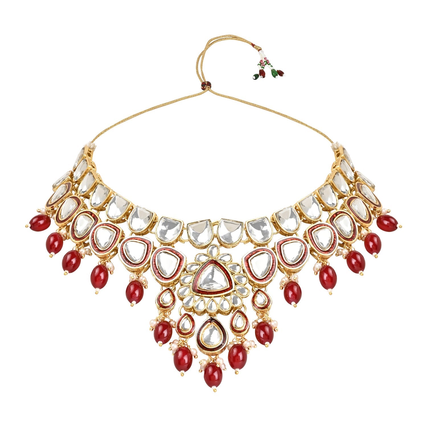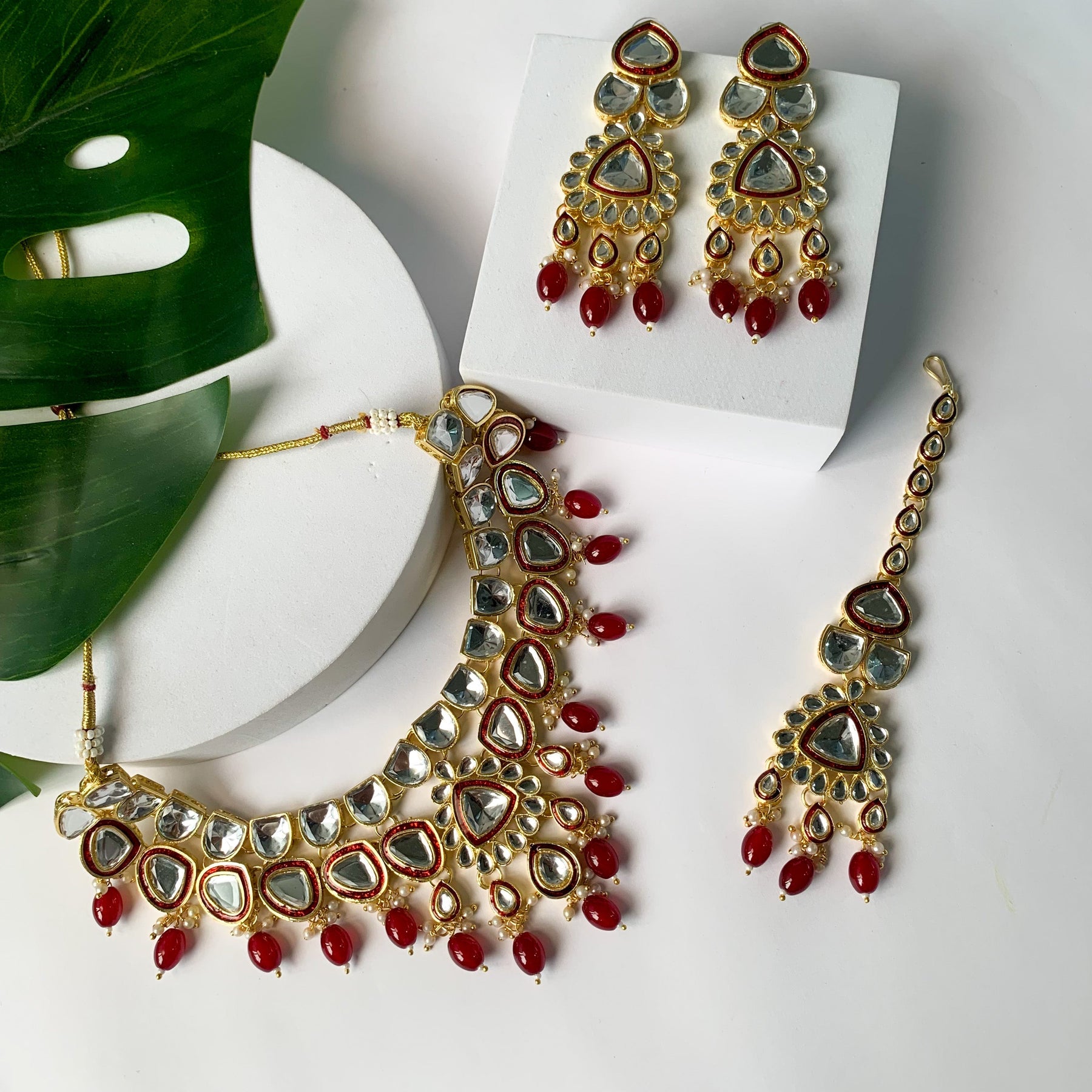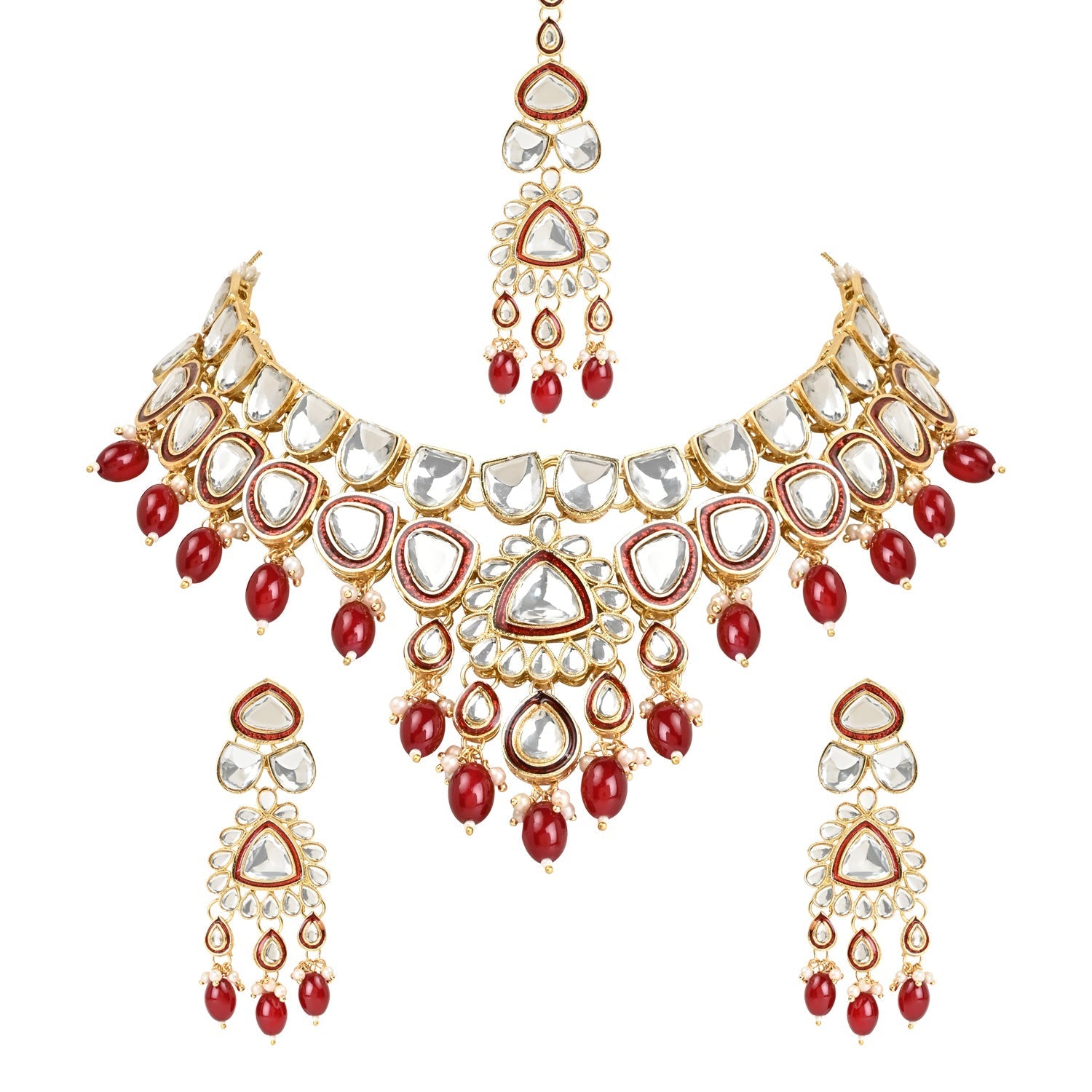 Elevate your traditional look with the included maang tikka. The delicate design, combined with the radiant Kundan and pearl elements, adds a touch of royalty to your hairstyle, making you the center of attention at any event. The choker necklace features a statement design that gracefully encircles the neck, creating a striking focal point. The gold-plated finish adds a touch of luxury, making it the perfect accessory for weddings, festivals, or any special celebration.