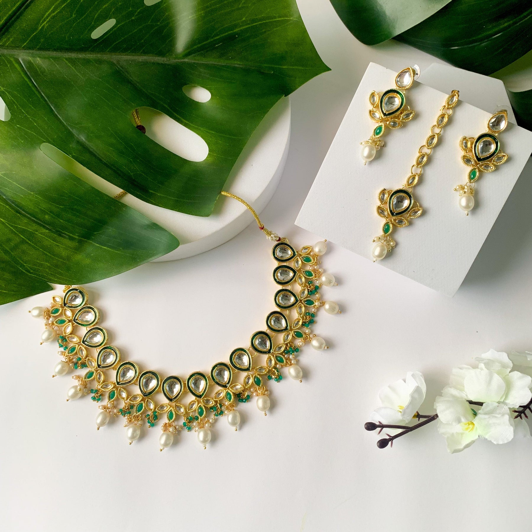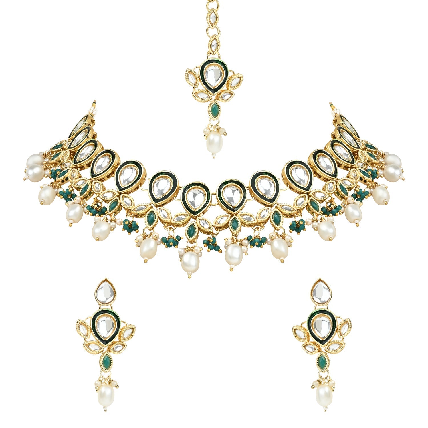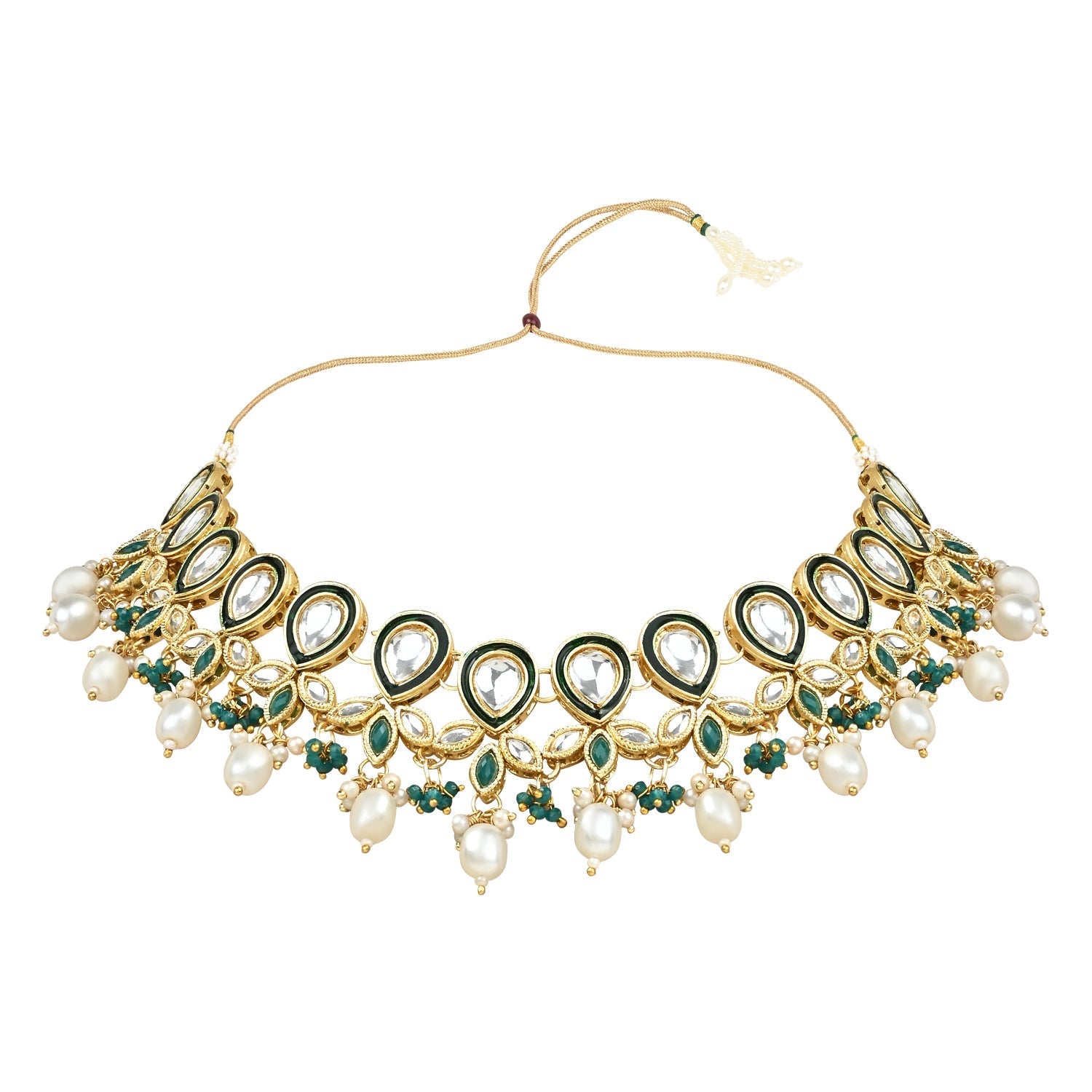 This Exquisite Bridal Jewelry Set Features A Stunning Gold-Plated Choker Necklace Adorned With Traditional White Kundan And Stone Embellishments. The Necklace Is A Embellished With Sparkling Kundan Stones And Pearls. The Necklace Are Matching Jhumka Earrings That Perfectly Complement The Overall Design. These Jhumka Earrings Feature Intricate Kundan And Stone Work, With Delicate Pearl Hangings That Add Movement And Charm To The Set. The Combination Of White Kundan Stones, Pearls, And Gold Plating Creates A Timeless And Regal Look, Making This Jewelry Set Ideal For A Bride Or Anyone Seeking To Make A Statement On A Special Occasion. The Intricate Craftsmanship And Attention To Detail Ensure That This Set Stands Out, Adding A Touch Of Traditional Charm.