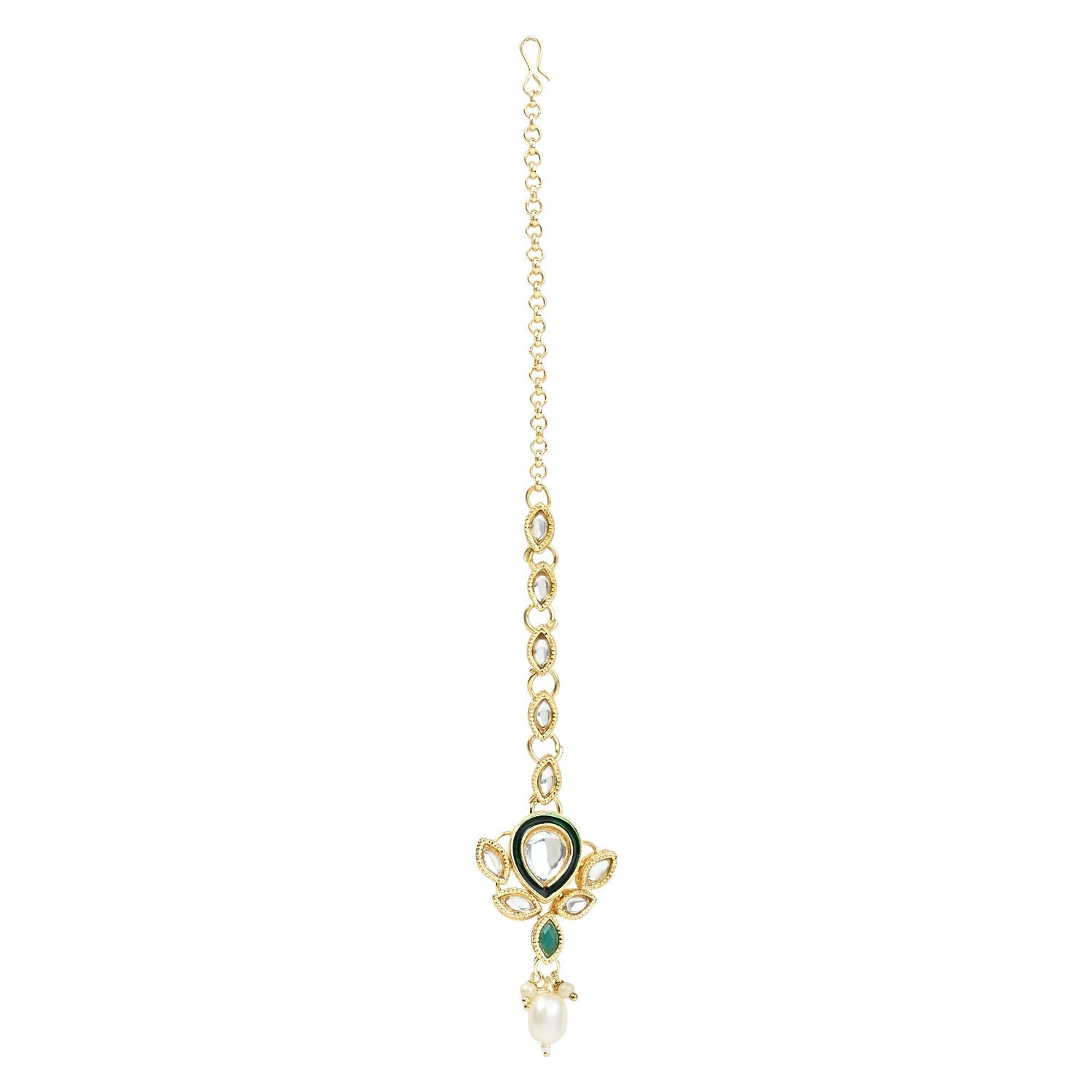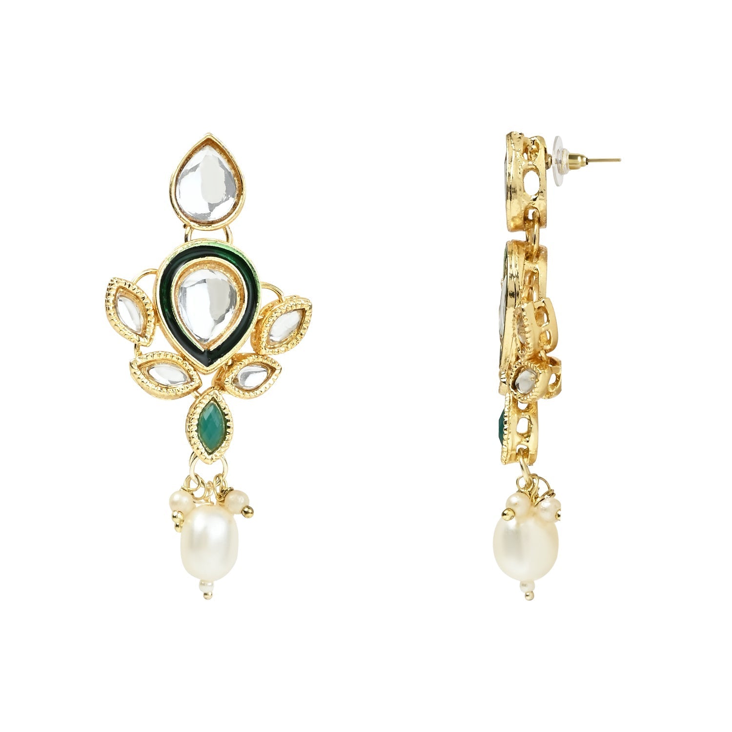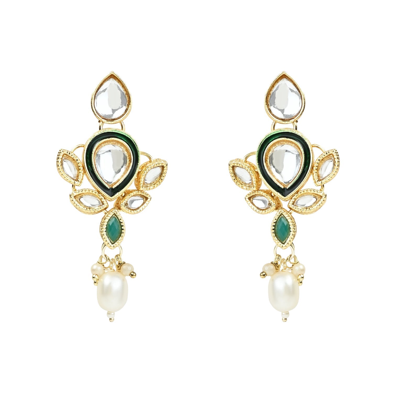 This Exquisite Bridal Jewelry Set Features A Stunning Gold-Plated Choker Necklace Adorned With Traditional White Kundan And Stone Embellishments. The Necklace Is A Embellished With Sparkling Kundan Stones And Pearls. The Necklace Are Matching Jhumka Earrings That Perfectly Complement The Overall Design. These Jhumka Earrings Feature Intricate Kundan And Stone Work, With Delicate Pearl Hangings That Add Movement And Charm To The Set. The Combination Of White Kundan Stones, Pearls, And Gold Plating Creates A Timeless And Regal Look, Making This Jewelry Set Ideal For A Bride Or Anyone Seeking To Make A Statement On A Special Occasion. The Intricate Craftsmanship And Attention To Detail Ensure That This Set Stands Out, Adding A Touch Of Traditional Charm.