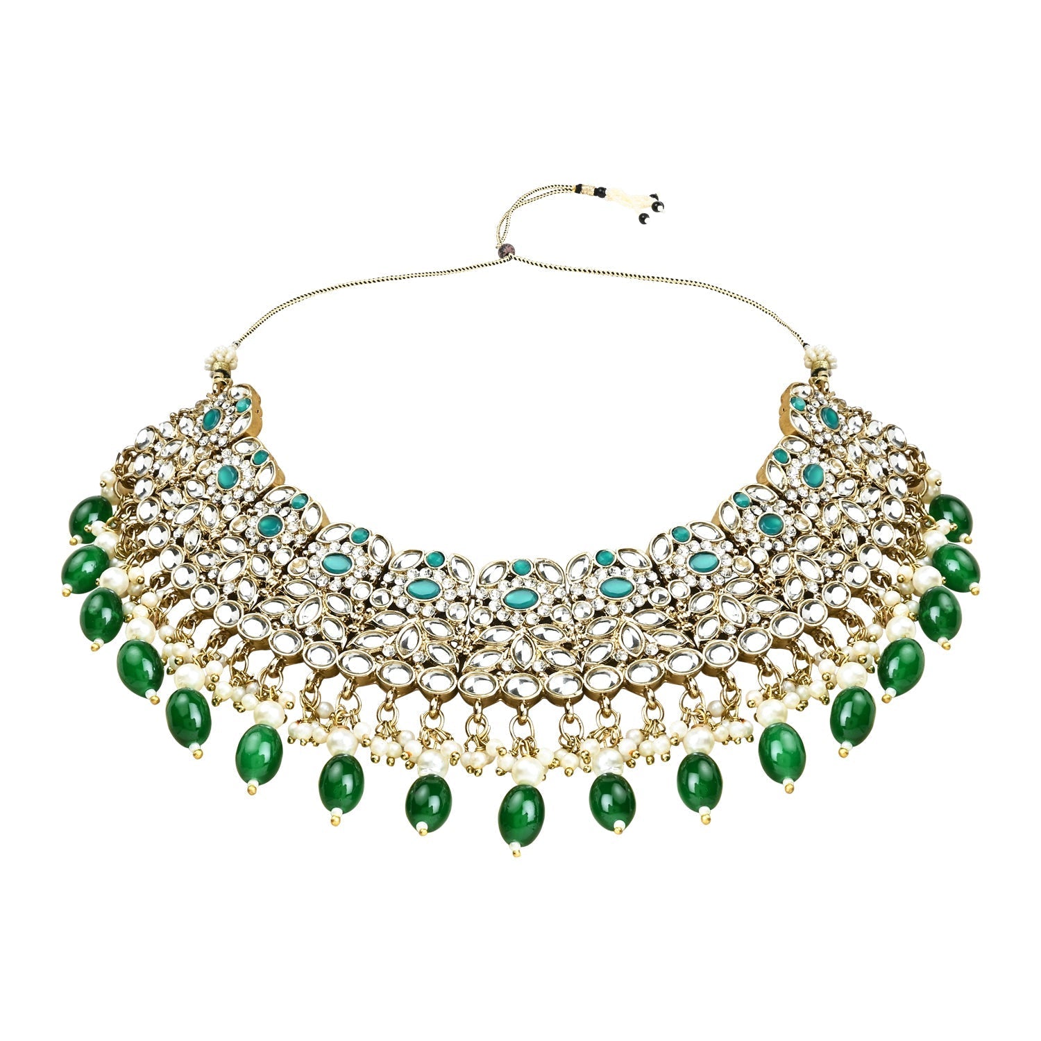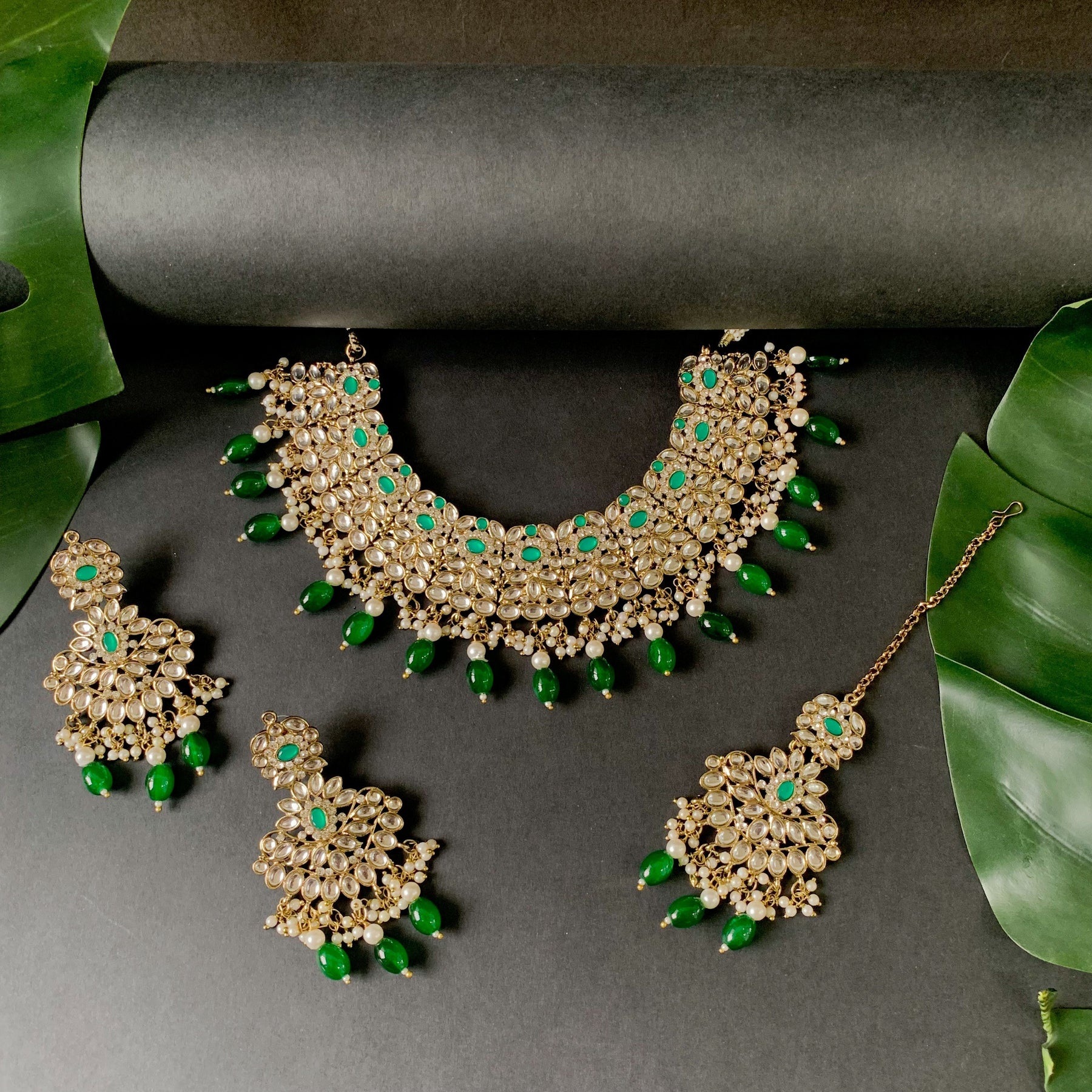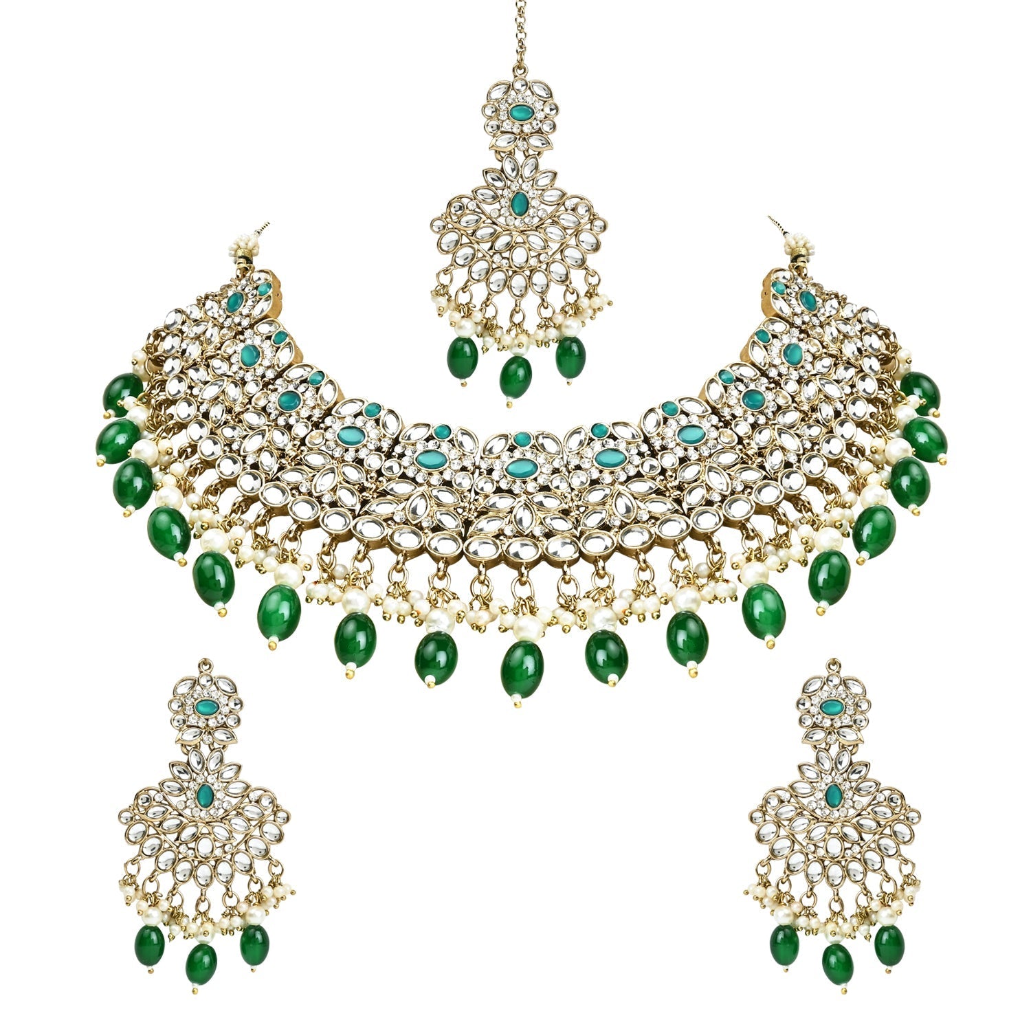 Elevate your traditional look with the included maang tikka. The delicate design, combined with the radiant Kundan and pearl elements, adds a touch of royalty to your hairstyle, making you the center of attention at any event. The choker necklace features a statement design that gracefully encircles the neck, creating a striking focal point. The gold-plated finish adds a touch of luxury, making it the perfect accessory for weddings, festivals, or any special celebration.