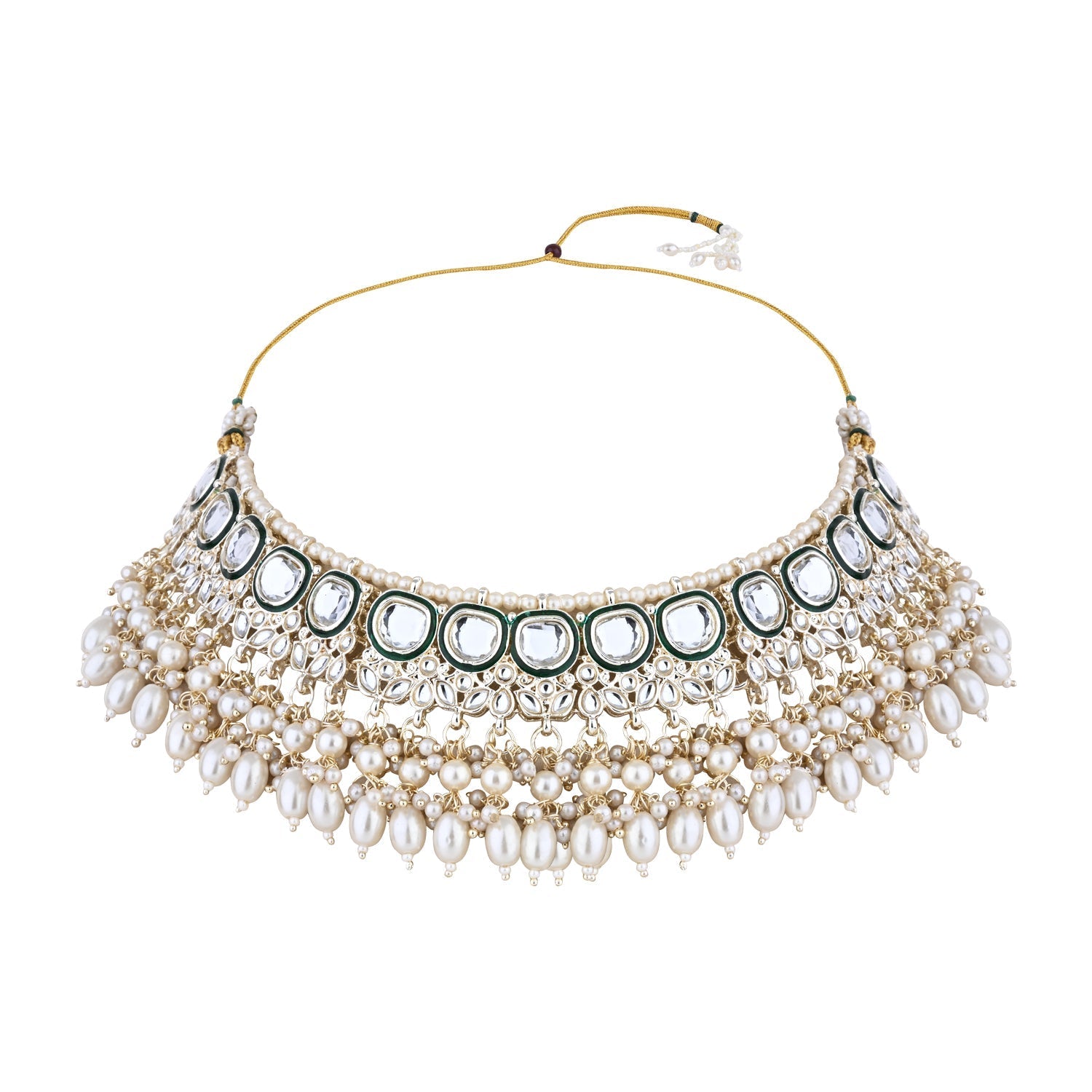 This Traditional Meenakari Kundan And Pearl Choker Necklace Set Is A Perfect Blend Of Heritage Craftsmanship And Timeless Elegance. Intricately Designed With Vibrant Meenakari Work, The Necklace Features Finely Crafted Kundan Stones That Beautifully, Surrounded By Pearls For Added Grace. The Choker-Style Design Sits Snugly On The Neck, Making It An Ideal Choice For Weddings, Festivals, Or Special Occasions. The Combination Of Rich Colors, Delicate Pearls, And Intricate Detailing Offers A Regal Touch, Making It A Must-Have Accessory For Women Who Appreciate Traditional And Luxurious Jewellery.