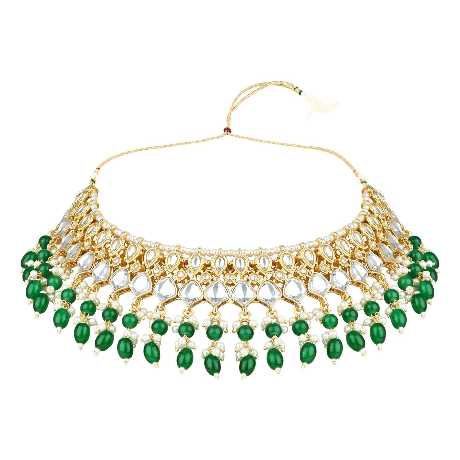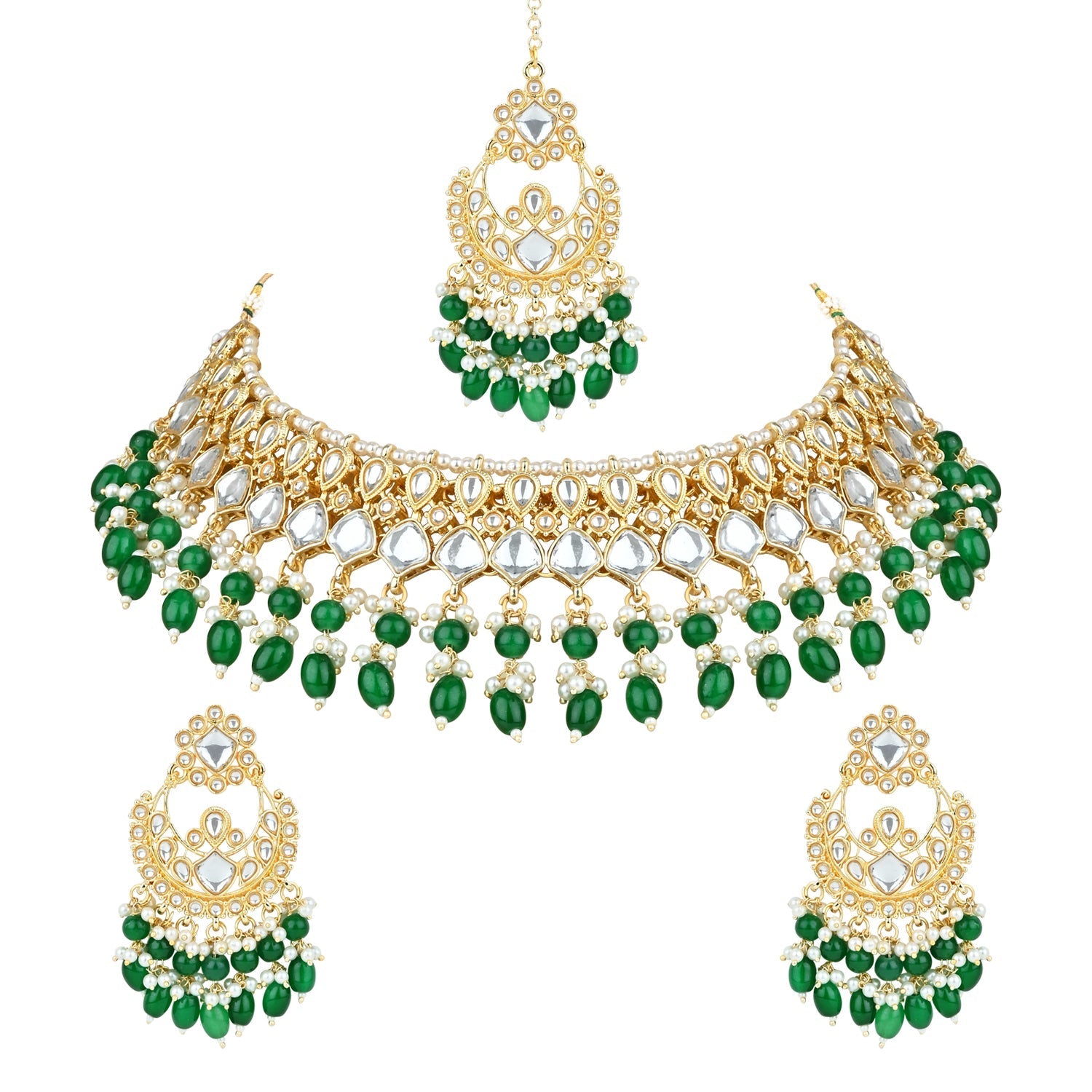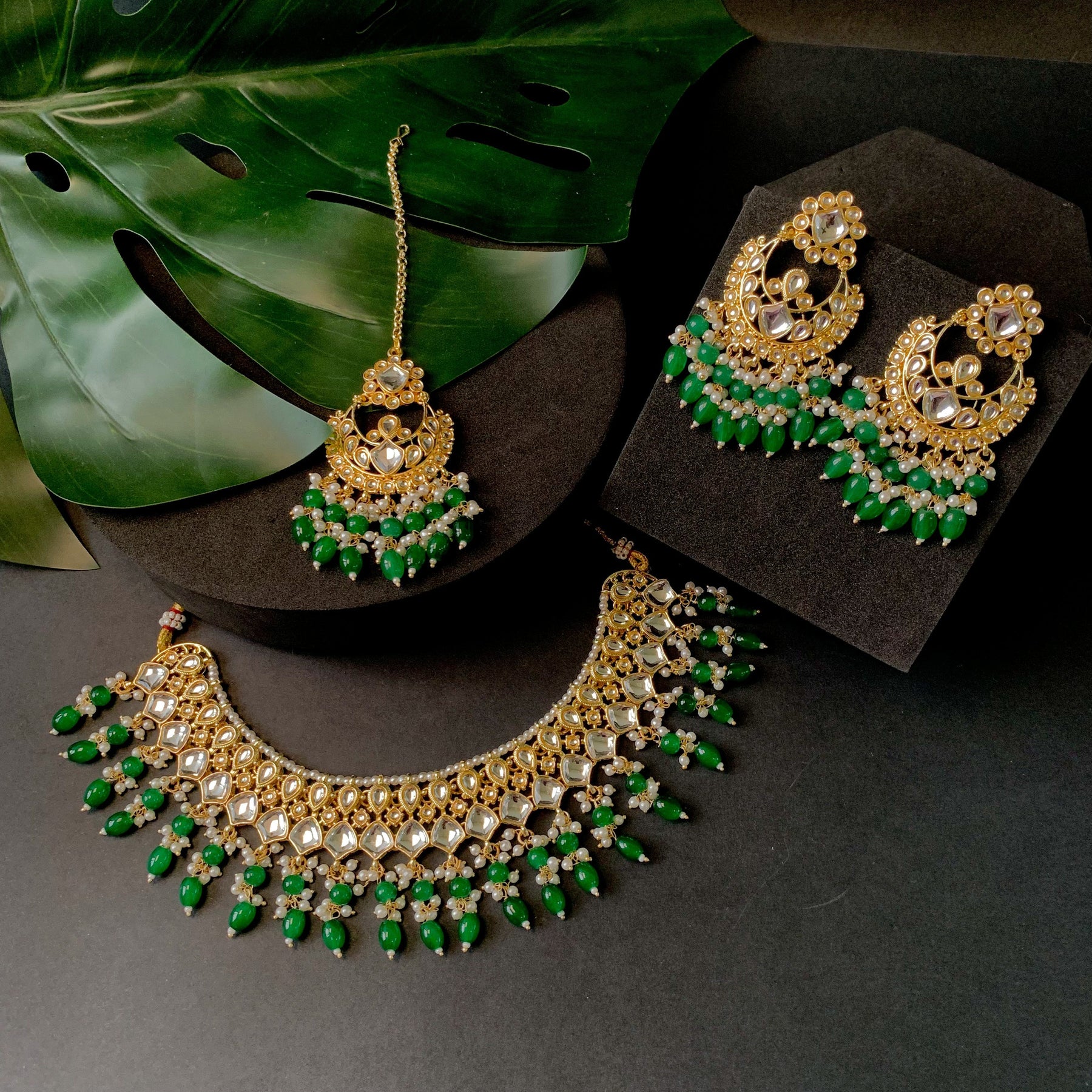 The gold-plated choker necklace set consists of a necklace, a pair of earrings, and a maang tikka. The necklace features kundan studded with pearl beaded in it, giving it an elegant and traditional look. The stones and pearls are set in a beautiful pattern, adding a touch of sophistication and grace to the necklace. The necklace is secured with drawstring closures, which make it easy to adjust the size to fit comfortably around the neck. This is an important feature, as it ensures that the necklace will be comfortable to wear for extended periods of time. The necklace is secured with drawstring closures, which make it easy to adjust the size to fit comfortably around the neck. This is an important feature, as it ensures that the necklace will be comfortable to wear for extended periods of time. The earrings and maang tikka are also adorned with stones and pearls, which match the pattern of the necklace. The earrings have a beautiful design, which makes them easy and comfortable to wear. The maang tikka is a traditional Indian hair accessory that can be worn with the necklace and earrings to complete the look.