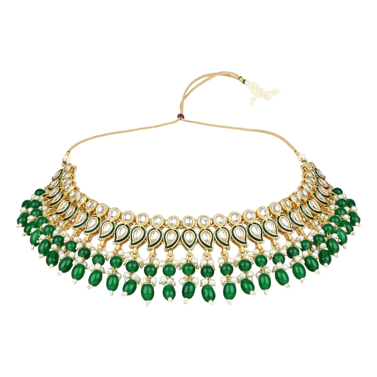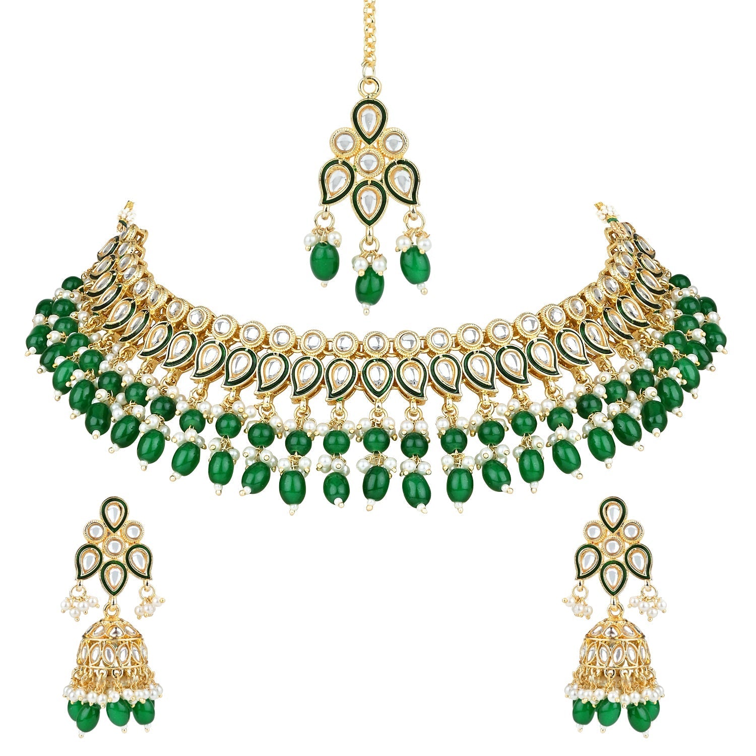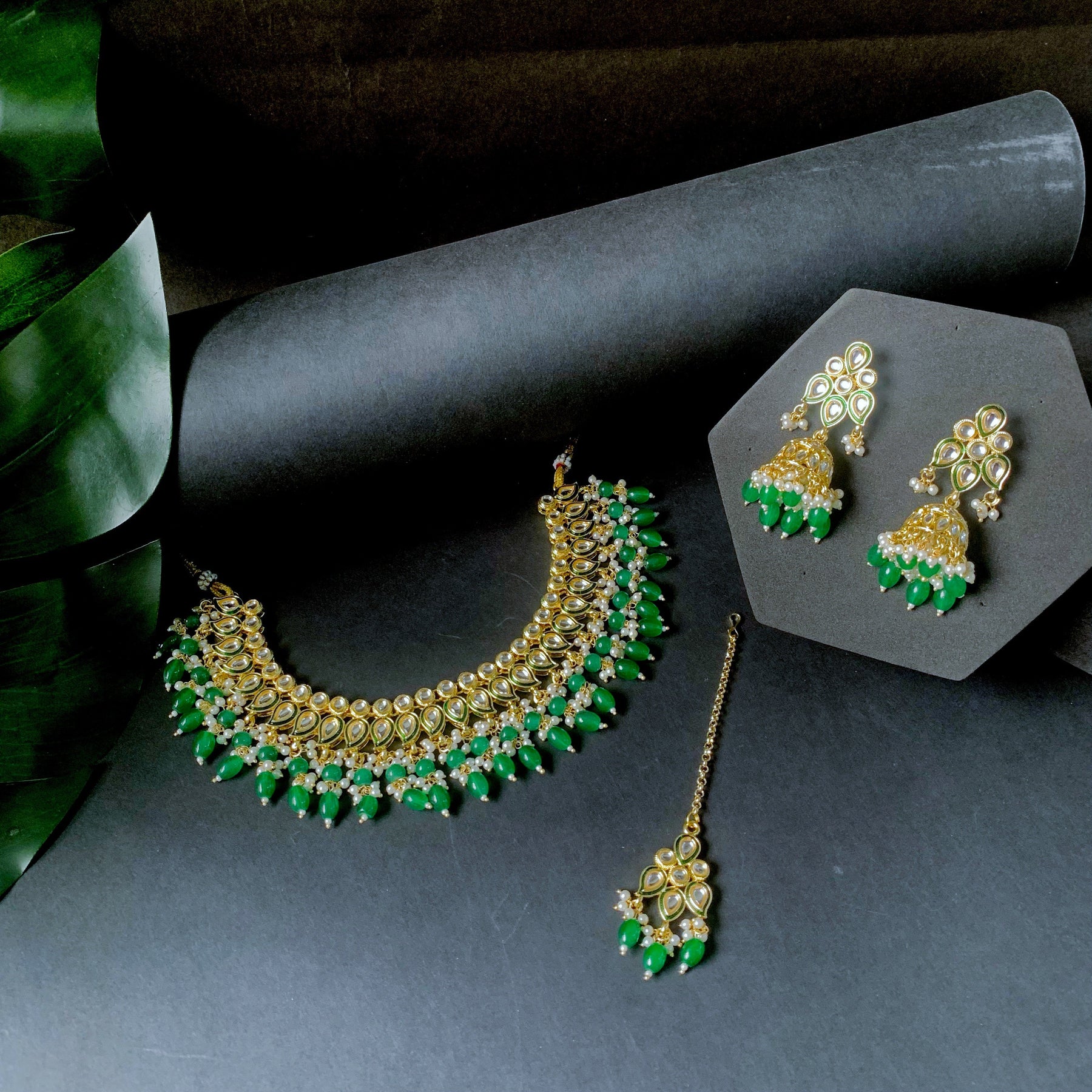 The gold-plated choker necklace set consists of a necklace, a pair of earrings, and a maang tikka. The necklace features kundan studded with pearl beaded in it, giving it an elegant and traditional look. The stones and pearls are set in a beautiful pattern, adding a touch of sophistication and grace to the necklace. The necklace is secured with drawstring closures, which make it easy to adjust the size to fit comfortably around the neck. This is an important feature, as it ensures that the necklace will be comfortable to wear for extended periods of time. The necklace is secured with drawstring closures, which make it easy to adjust the size to fit comfortably around the neck. This is an important feature, as it ensures that the necklace will be comfortable to wear for extended periods of time. The earrings and maang tikka are also adorned with stones and pearls, which match the pattern of the necklace. The earrings have a beautiful design, which makes them easy and comfortable to wear. The maang tikka is a traditional Indian hair accessory that can be worn with the necklace and earrings to complete the look.