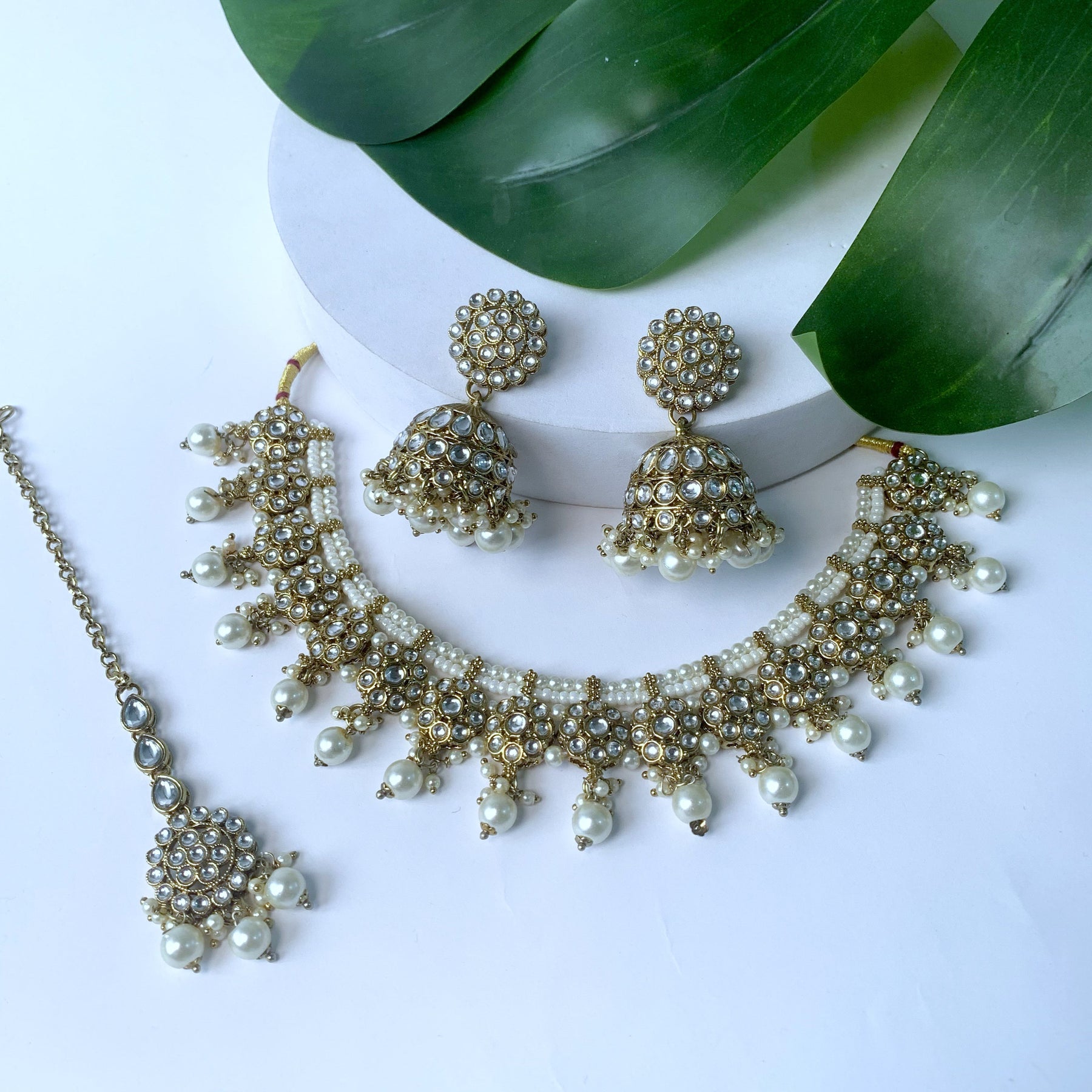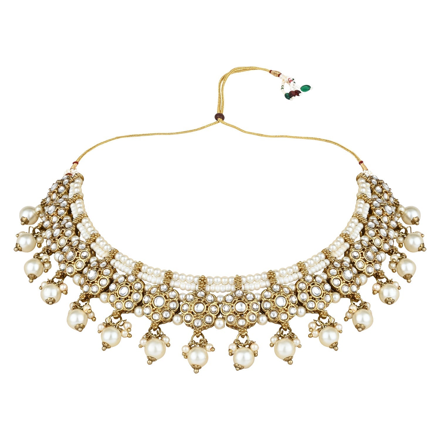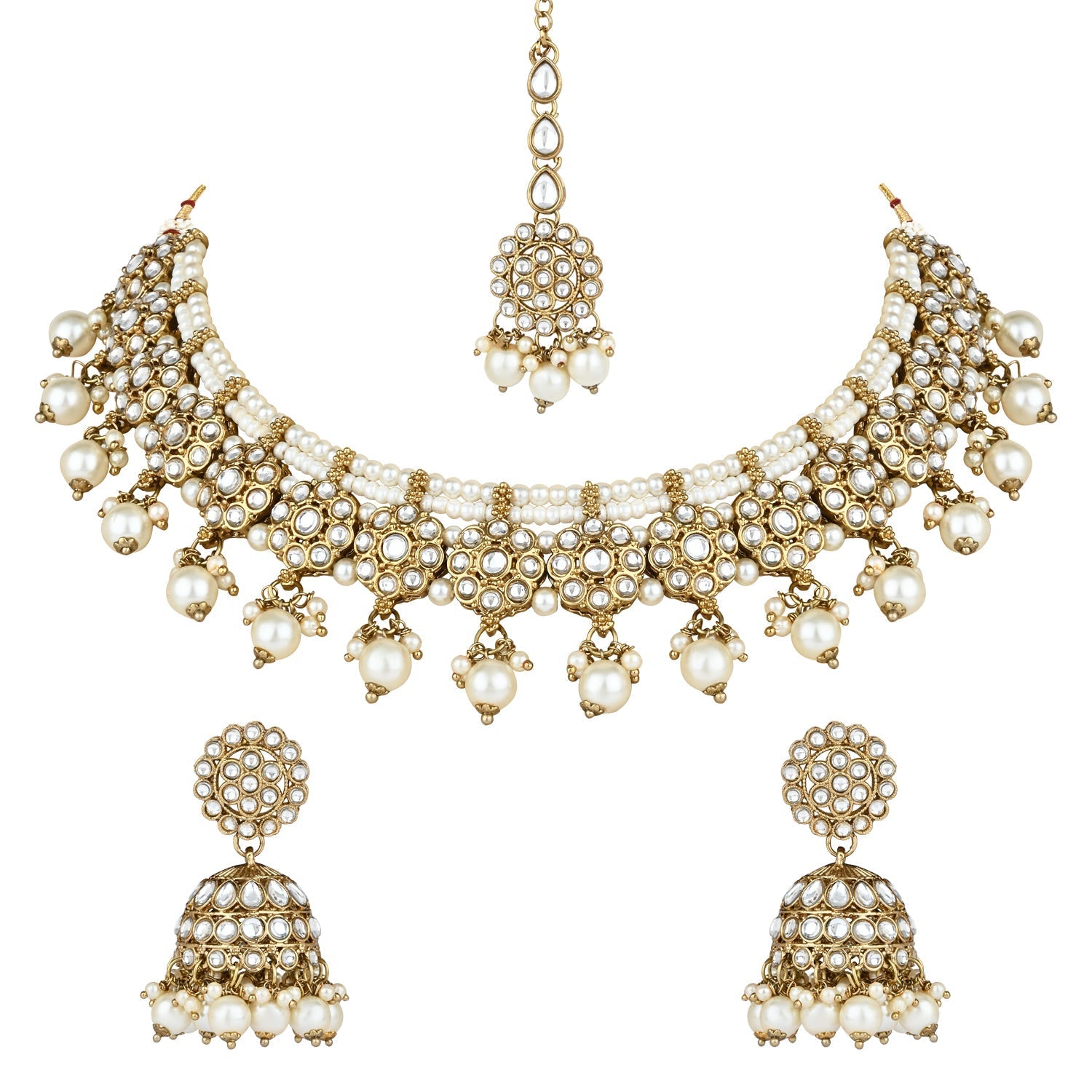 The gold-plated choker necklace set consists of a necklace, a pair of earrings, and a maang tikka. The necklace features kundan studded with pearl beaded in it, giving it an elegant and traditional look. The stones and pearls are set in a beautiful pattern, adding a touch of sophistication and grace to the necklace. The necklace is secured with drawstring closures, which make it easy to adjust the size to fit comfortably around the neck. This is an important feature, as it ensures that the necklace will be comfortable to wear for extended periods of time. The necklace is secured with drawstring closures, which make it easy to adjust the size to fit comfortably around the neck. This is an important feature, as it ensures that the necklace will be comfortable to wear for extended periods of time. The earrings and maang tikka are also adorned with stones and pearls, which match the pattern of the necklace. The earrings have a beautiful design, which makes them easy and comfortable to wear. The maang tikka is a traditional Indian hair accessory that can be worn with the necklace and earrings to complete the look.