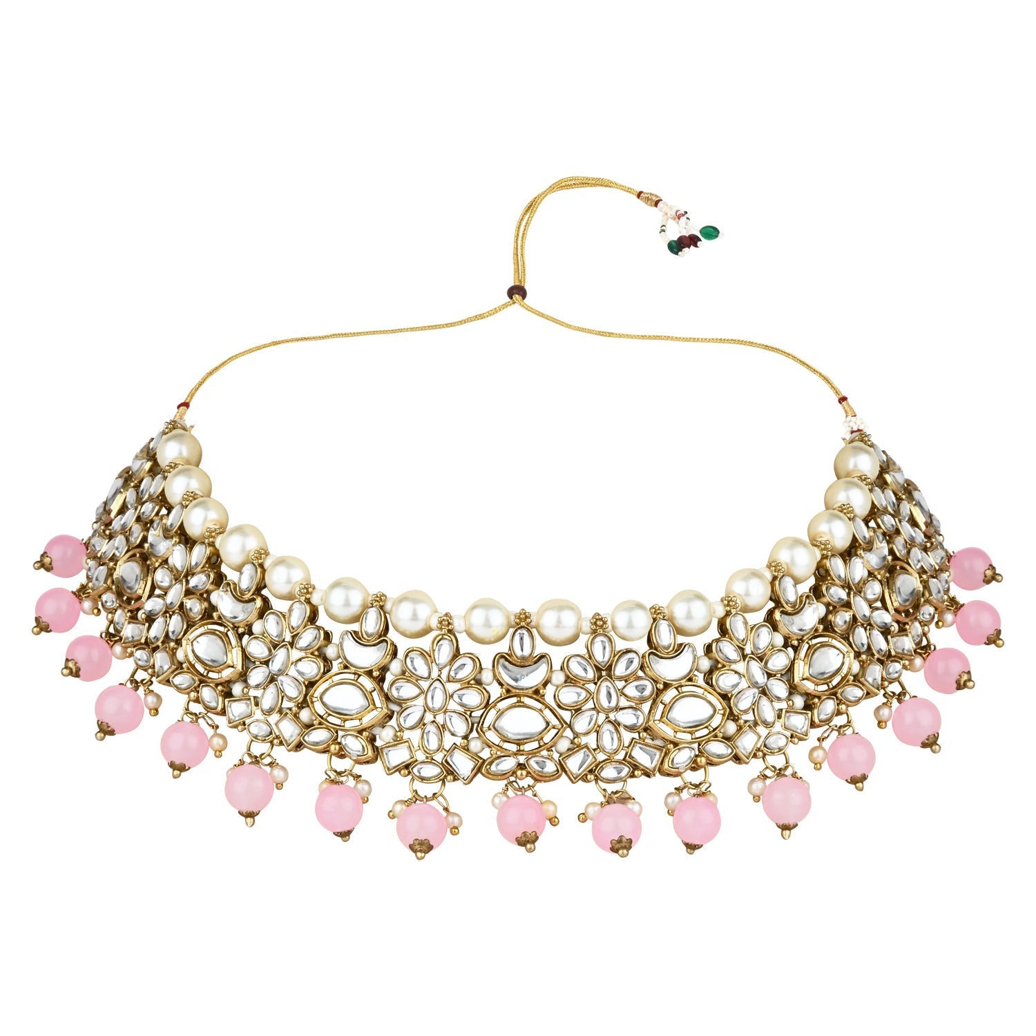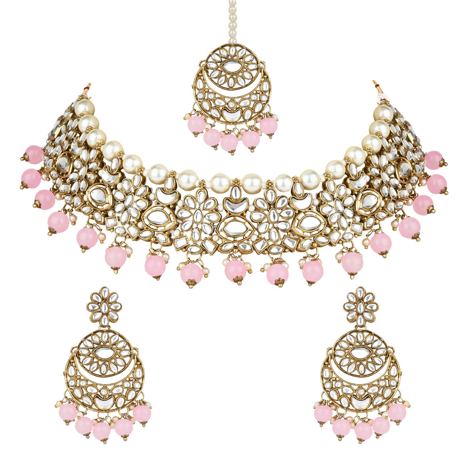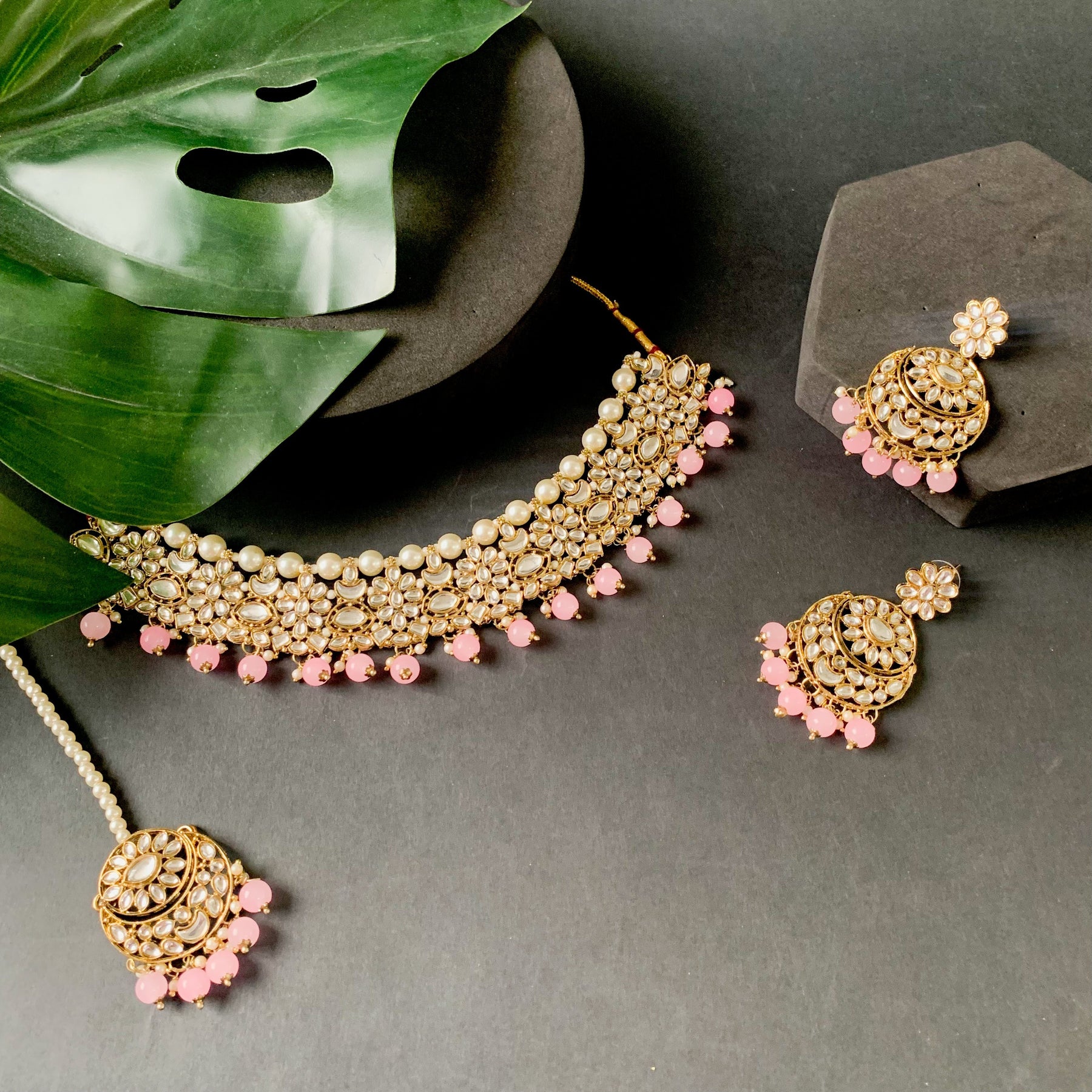 The gold-plated choker necklace set consists of a necklace, a pair of earrings, and a maang tikka. The necklace features kundan studded with pearl beaded in it, giving it an elegant and traditional look. The stones and pearls are set in a beautiful pattern, adding a touch of sophistication and grace to the necklace. The necklace is secured with drawstring closures, which make it easy to adjust the size to fit comfortably around the neck. This is an important feature, as it ensures that the necklace will be comfortable to wear for extended periods of time. The necklace is secured with drawstring closures, which make it easy to adjust the size to fit comfortably around the neck. This is an important feature, as it ensures that the necklace will be comfortable to wear for extended periods of time. The earrings and maang tikka are also adorned with stones and pearls, which match the pattern of the necklace. The earrings have a beautiful design, which makes them easy and comfortable to wear. The maang tikka is a traditional Indian hair accessory that can be worn with the necklace and earrings to complete the look.