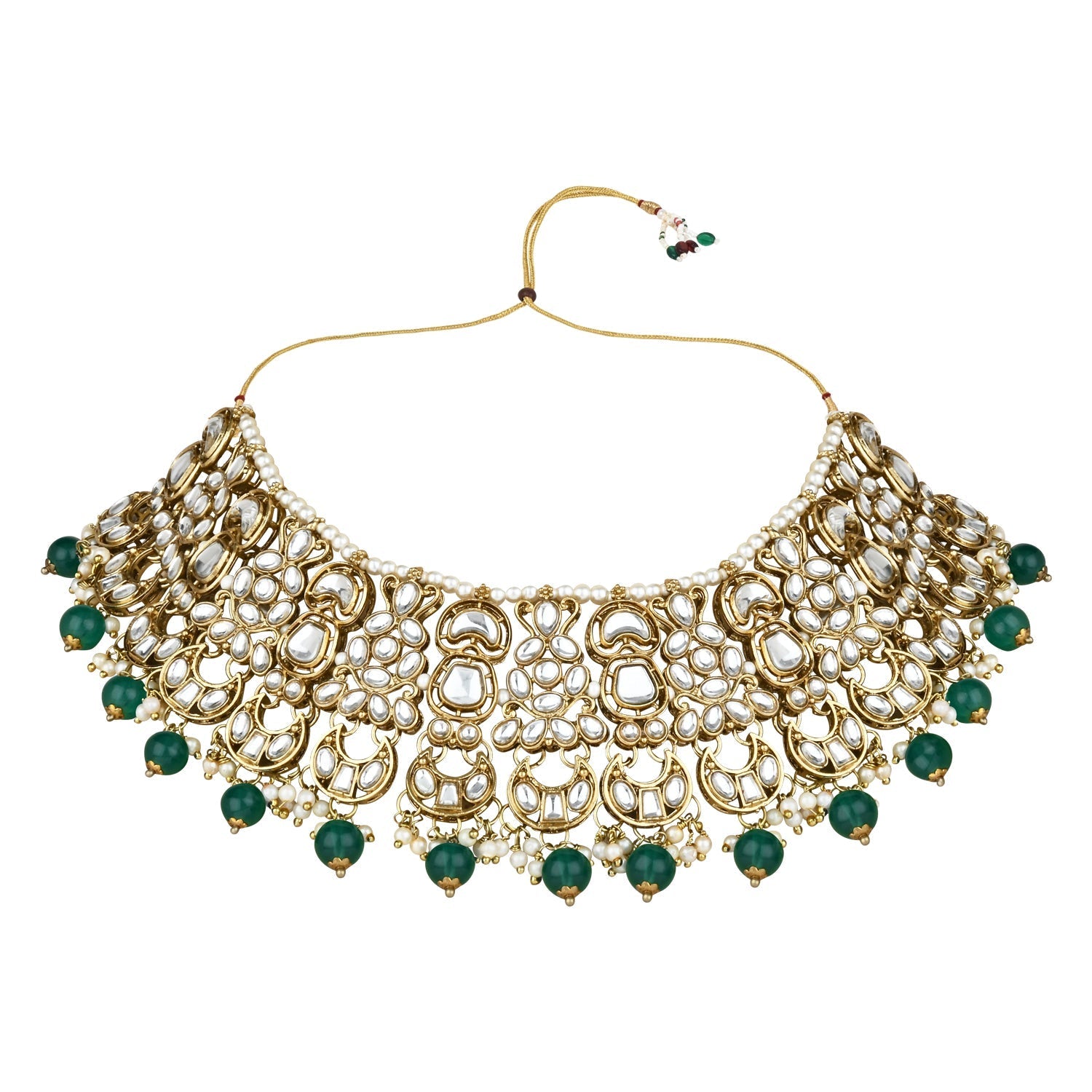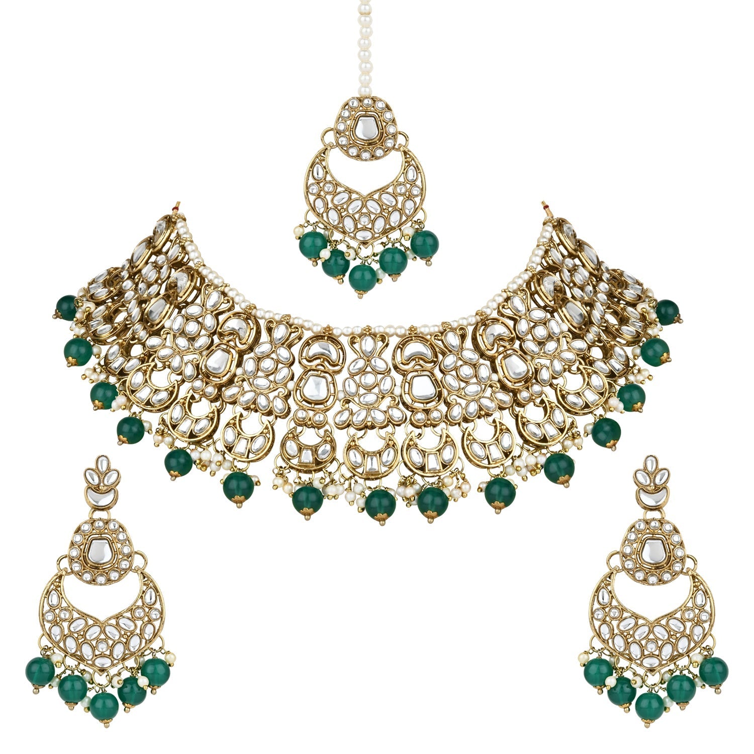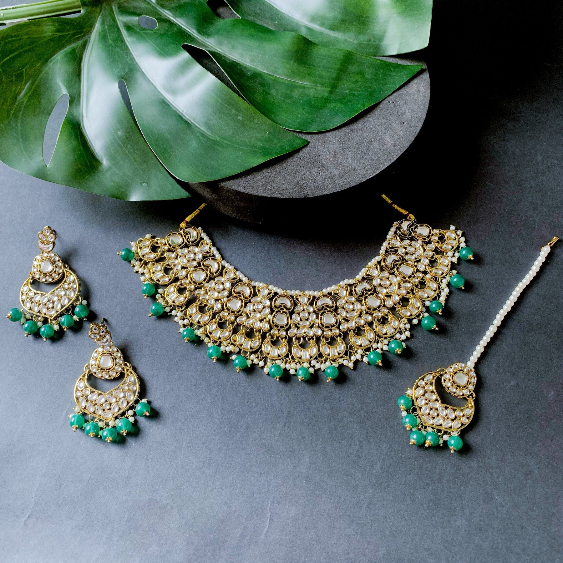 The gold-plated choker necklace set consists of a necklace, a pair of earrings, and a maang tikka. The necklace features kundan studded with pearl beaded in it, giving it an elegant and traditional look. The stones and pearls are set in a beautiful pattern, adding a touch of sophistication and grace to the necklace. The necklace is secured with drawstring closures, which make it easy to adjust the size to fit comfortably around the neck. This is an important feature, as it ensures that the necklace will be comfortable to wear for extended periods of time. The necklace is secured with drawstring closures, which make it easy to adjust the size to fit comfortably around the neck. This is an important feature, as it ensures that the necklace will be comfortable to wear for extended periods of time. The earrings and maang tikka are also adorned with stones and pearls, which match the pattern of the necklace. The earrings have a beautiful design, which makes them easy and comfortable to wear. The maang tikka is a traditional Indian hair accessory that can be worn with the necklace and earrings to complete the look.