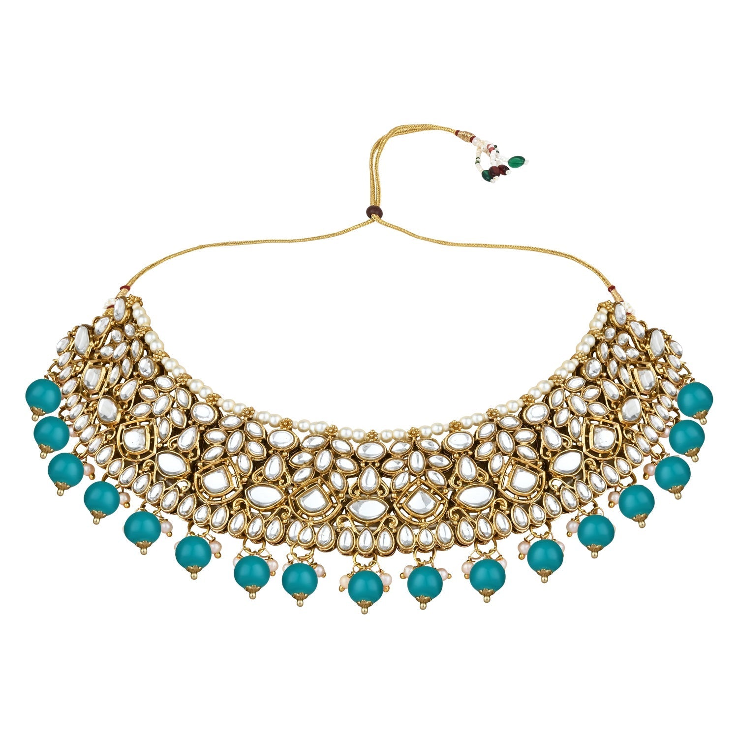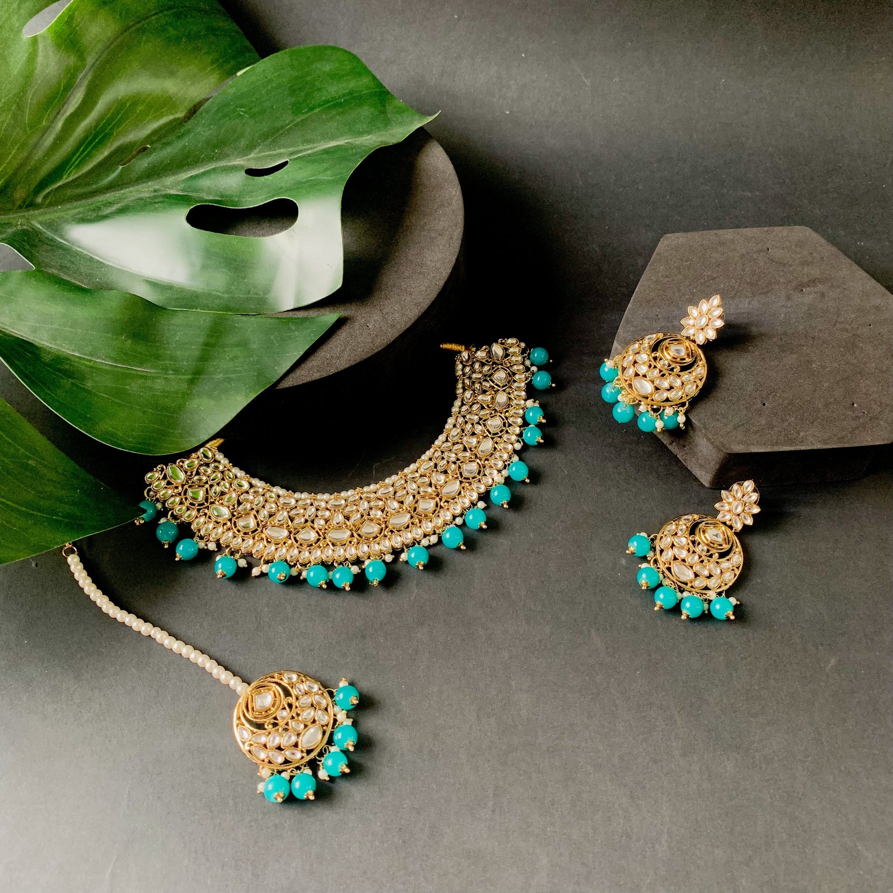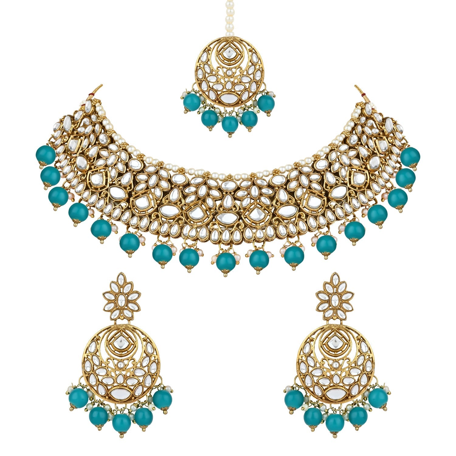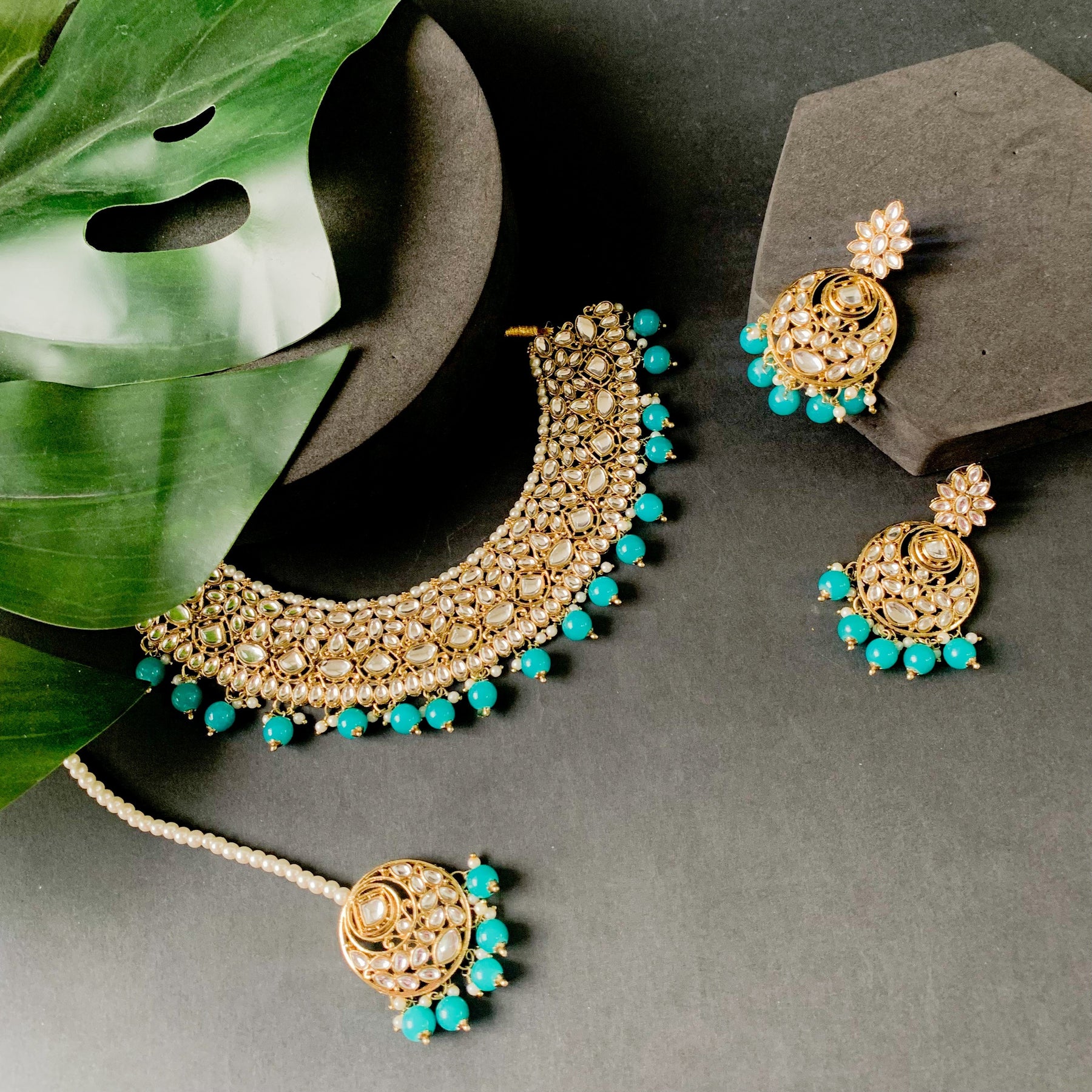 The gold-plated choker necklace set consists of a necklace, a pair of earrings, and a maang tikka. The necklace features kundan studded with pearl beaded in it, giving it an elegant and traditional look. The stones and pearls are set in a beautiful pattern, adding a touch of sophistication and grace to the necklace. The necklace is secured with drawstring closures, which make it easy to adjust the size to fit comfortably around the neck. This is an important feature, as it ensures that the necklace will be comfortable to wear for extended periods of time. The necklace is secured with drawstring closures, which make it easy to adjust the size to fit comfortably around the neck. This is an important feature, as it ensures that the necklace will be comfortable to wear for extended periods of time. The earrings and maang tikka are also adorned with stones and pearls, which match the pattern of the necklace. The earrings have a beautiful design, which makes them easy and comfortable to wear. The maang tikka is a traditional Indian hair accessory that can be worn with the necklace and earrings to complete the look.