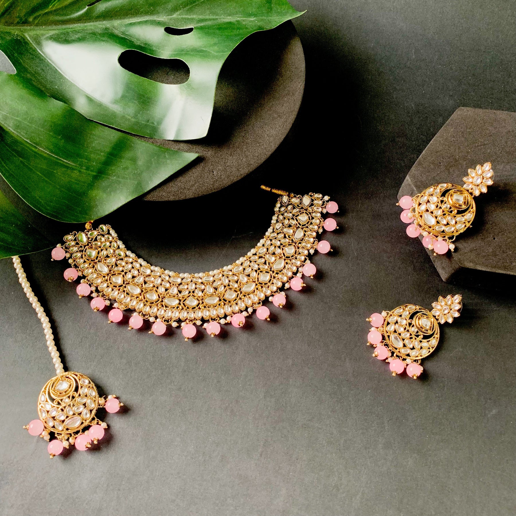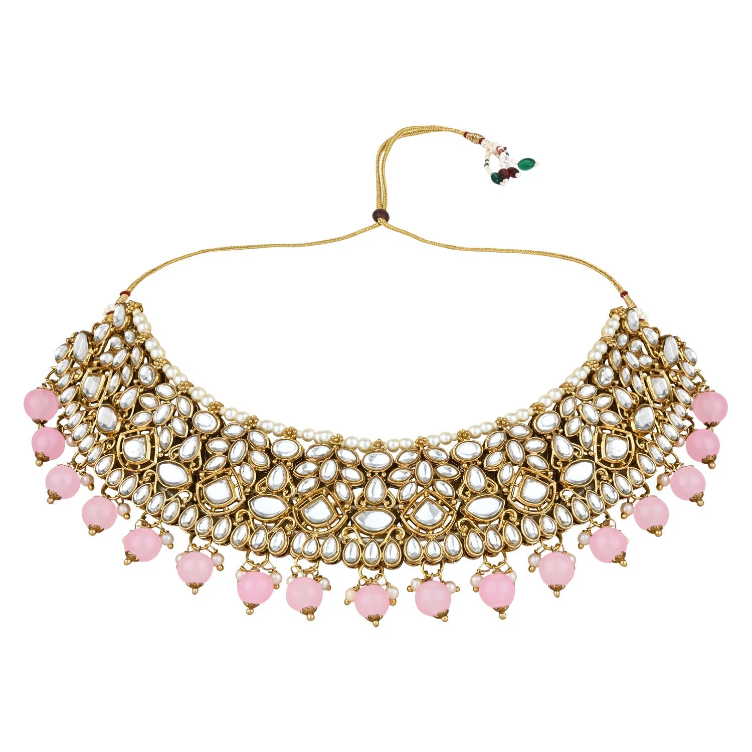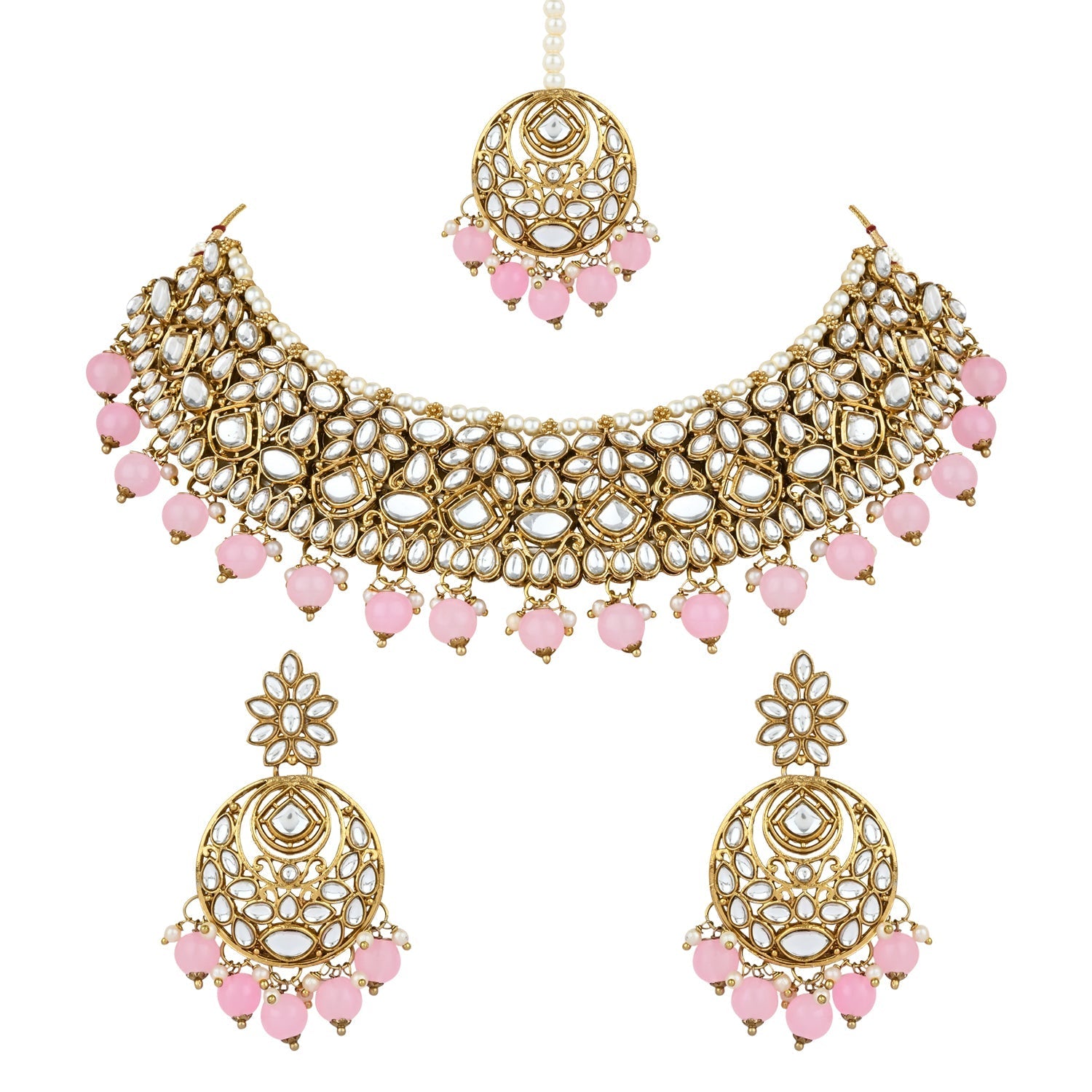 The gold-plated choker necklace set consists of a necklace, a pair of earrings, and a maang tikka. The necklace features kundan studded with pearl beaded in it, giving it an elegant and traditional look. The stones and pearls are set in a beautiful pattern, adding a touch of sophistication and grace to the necklace. The necklace is secured with drawstring closures, which make it easy to adjust the size to fit comfortably around the neck. This is an important feature, as it ensures that the necklace will be comfortable to wear for extended periods of time. The necklace is secured with drawstring closures, which make it easy to adjust the size to fit comfortably around the neck. This is an important feature, as it ensures that the necklace will be comfortable to wear for extended periods of time. The earrings and maang tikka are also adorned with stones and pearls, which match the pattern of the necklace. The earrings have a beautiful design, which makes them easy and comfortable to wear. The maang tikka is a traditional Indian hair accessory that can be worn with the necklace and earrings to complete the look.