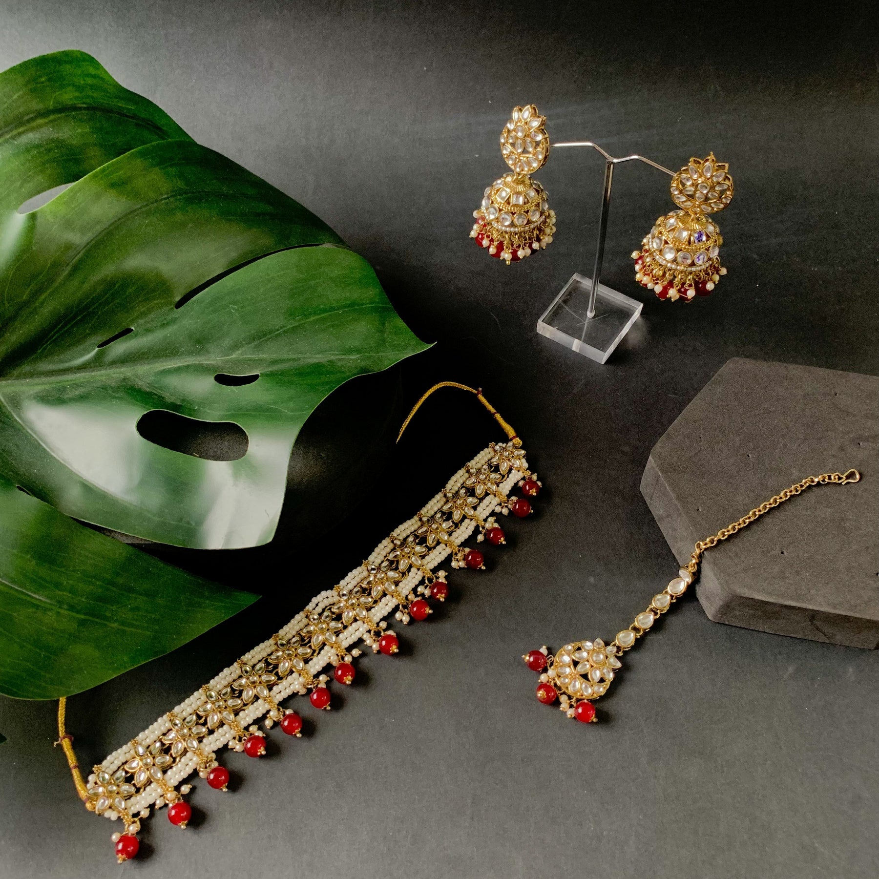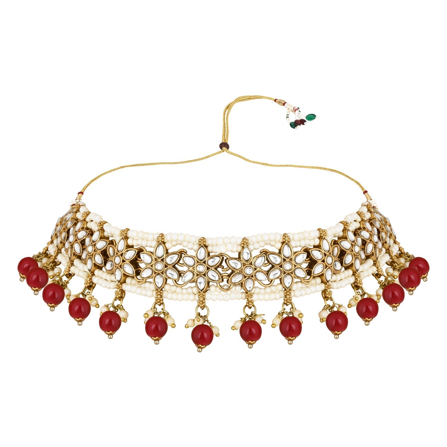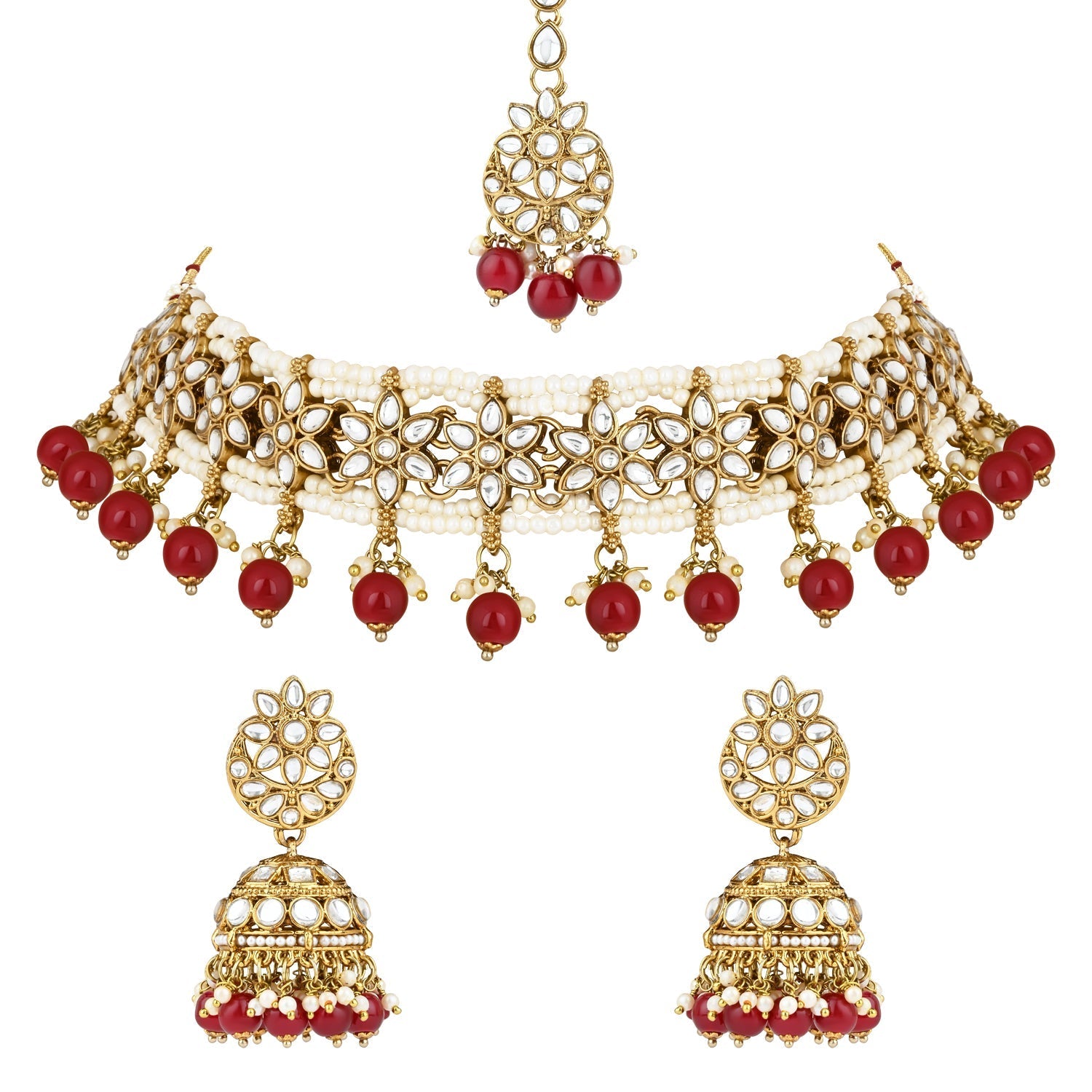 The gold-plated choker necklace set consists of a necklace, a pair of earrings, and a maang tikka. The necklace features kundan studded with pearl beaded in it, giving it an elegant and traditional look. The stones and pearls are set in a beautiful pattern, adding a touch of sophistication and grace to the necklace. The necklace is secured with drawstring closures, which make it easy to adjust the size to fit comfortably around the neck. This is an important feature, as it ensures that the necklace will be comfortable to wear for extended periods of time. The necklace is secured with drawstring closures, which make it easy to adjust the size to fit comfortably around the neck. This is an important feature, as it ensures that the necklace will be comfortable to wear for extended periods of time. The earrings and maang tikka are also adorned with stones and pearls, which match the pattern of the necklace. The earrings have a beautiful design, which makes them easy and comfortable to wear. The maang tikka is a traditional Indian hair accessory that can be worn with the necklace and earrings to complete the look.