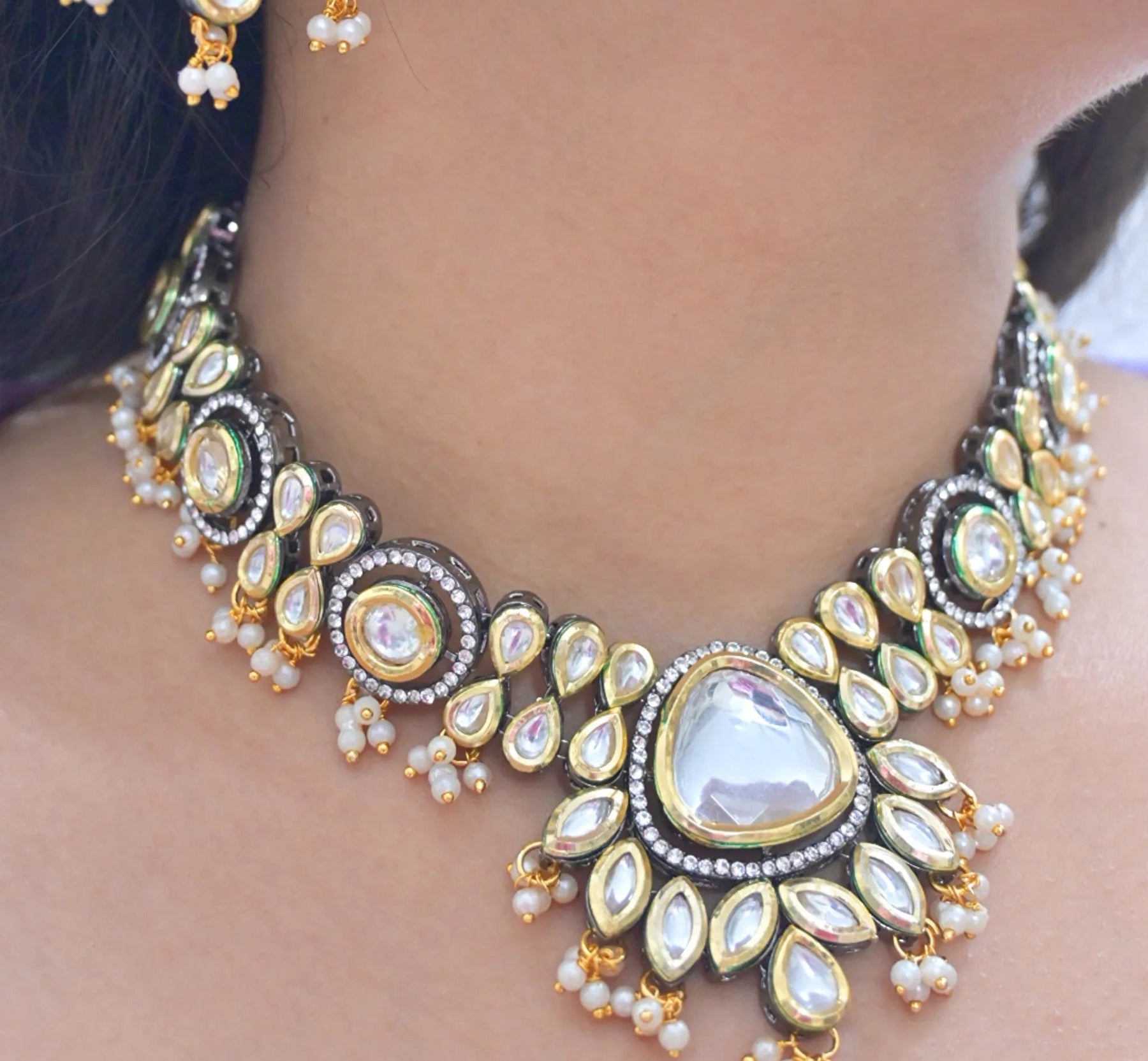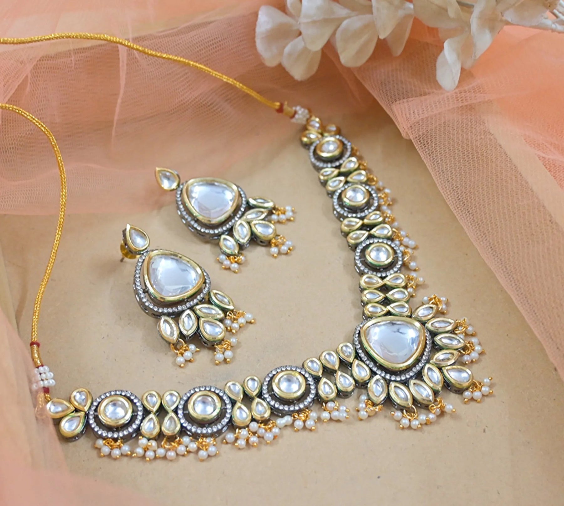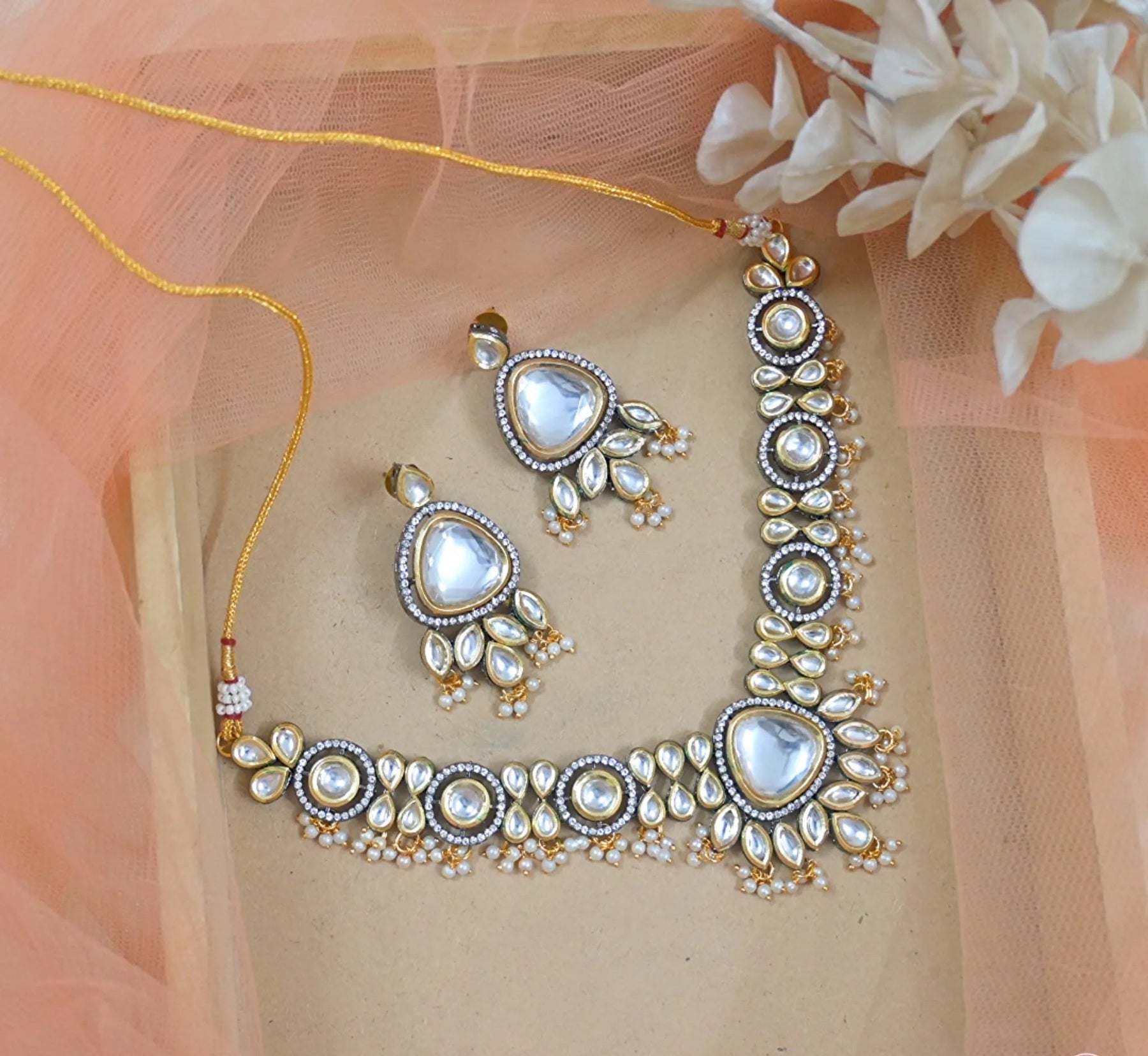 The Centerpiece Features A Statement Heart-Shaped Stone Surrounded By Petal-Like Kundan Arrangements, Creating A Royal Flower Motif. Small White Pearl Clusters Dance Along The Bottom Edge, Adding Movement And Grace To The Design. The Matching Earrings Mirror The Necklace'S Intricate Pattern With Oversized Teardrop Stones And Pearl Embellishments.