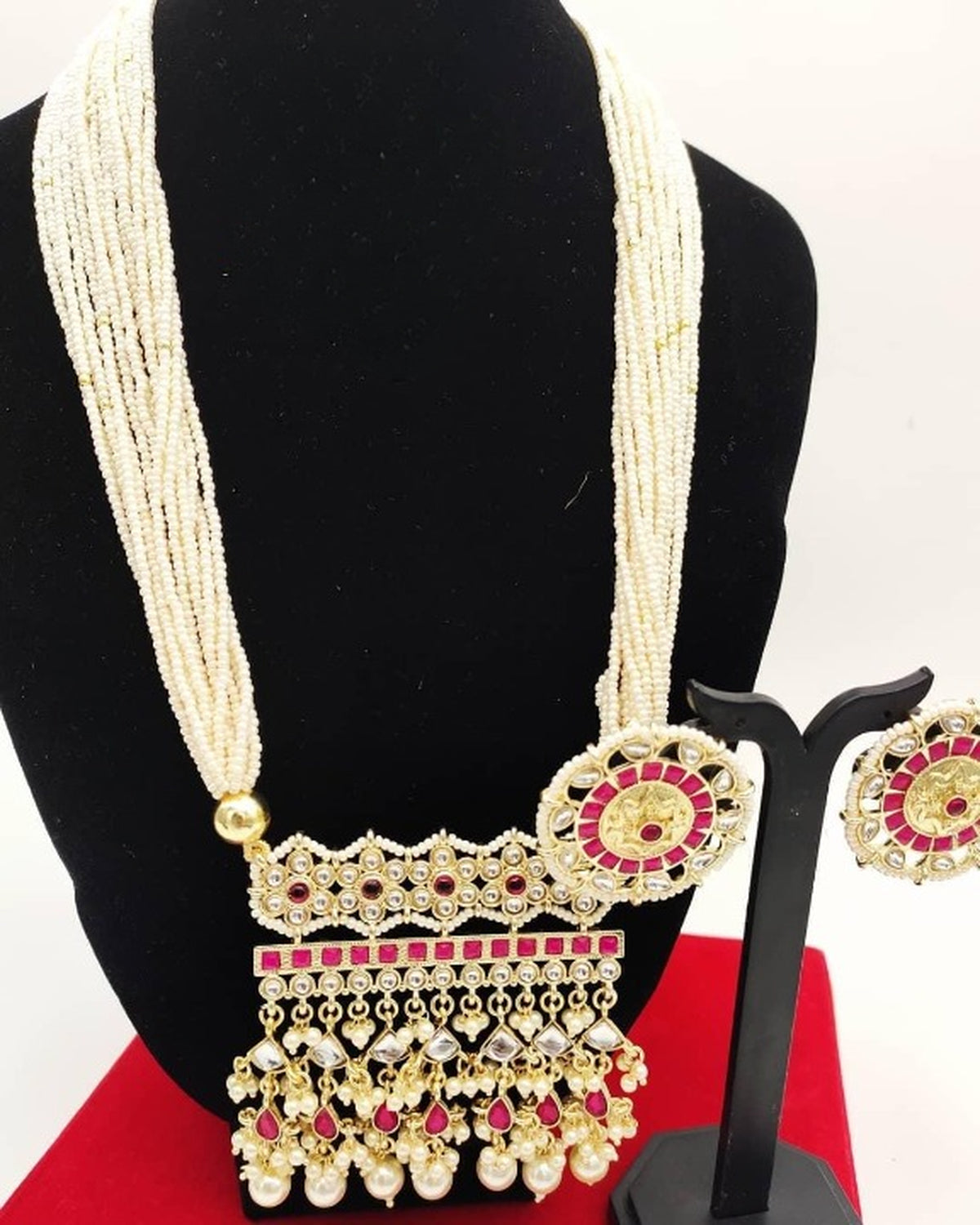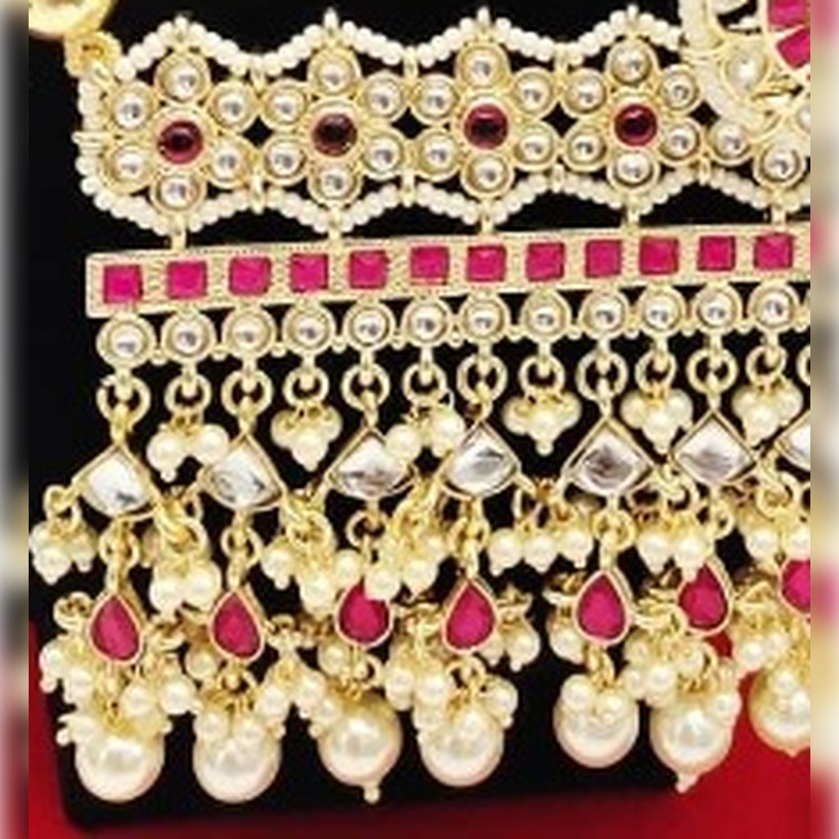 • Multiple Layers Of Dangling Elements Featuring Kundan Stones, Pearls, And Detailed Golden Accents