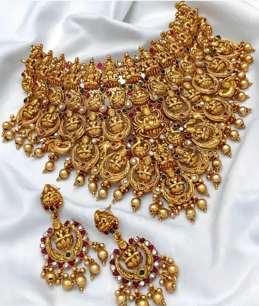 Make A Grand Statement With This Majestic South Indian-Style Temple Jewelry Set, Featuring A Heavily Embellished Goddess Lakshmi Choker Necklace Paired With Matching Jhumka Earrings. This Antique Gold-Plated Masterpiece Captures The Essence Of Tradition, Spirituality, And Royal Elegance.