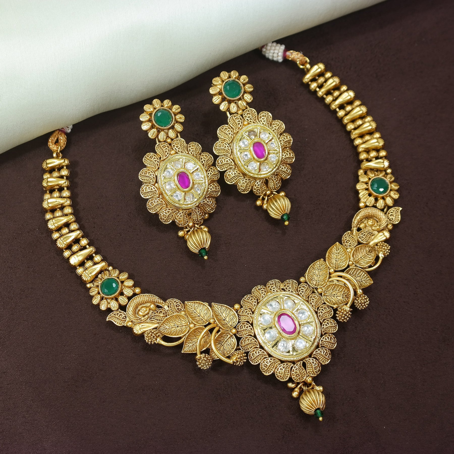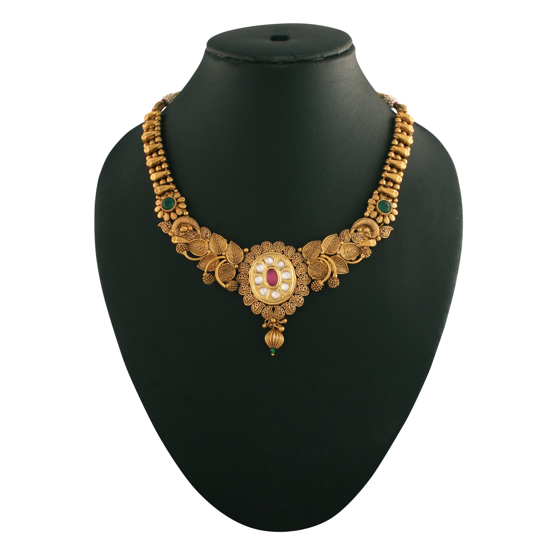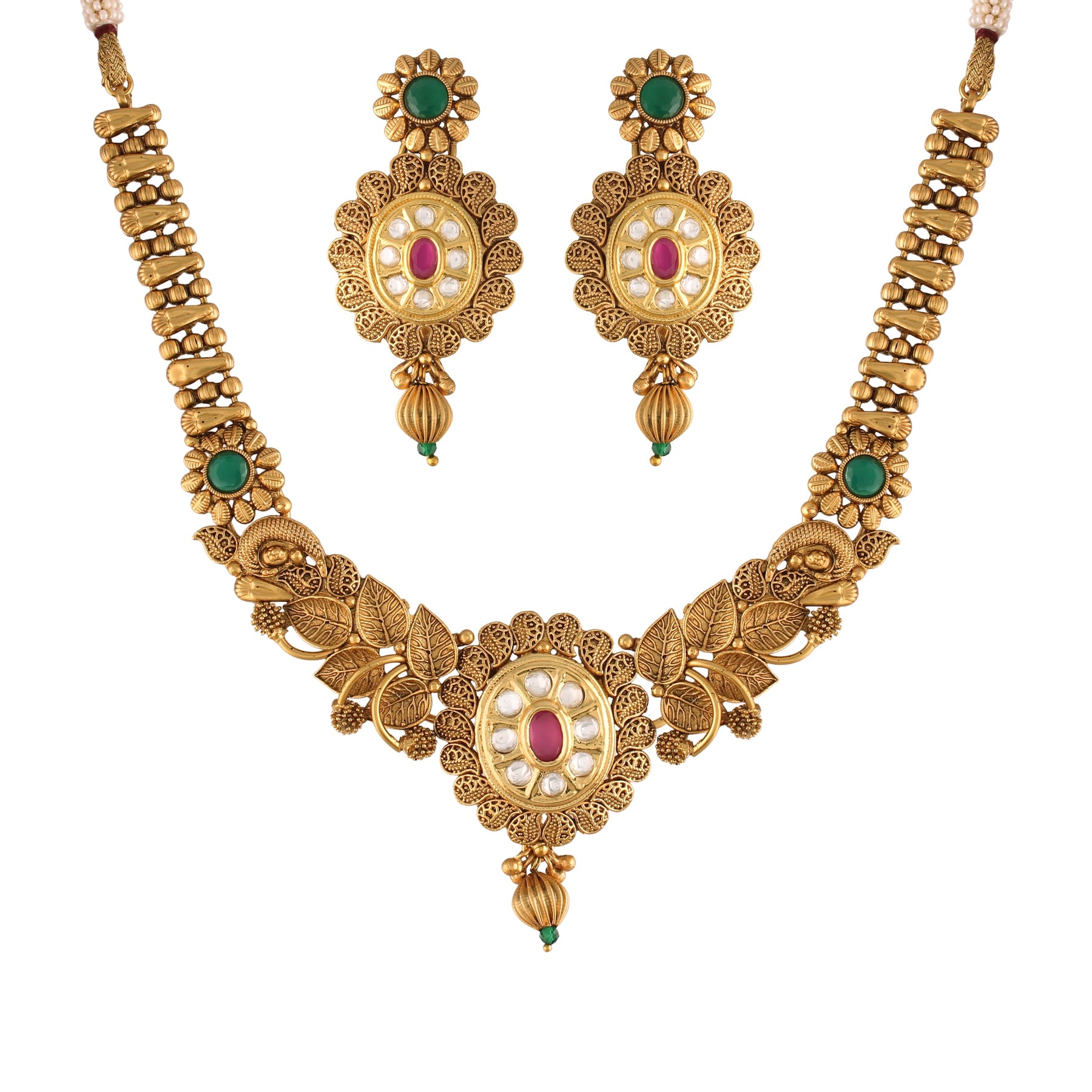 This Jewellery Set Is Crafted In Gold Plating And Consists Of A Necklace, And A Pair Of Earrings. The Necklace Feature Pearl-Studded In It And Is Secured With A Drawstring Closures. Style This Necklace Set With A Saree Or A Salwar Suit To Enhance The Look. This Jewelry Set Is A Great Option And A Perfect Pick For Your Wedding Functions. Be Assured To Find A Variety Of Contemporary And Traditional Designs In The Mesmerising Collection That We Offer.