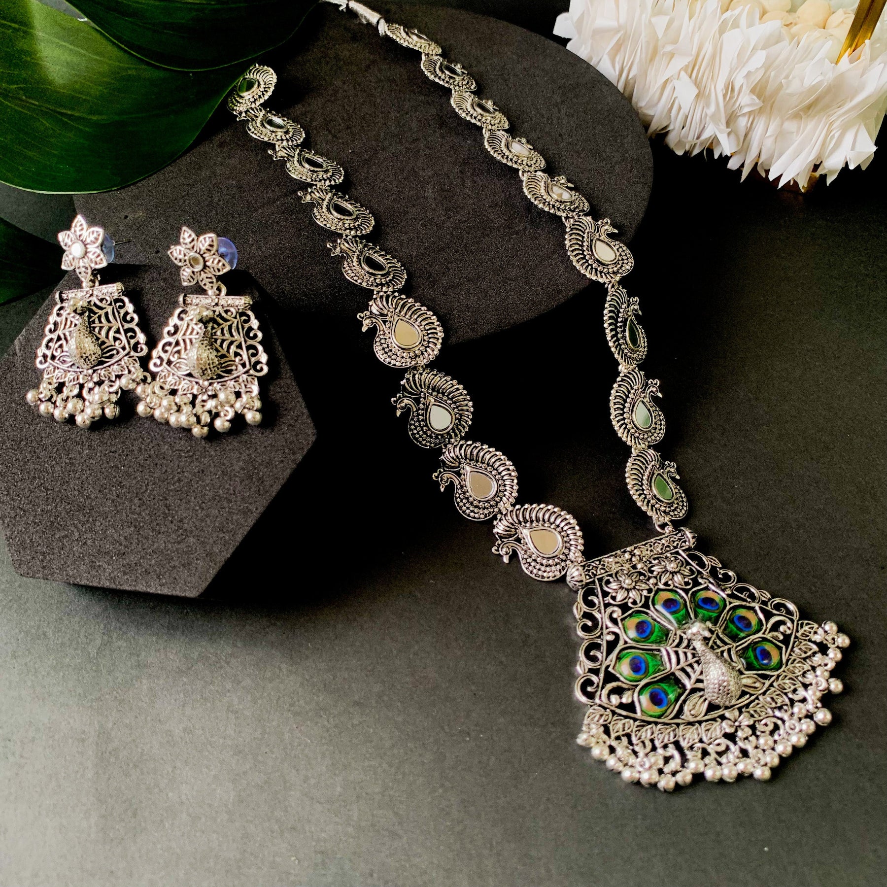 This Jewellery Set Is Crafted In Oxidized Silver Plating And Consists Of A Necklace, And A Pair Of Earrings. Style This Necklace Set With A Saree Or A Salwar Suit To Enhance The Look. This Jewelry Set Is A Great Option And A Perfect Pick For Your Wedding Functions. Be Assured To Find A Variety Of Contemporary And Traditional Designs In The Mesmerising Collection That We Offer. Oxidized Silver Jewellery Set Stylish Necklace Set For Women. This Casual Or Wedding Party Wear Oxidised Necklace Set For Women Is Made Of Fine Quality Material Which Looks Stylish And Goes Perfect With Any Attire. This Traditional Tribal Afghani Boho Choker Necklace Set For Women Is Perfectly Suited For Wedding Or Party Wear. Latest Statement Haram Necklace Jewellery, Traditional Necklace Set, South Indian Type Lakshmi Temple Pendant Set And Other Jewellery Accessories Which Includes Fancy Bangles For Women, Wedding Bangles, Ear Cuffs, Traditional Bangles Kada, Neck Choker, Fashion Party Wear Necklace For Girls And Jhumki Jhumka Earrings.