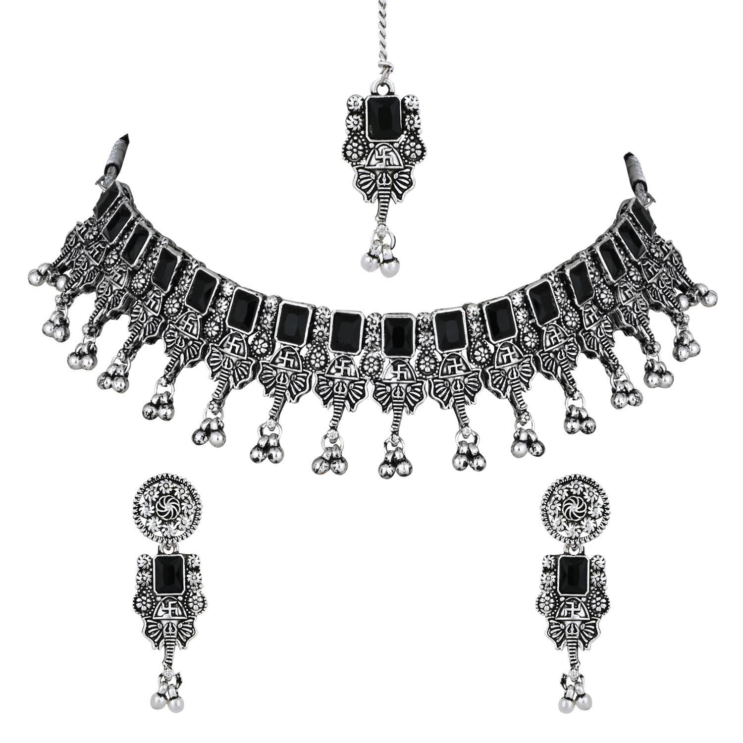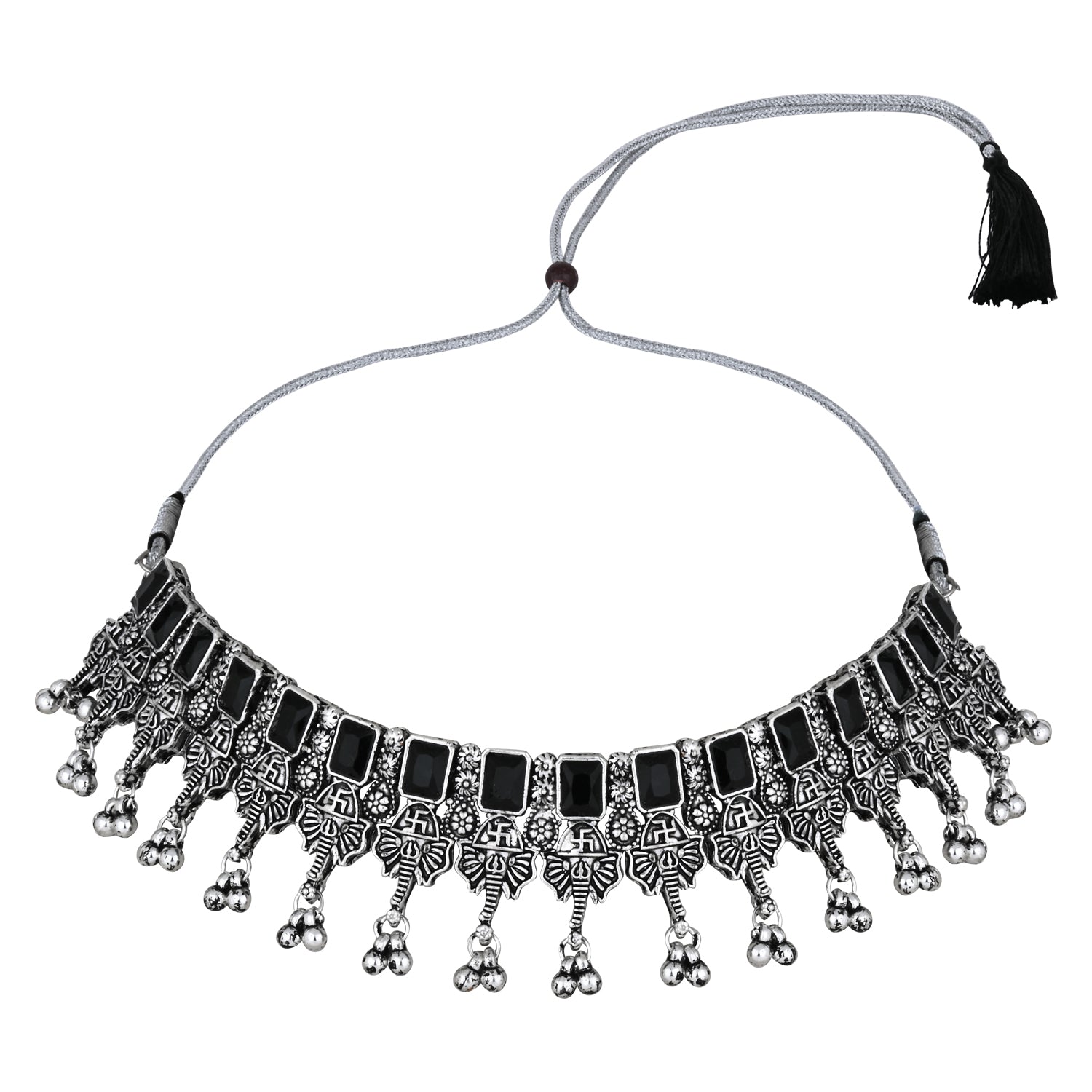 The Silver Oxidised Choker Necklace Set Consists Of A Necklace And A Pair Of Earrings, This Stunning Necklace Set Embodies The Beauty Of The Ages, With Its Oxidized Metal Finish That Gives It A Sense Of Timeless Elegance. The Intricately Designed Pendant Tell A Story Of Craftsmanship And Artistry, While The Long Chain Drapes Gracefully, Adding A Touch Of Sophistication To Any Outfit The Dark, Antiqued Finish Of The Metal Adds A Touch Of Mystique, Echoing The Aura Of The Festival'S Traditional Rituals.. Paired With Matching Earrings, This Set Is A Masterpiece That Transcends Trends, Making You The Center Of Attention Wherever You Go.The Long Chain Adds A Contemporary Twist To The Set, While The Earrings Capture The Same Adventurous Essence. Wear This Set As A Testament To Your Adventurous Soul And Your Ability To Find Beauty In Every Corner Of The World.