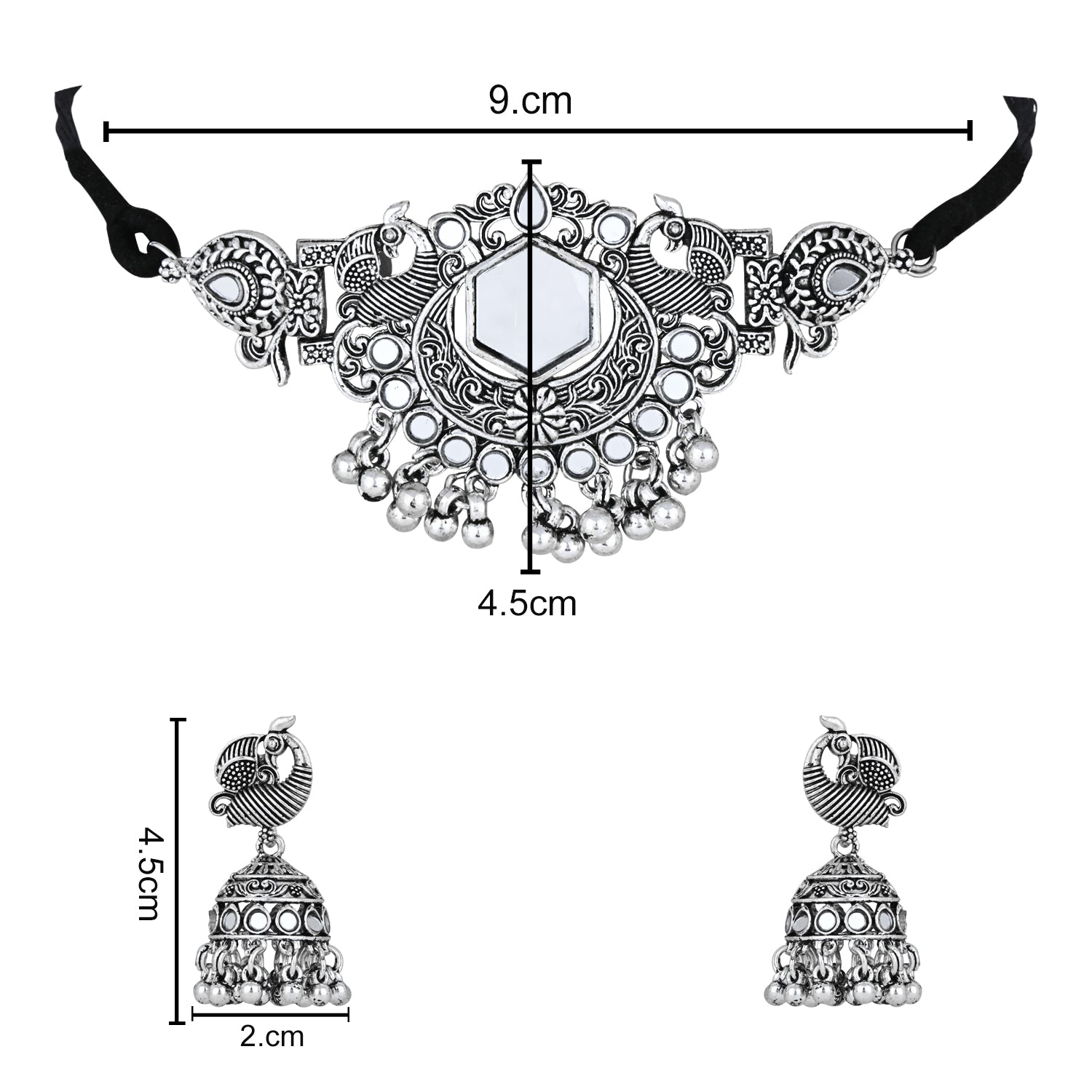 The Silver Oxidised Choker Necklace Set Consists Of A Necklace And A Pair Of Earrings, This Stunning Necklace Set Embodies The Beauty Of The Ages, With Its Oxidized Metal Finish That Gives It A Sense Of Timeless Elegance. The Intricately Designed Pendant Tell A Story Of Craftsmanship And Artistry, While The Long Chain Drapes Gracefully, Adding A Touch Of Sophistication To Any Outfit The Dark, Antiqued Finish Of The Metal Adds A Touch Of Mystique, Echoing The Aura Of The Festival'S Traditional Rituals.. Paired With Matching Earrings, This Set Is A Masterpiece That Transcends Trends, Making You The Center Of Attention Wherever You Go.The Long Chain Adds A Contemporary Twist To The Set, While The Earrings Capture The Same Adventurous Essence. Wear This Set As A Testament To Your Adventurous Soul And Your Ability To Find Beauty In Every Corner Of The World.