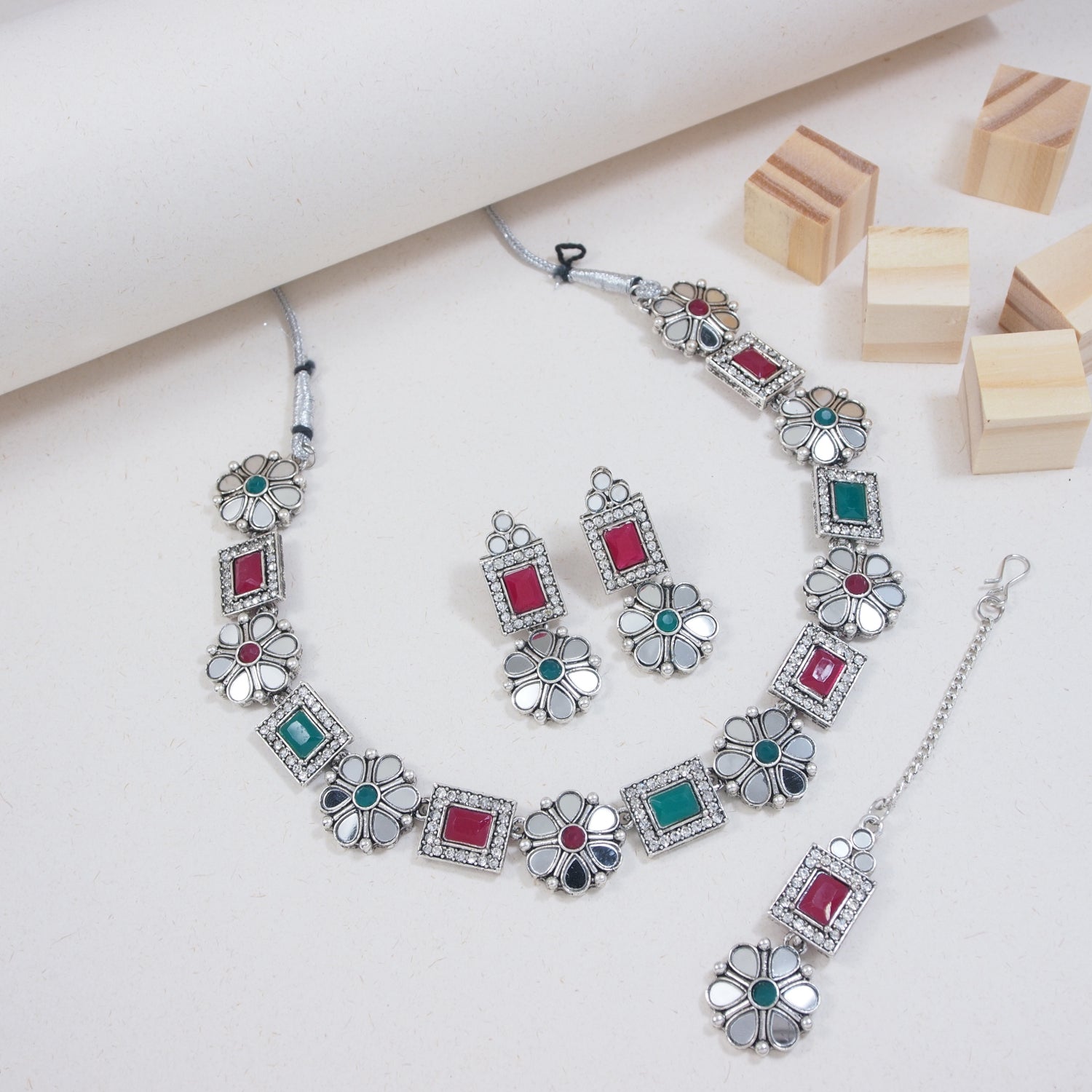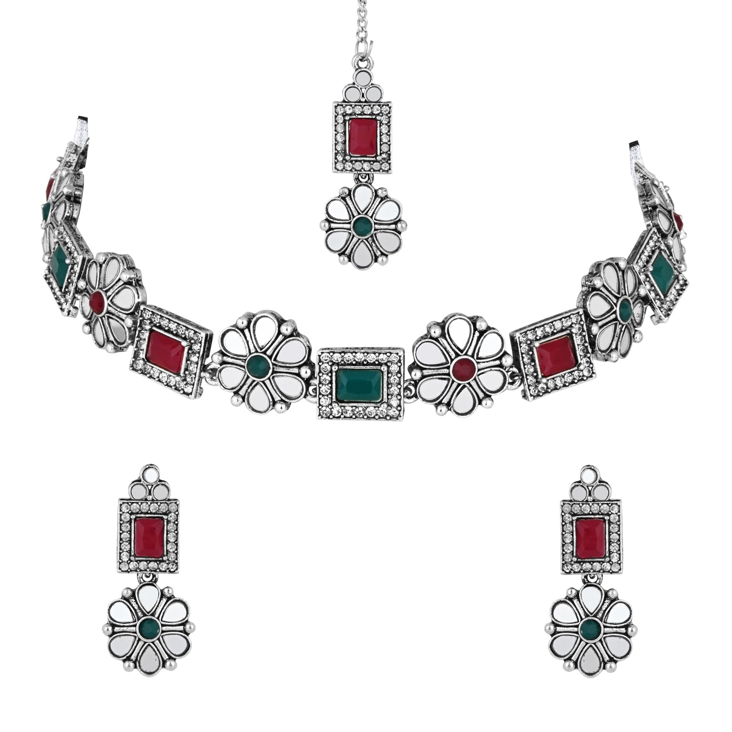 The Silver Oxidised Choker Necklace Set Consists Of A Necklace And A Pair Of Earrings, This Stunning Necklace Set Embodies The Beauty Of The Ages, With Its Oxidized Metal Finish That Gives It A Sense Of Timeless Elegance. The Intricately Designed Pendant Tell A Story Of Craftsmanship And Artistry, While The Long Chain Drapes Gracefully, Adding A Touch Of Sophistication To Any Outfit The Dark, Antiqued Finish Of The Metal Adds A Touch Of Mystique, Echoing The Aura Of The Festival'S Traditional Rituals.. Paired With Matching Earrings, This Set Is A Masterpiece That Transcends Trends, Making You The Center Of Attention Wherever You Go.The Long Chain Adds A Contemporary Twist To The Set, While The Earrings Capture The Same Adventurous Essence. Wear This Set As A Testament To Your Adventurous Soul And Your Ability To Find Beauty In Every Corner Of The World.
