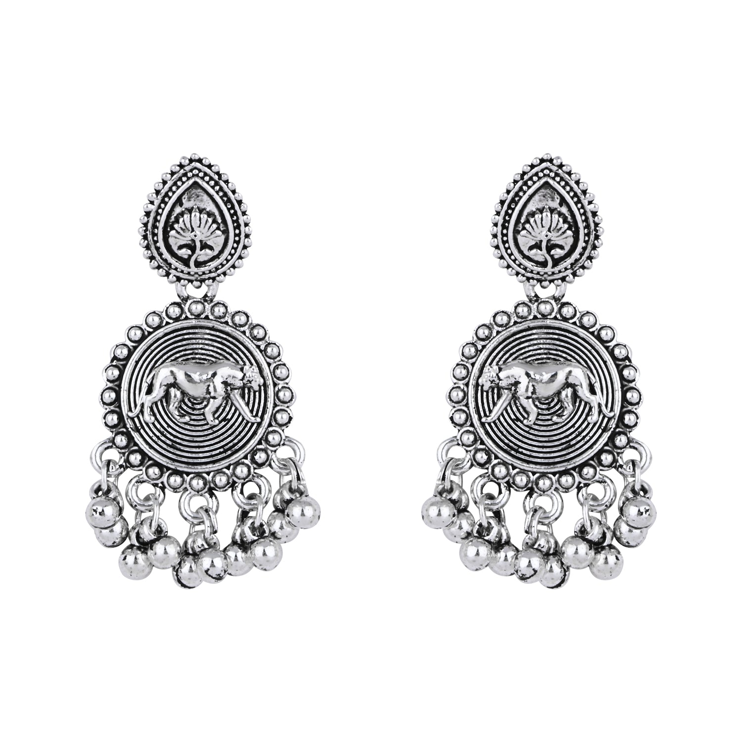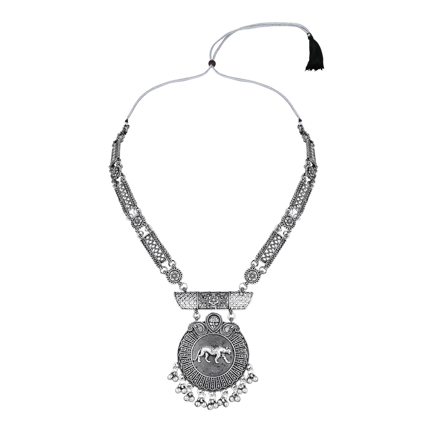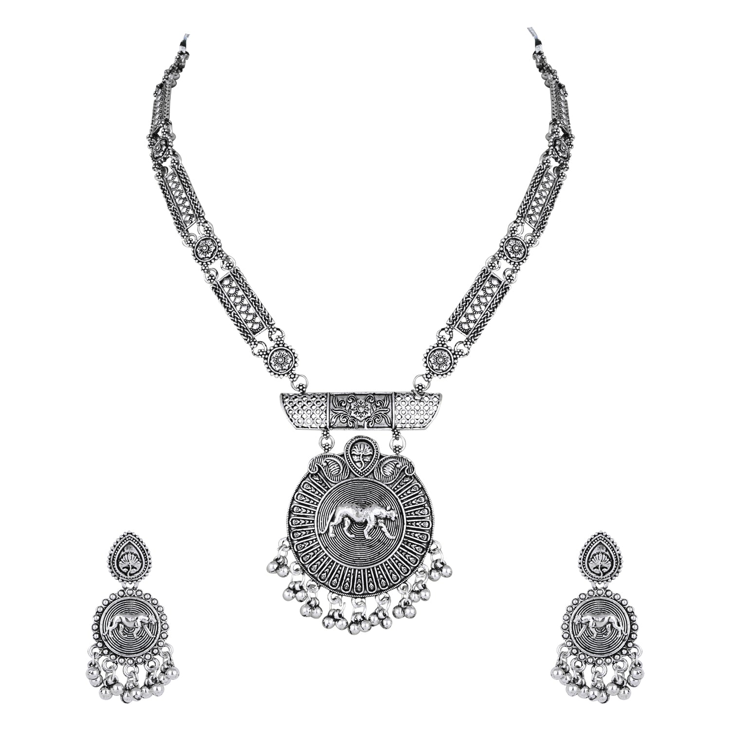 The Silver Oxidised Choker Necklace Set Consists Of A Necklace And A Pair Of Earrings, This Stunning Necklace Set Embodies The Beauty Of The Ages, With Its Oxidized Metal Finish That Gives It A Sense Of Timeless Elegance. The Intricately Designed Pendant Tell A Story Of Craftsmanship And Artistry, While The Long Chain Drapes Gracefully, Adding A Touch Of Sophistication To Any Outfit The Dark, Antiqued Finish Of The Metal Adds A Touch Of Mystique, Echoing The Aura Of The Festival'S Traditional Rituals.. Paired With Matching Earrings, This Set Is A Masterpiece That Transcends Trends, Making You The Center Of Attention Wherever You Go.The Long Chain Adds A Contemporary Twist To The Set, While The Earrings Capture The Same Adventurous Essence. Wear This Set As A Testament To Your Adventurous Soul And Your Ability To Find Beauty In Every Corner Of The World.