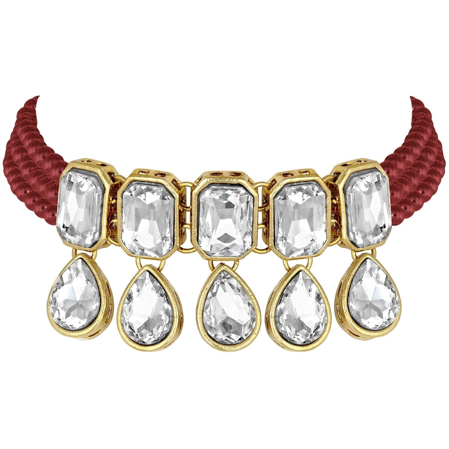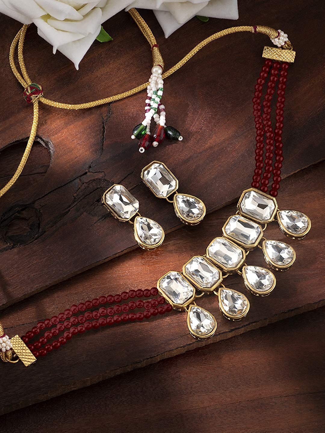 This jewellery set is crafted in 18K gold plating and consists of a choker and a pair of earrings. The choker necklace feature beads & stone-studded in it and is secured with a drawstring closures. Style this necklace set with a saree or a salwar suit to enhance the look.